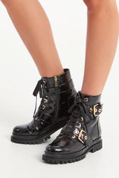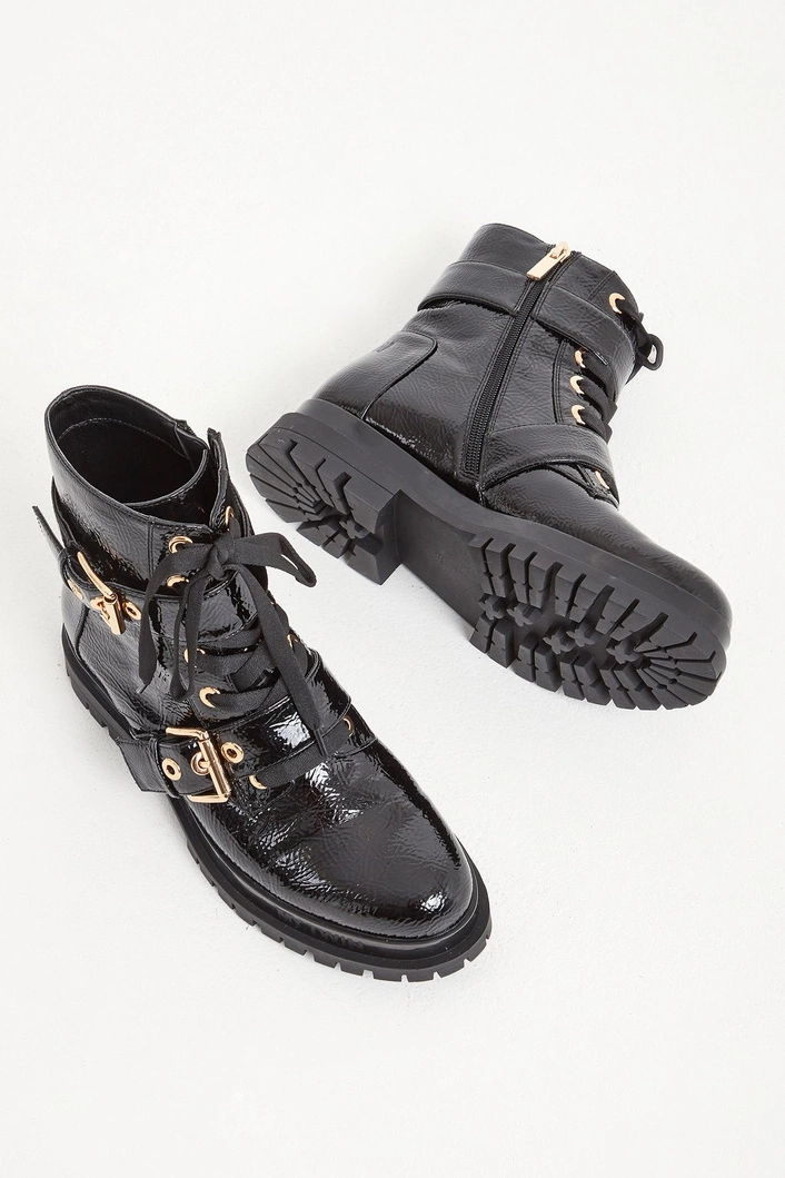 Stylowe trapery w czarnym kolorze. Na całości lakierowane z efektem gniecenia. Wiązane na sznurówki, po bokach zapinane na zamek. U góry oraz u dołu ozdobne klamry ze złotymi elementami. Wewnątrz wkładka ze skóry naturalnej. Trapery wykonane z wysokogatunkowych materiałów. Niezwykle stylowe i efektowne, w rockowym stylu. Wysokość podeszwy wynosi około 3,5 cm.