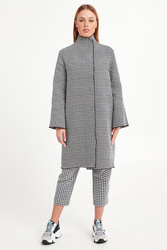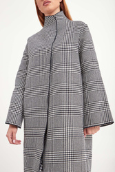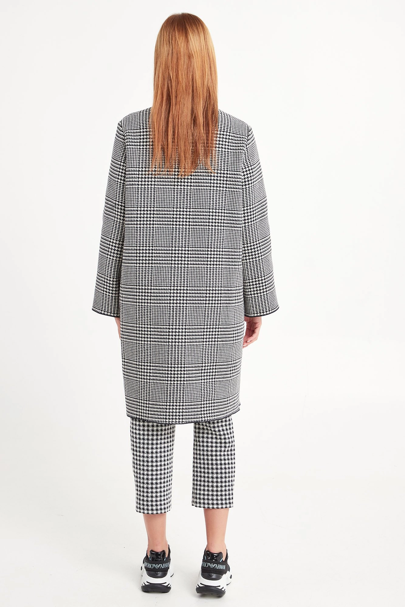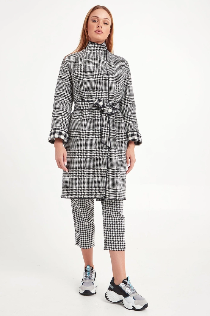 Stylowy płaszcz w kolorze czarno-białym o luźniejszym fasonie. Zapinany na kryte napy. Na całości wzór w pepitkę. Wiązany w talii za pomocą dwustronnego paska. Możliwość wywinięcia kołnierza. Wewnątrz inny typ kratki. Rękawy wykończone podwinięciem. Płaszcz wykonany z najwyższej jakości materiału z wełną. Nadzwyczaj ciepły i komfortowy z ponadczasowym wzorem.