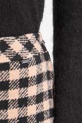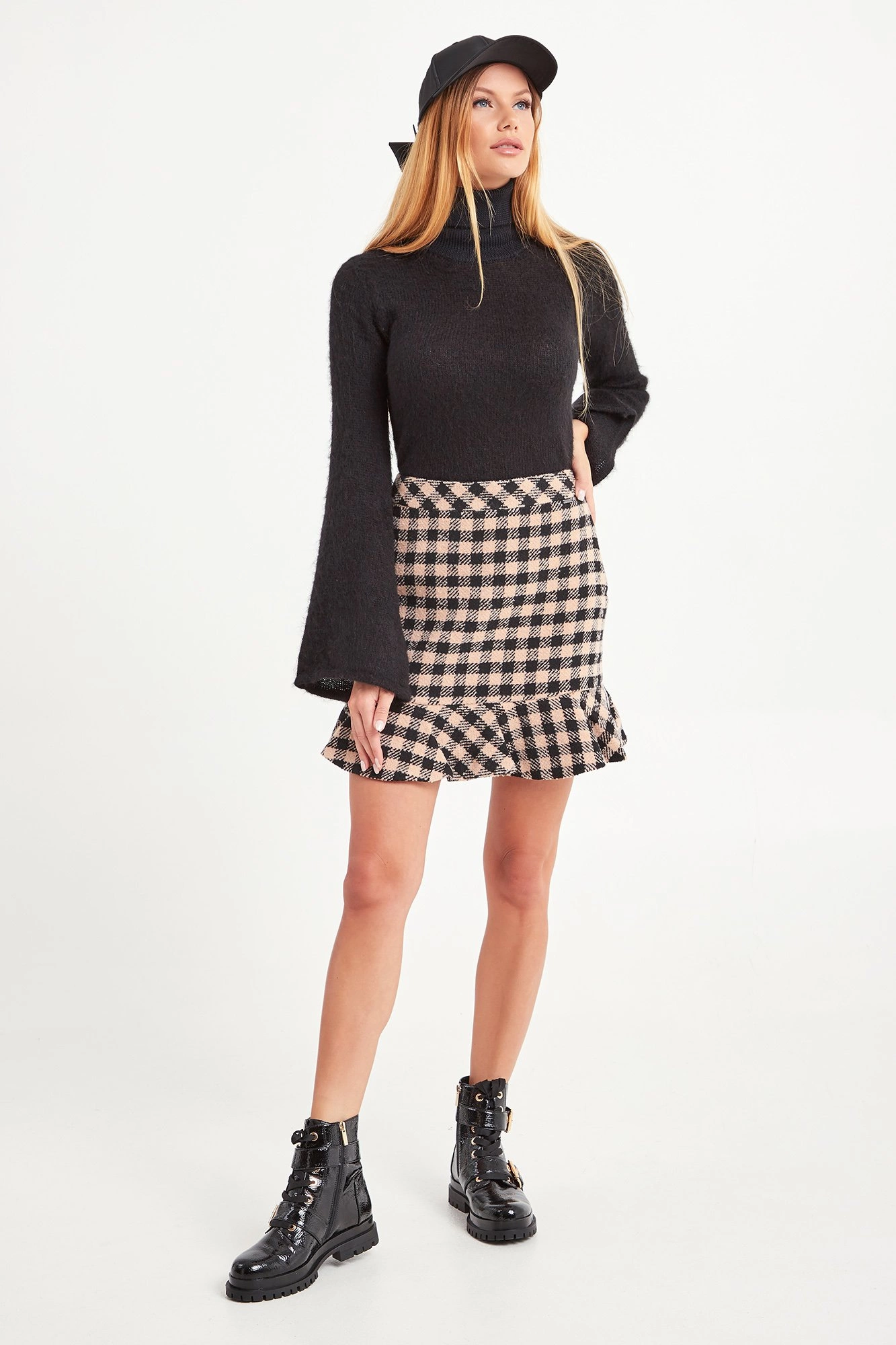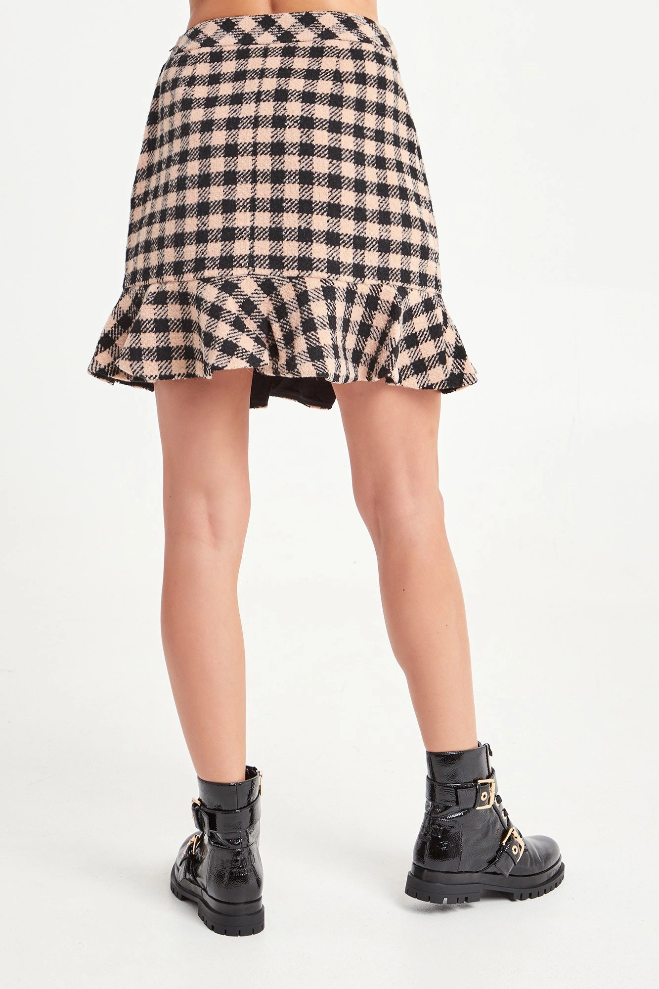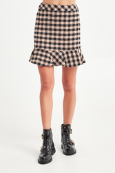 Elegancka spódnica w beżowo - czarną kratę. Zapinana na zamek. W pasie niewielka, logowana blaszka. Dół wykończony falbaną. Długość mini. Spódnica wykonana z najwyższej jakości materiału. Szykowna i efektowna.