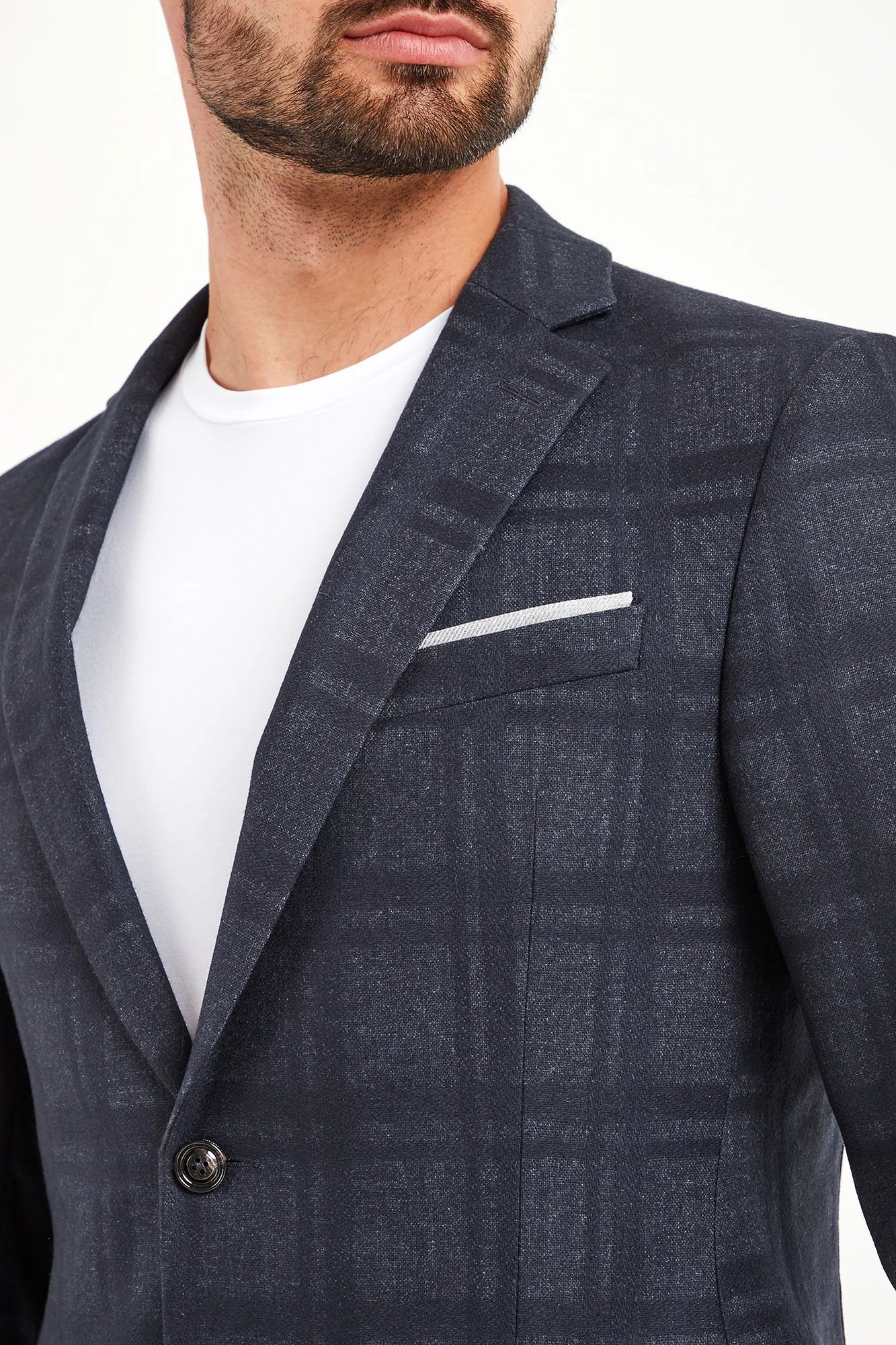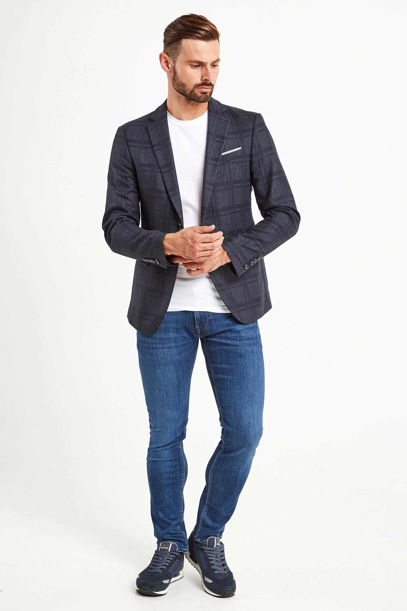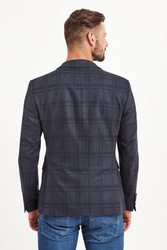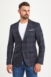 Stylowa marynarka w kolorze granatowym z nieco ciemniejszą kratką na całości. Klapy otwarte. Obok brustasza z wszytą poszetką w kolorze białym. Niżej dwie kieszenie z patkami. Z tyłu podwójne rozcięcie. Przy mankietach guziki. Podszewka wiskozowa w kolorze szarym we wzór nazwy marki. Wewnątrz dwie kieszenie. Marynarka wykonana z najwyższej jakości materiału z żywą wełną. Idealny dodatek do wielu stylizacji w klasycznym stylu.
