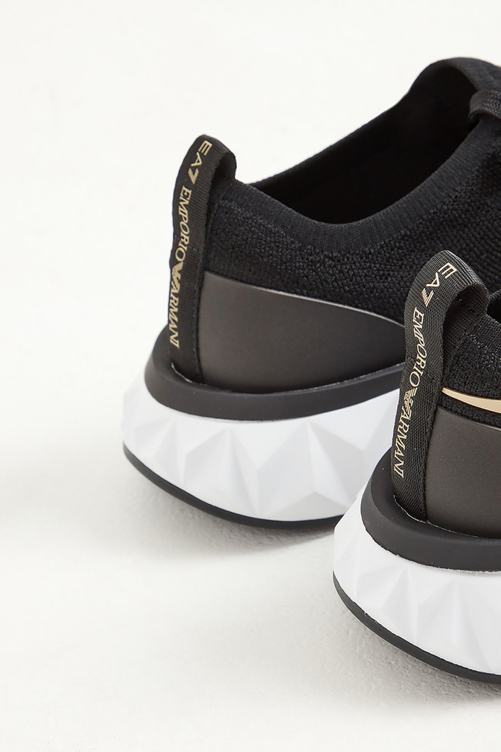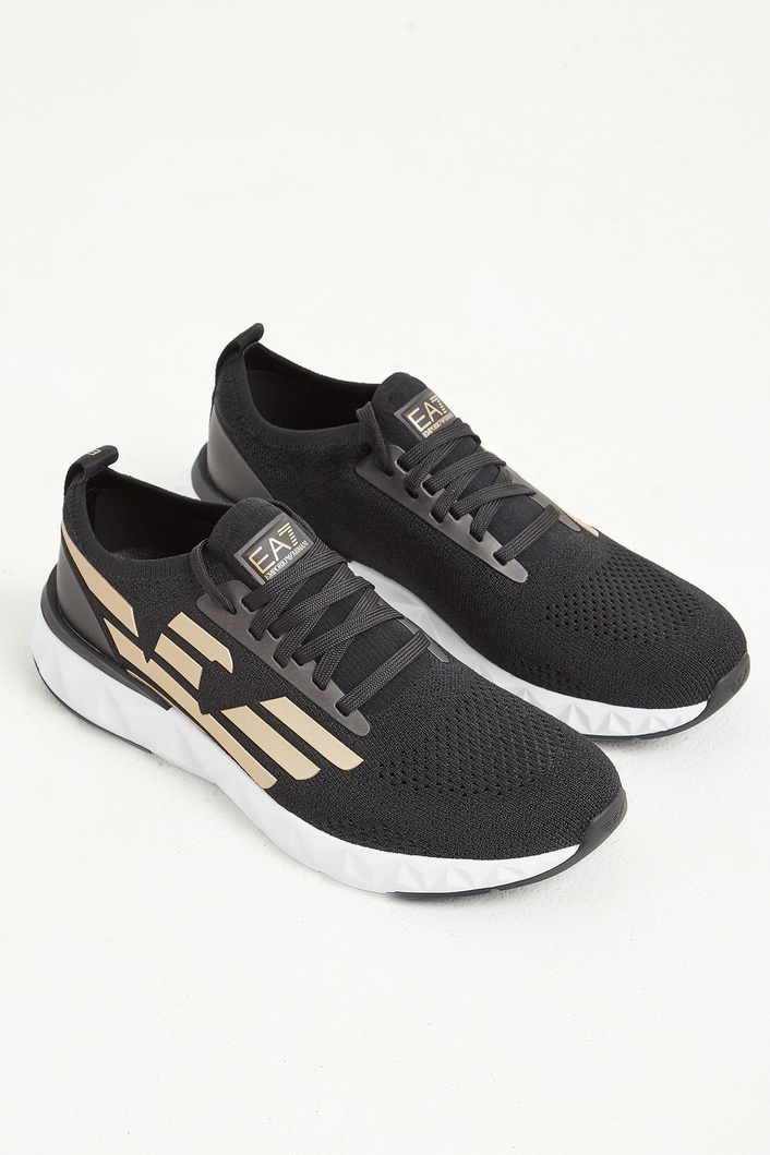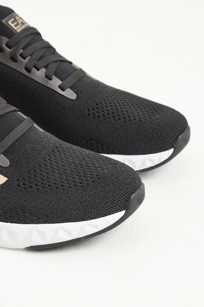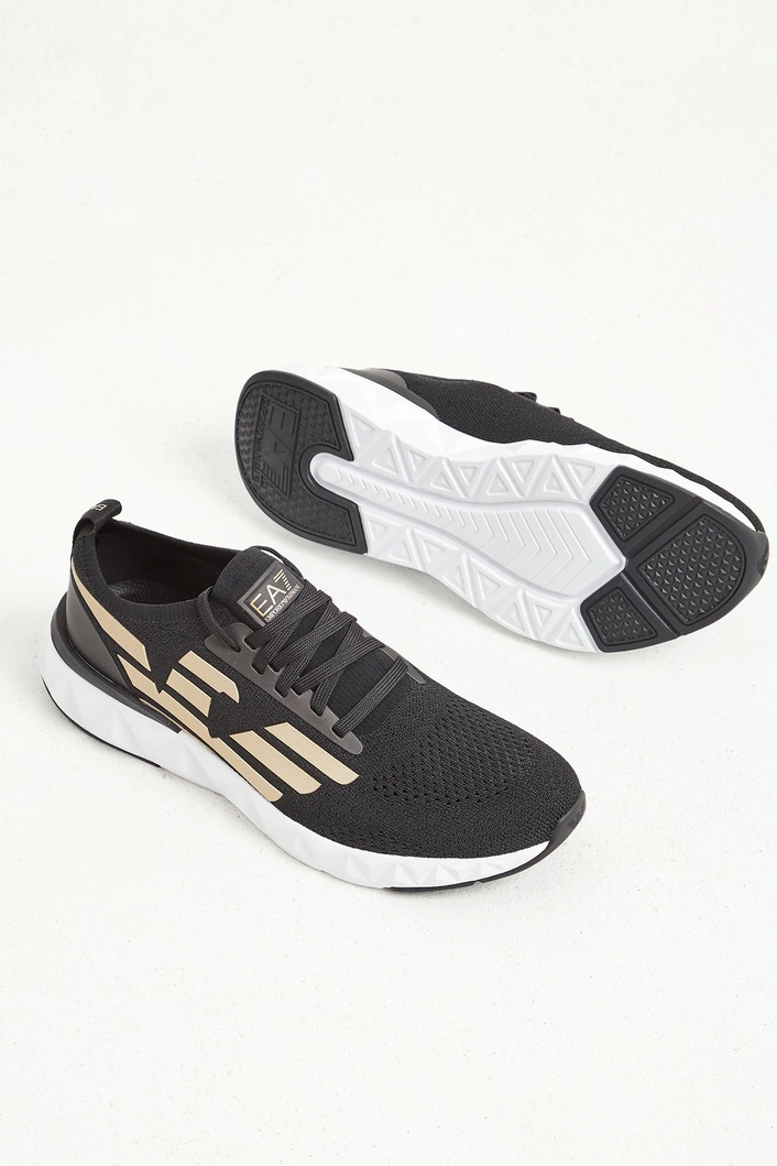 Komfortowe sneakersy w czarnym kolorze. Wiązane na czarne sznurówki. Z boku duże, złote logo marki. Na języku niewielka aplikacja z logo i nazwą. Na zapiętku wstawka z lekko połyskującego tworzywa i logowany pasek. Geometryczna podeszwa w białym kolorze o wysokości max. 5 cm. Sneakersy wykonane z najwyższej jakości, niezwykle przewiewnego materiału. Lekkie i ponadczasowe.