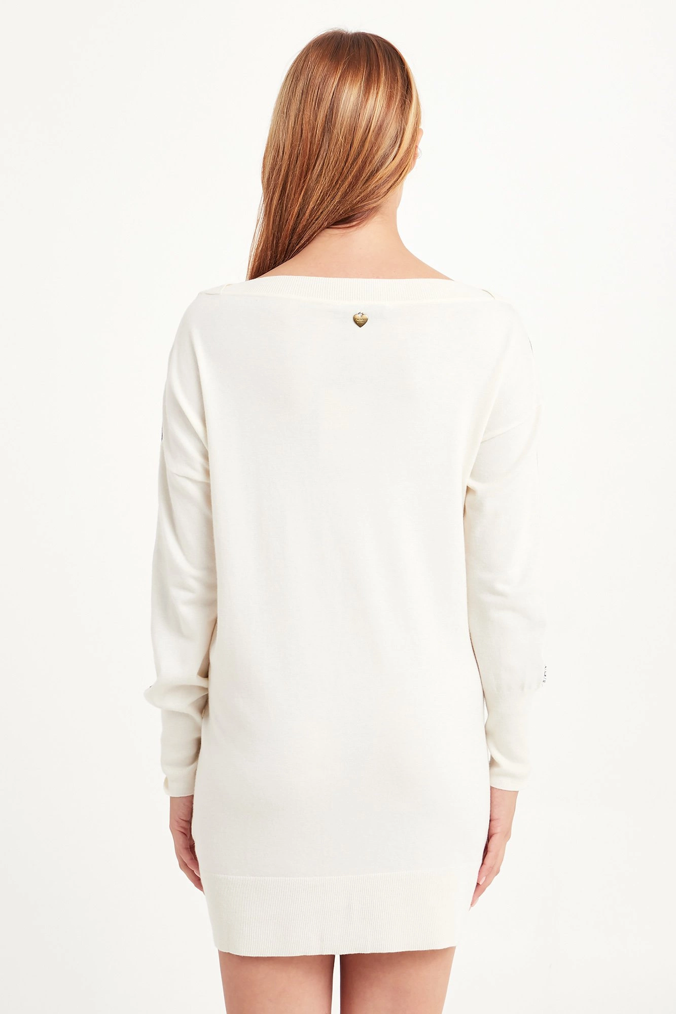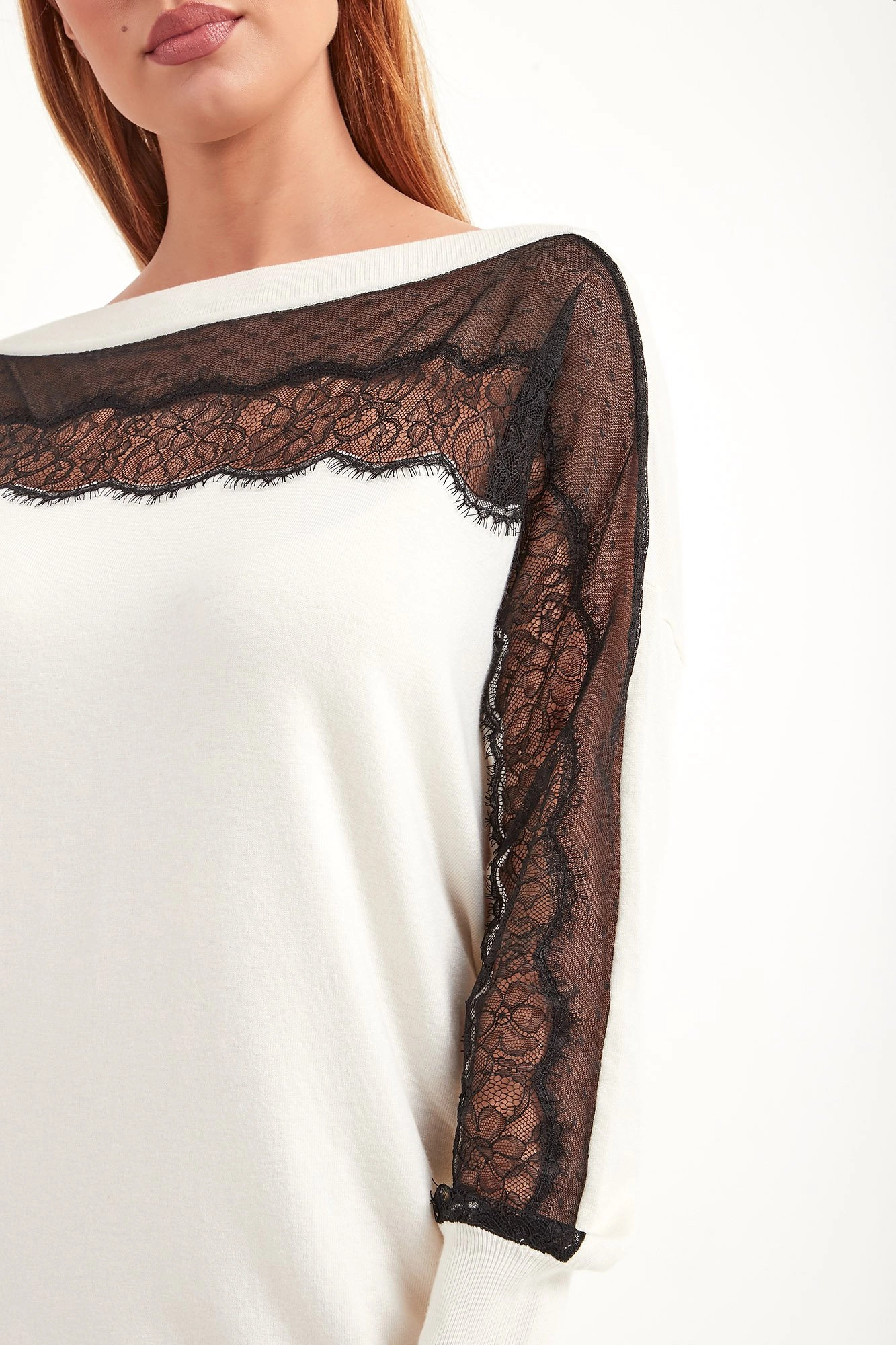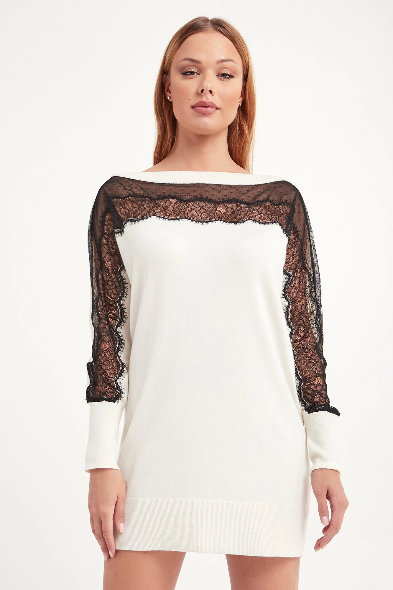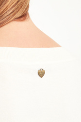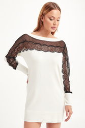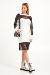 Dzianinowa sukienka w kremowym kolorze. Dekolt wykończony ściągaczem. Z przodu i na rękawach dekoracyjna czarna koronka. Z tyłu, na wysokości karku złote, logowane serce. Długość mini. Sukienka wykonana z najwyższej jakości niezwykle miękkiego w dotyku materiału. Bardzo kobieca i stylowa.