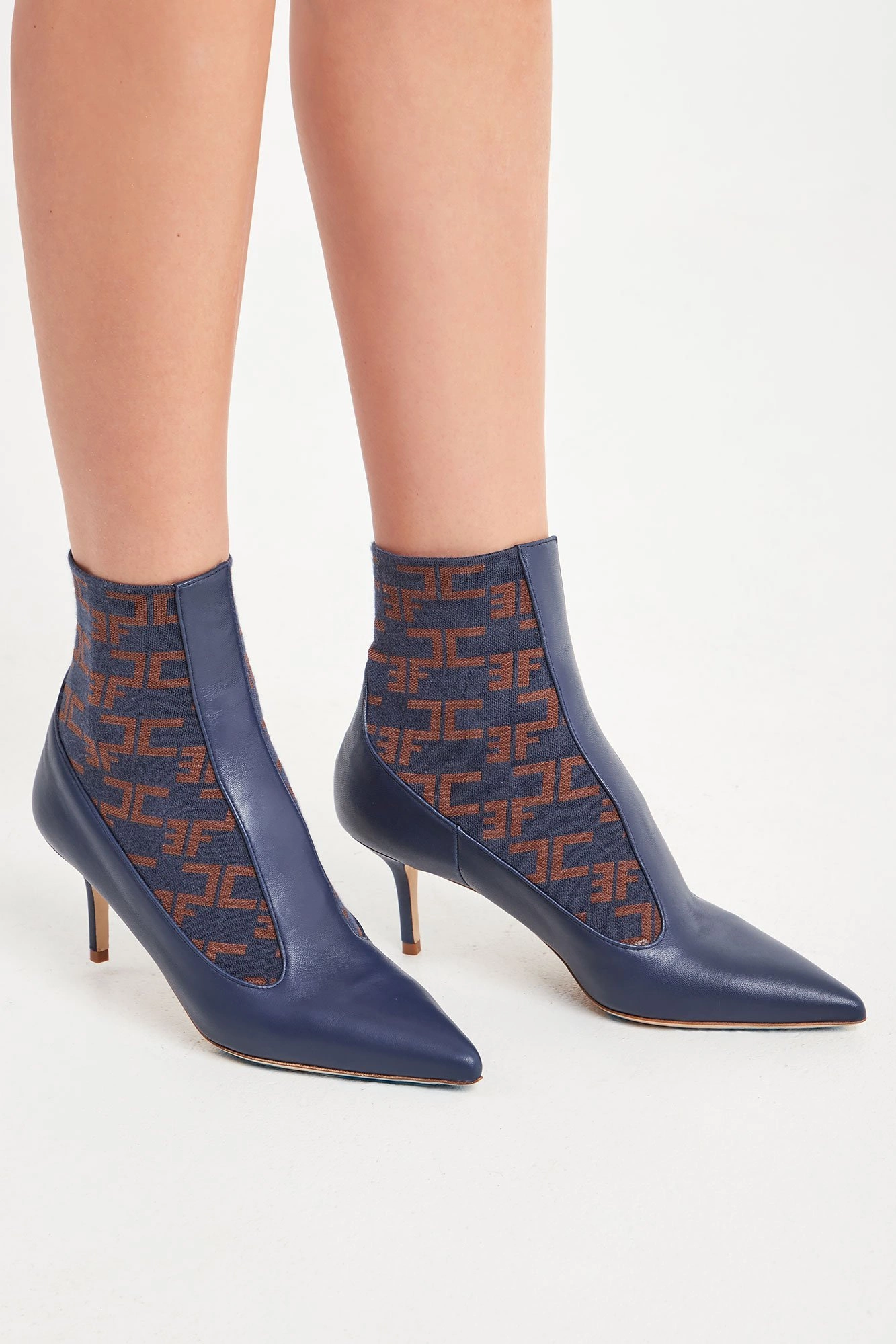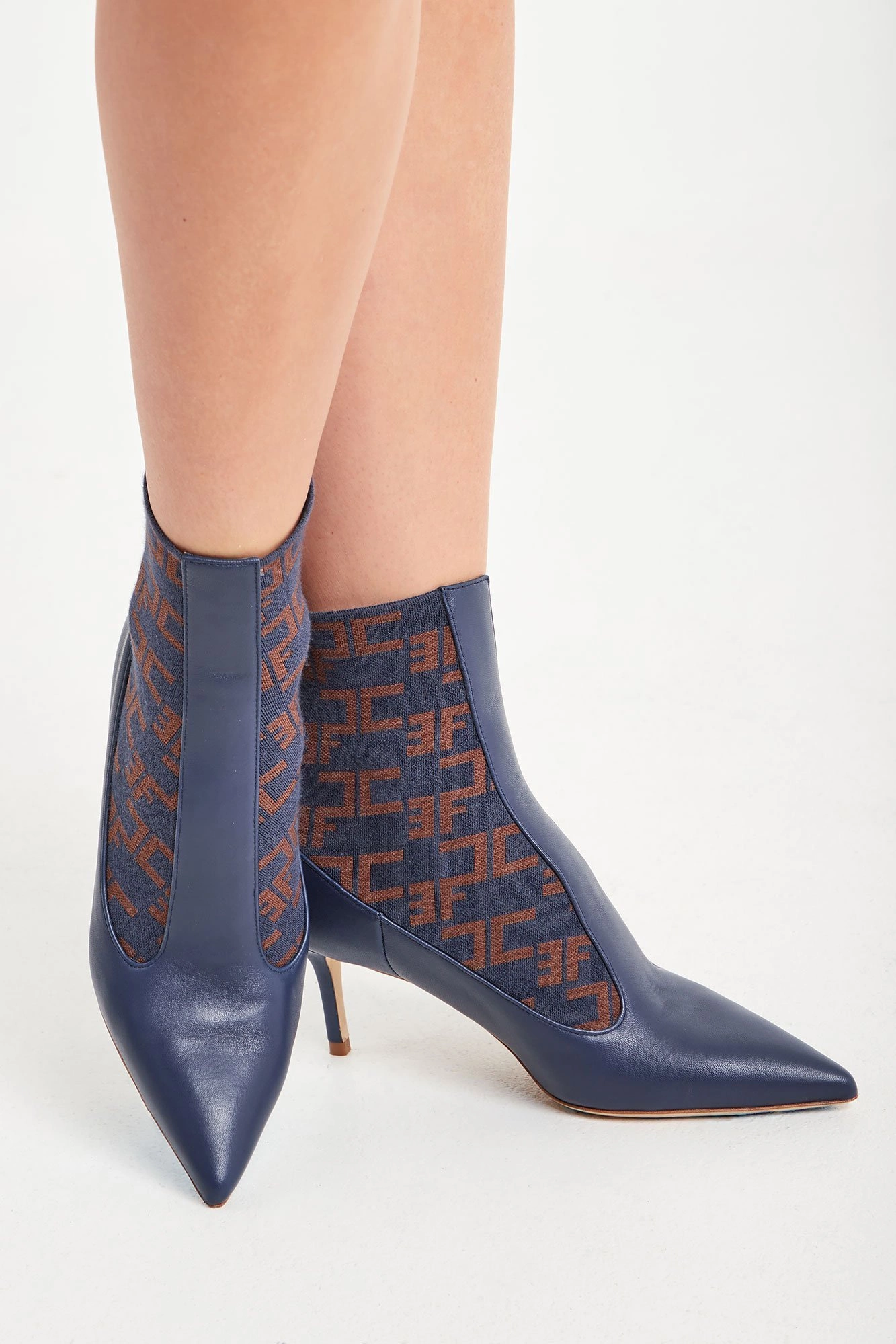 Eleganckie botki w granatowym kolorze. Po bokach granatowo-brązowe wstawki z logo marki. Nosek w szpic. Obcas o wysokości ok. 7 cm. Botki wykonane z najwyższej jakości skóry naturalnej i wysokogatunkowego materiału. Efektowne i szykowne.