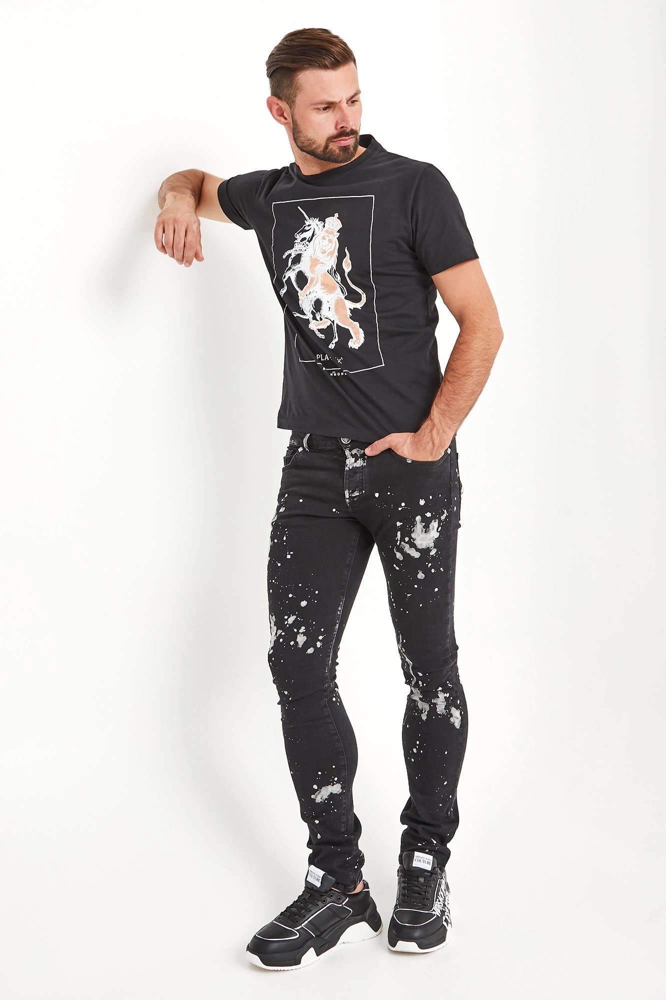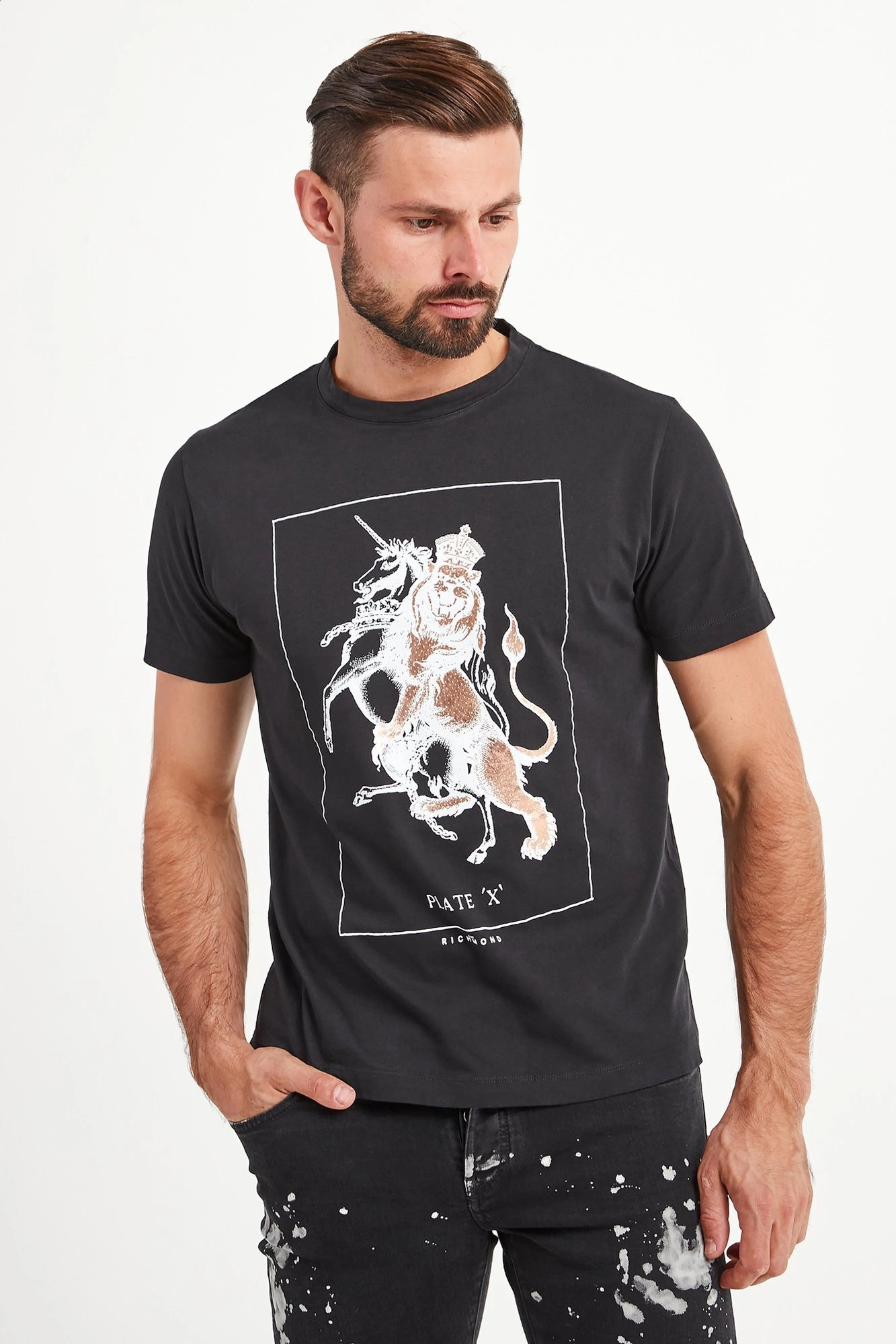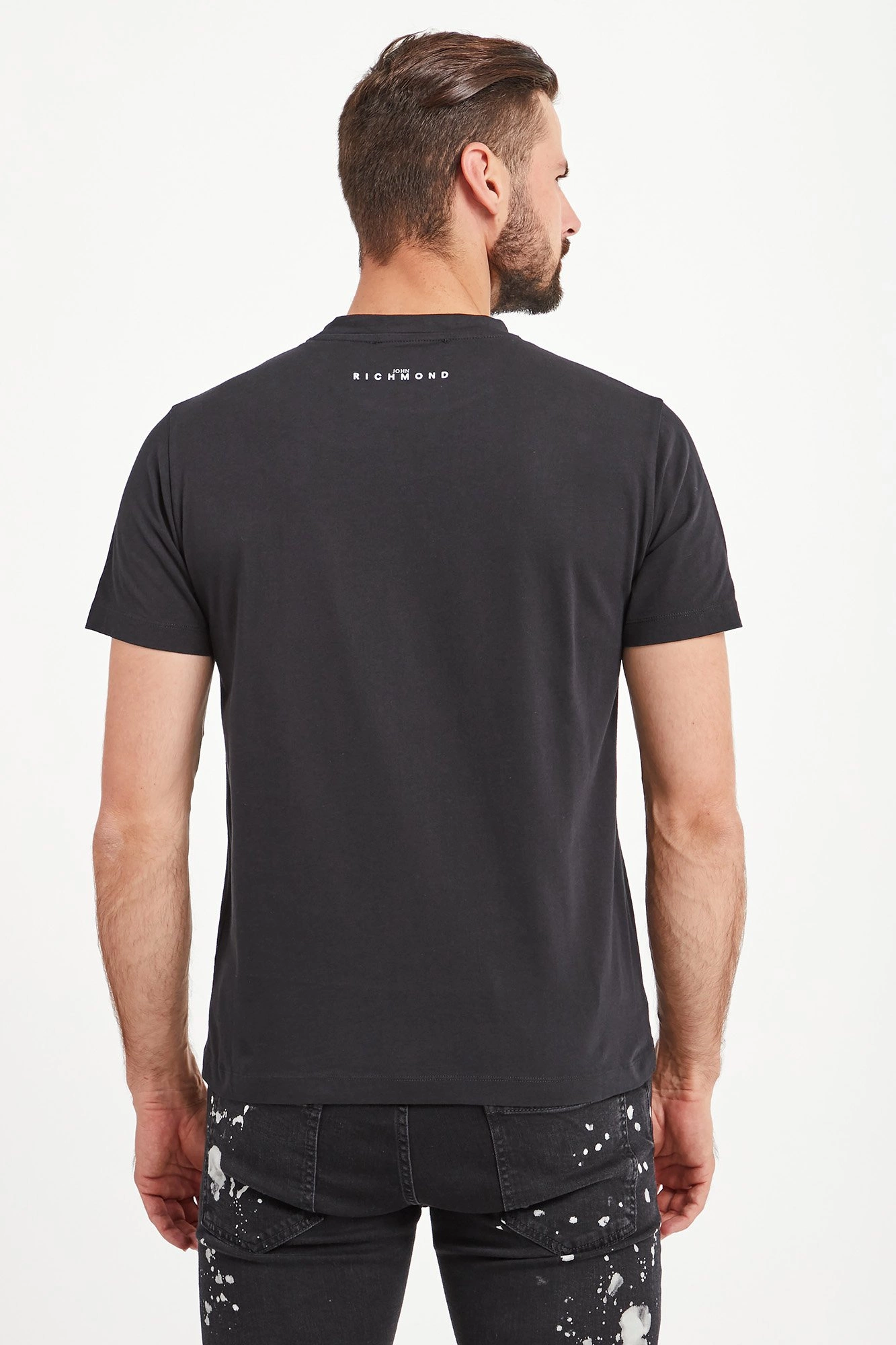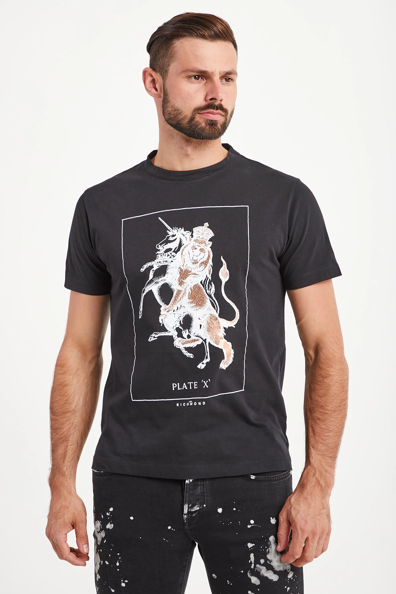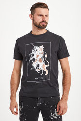 T-shirt w czarnym kolorze o prostym fasonie. Dekolt typu o-neck wykończony ściągaczem. Z przodu logowany, biały nadruk połyskujący na złoto. Z tyłu niewielki napis z nazwą marki. T-shirt wykonany z wysokiej jakości bawełny. Przyjemny w dotyku. Idealny jako oryginalna baza casualowych stylizacji.