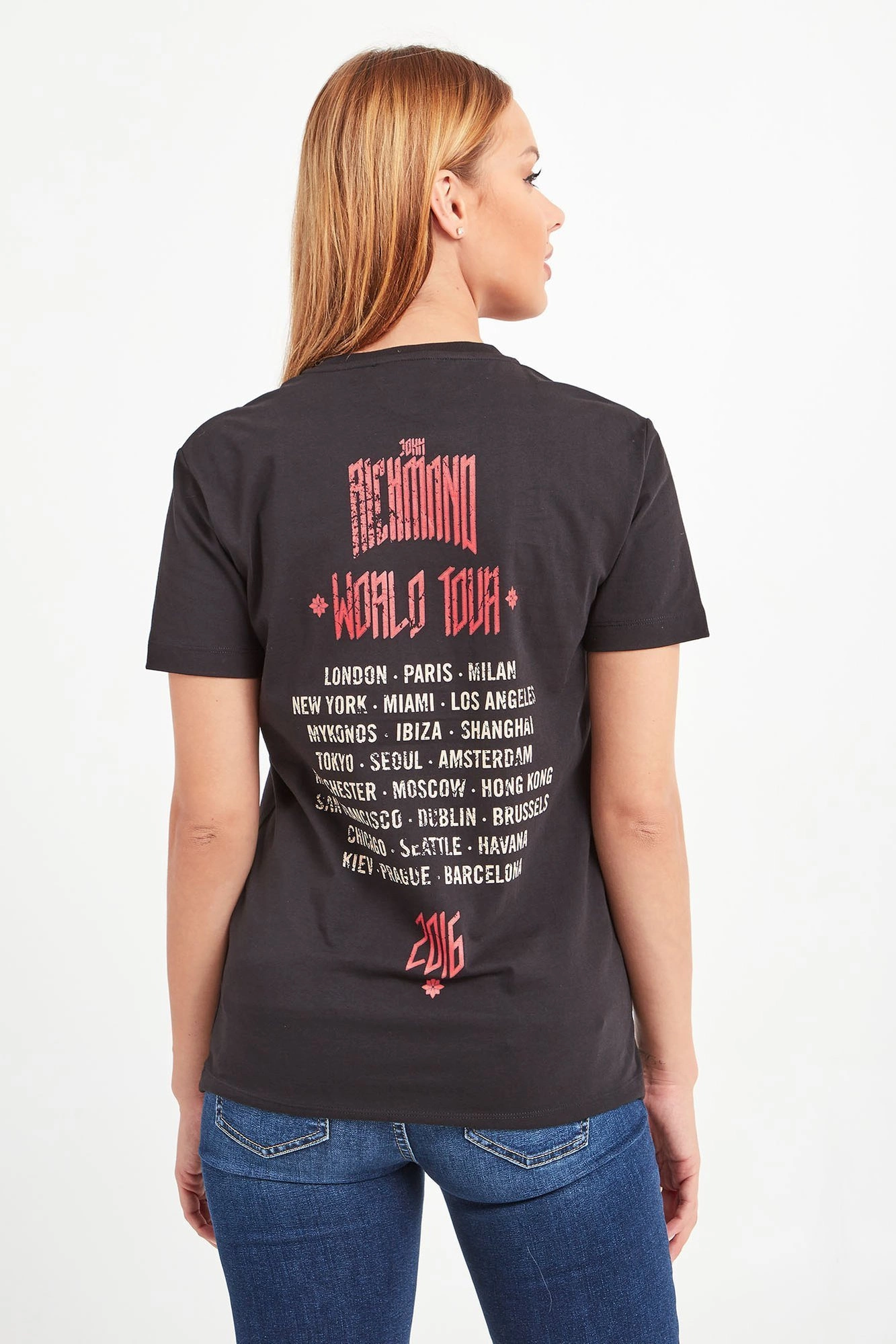 Oryginalny t-shirt w czarnym kolorze. Dekolt typu o-neck wykończony ściągaczem. Z przodu i z tyłu duży wielokolorowy nadruk z nazwą i logo marki. T-shirt wykonany z wysokiej jakości bawełny. Miękki w dotyku. Idealny jako ciekawa baza do casualowych stylizacji.