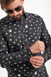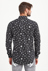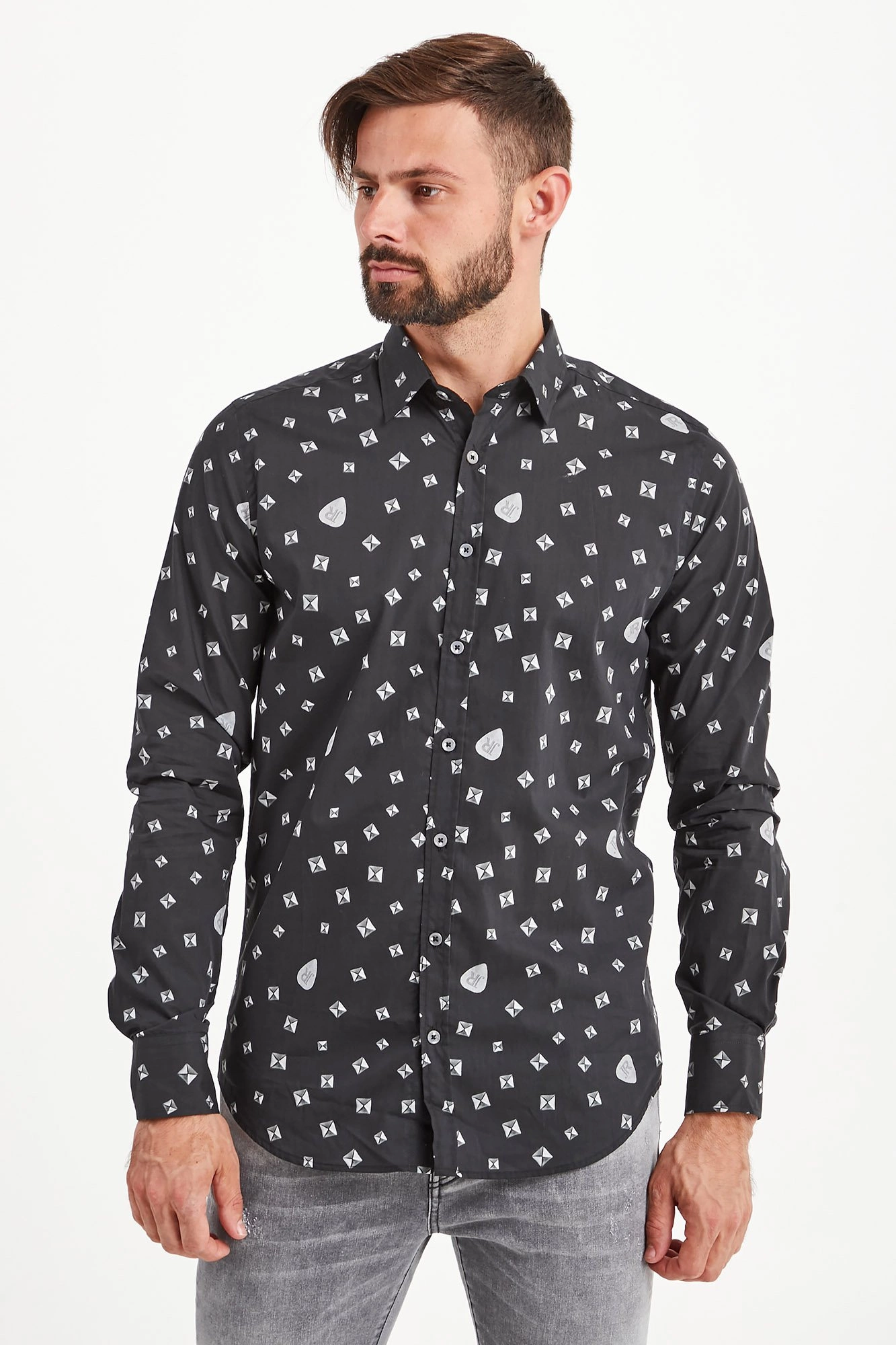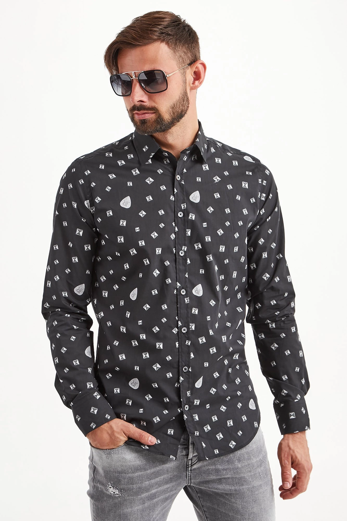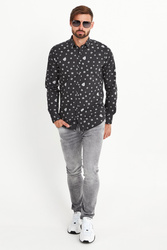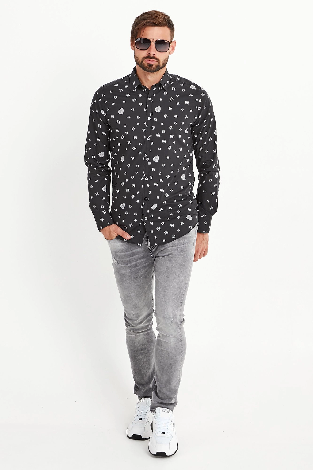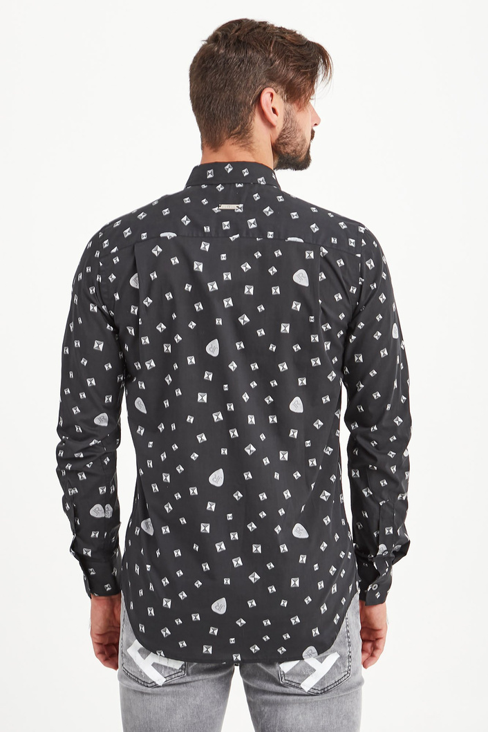 Koszula w czarnym kolorze. Na całości logowany marki połączony z figurami geometrycznymi utrzymany w odcieniach szarości. Kołnierzyk prosty typu kent. Zapinana na niewielkie sygnowane guziki. Rękawy wykończone prostym mankietem, zapinanym na jeden guzik. Z tyłu niewielka metalowa aplikacja z tłoczeniem nazwy marki. Koszula wykonana z wysokiej jakości bawełny. Klasyczna i elegancka.