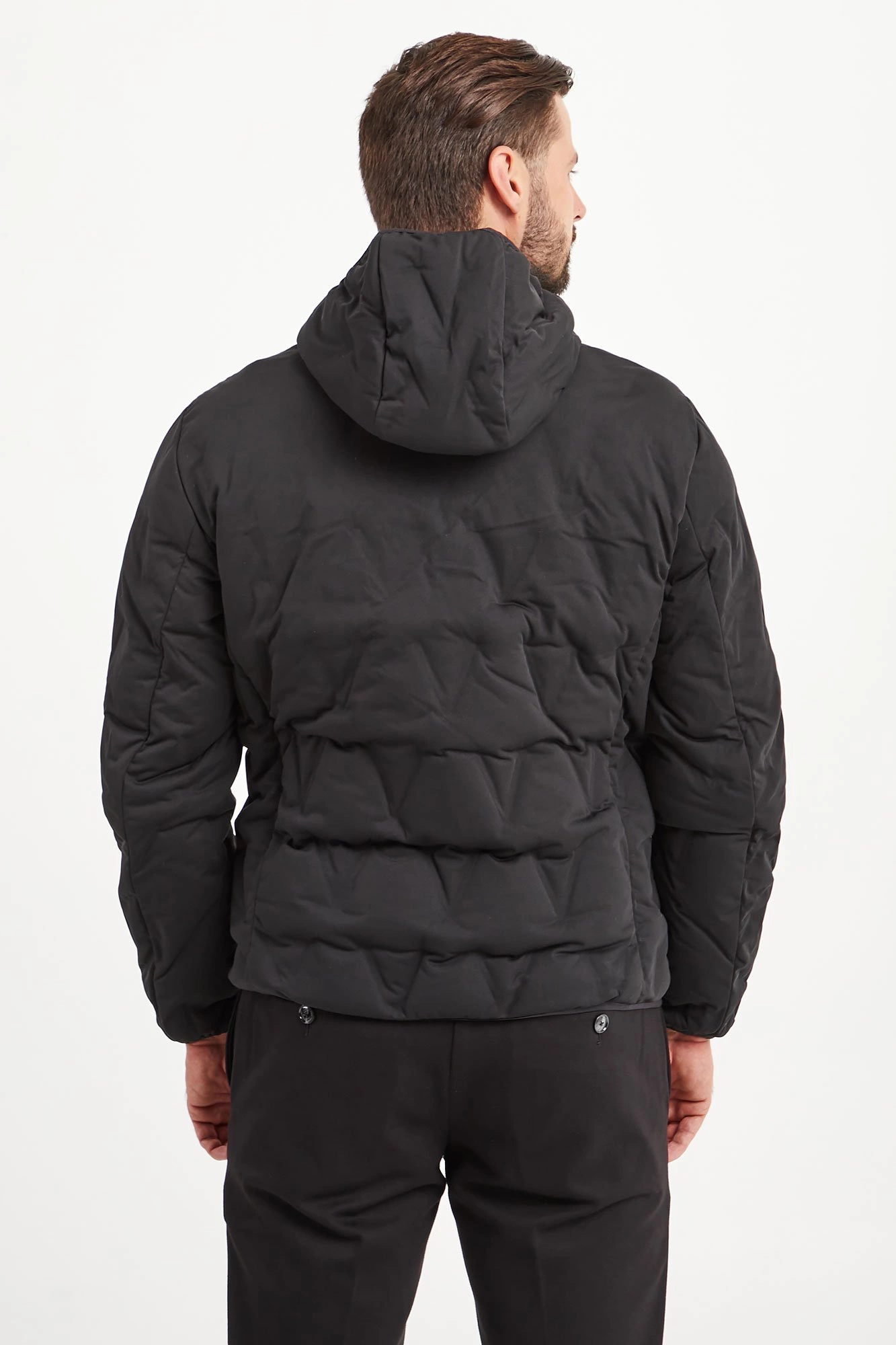 Kurtka w czarnym kolorze z kapturem. Na całości tłoczenia imitujące pikowanie. Zapinana na dwukierunkowy zamek zdobiony nadrukiem logo marki. Z przodu dwie kieszenie zapinane na zamek. Kaptur, rękawy i dół wykończone czarnym, elastycznym ściągaczem. Na lewym rękawie aplikacja z nazwą i logo marki. Podszewka w kolorze szarego melanżu, z tłoczeniami. Kurtka wykonana z wysokiej jakości materiału z wypełnieniem z kaczego puchu i pierza. Ciepła, lekka i miękka w dotyku.