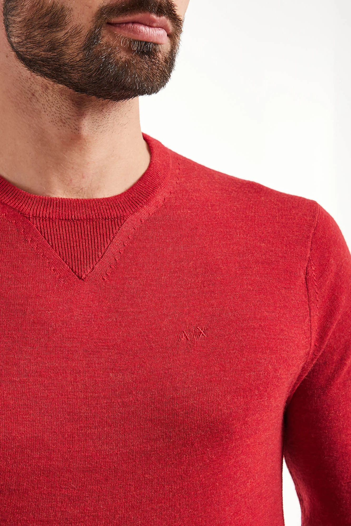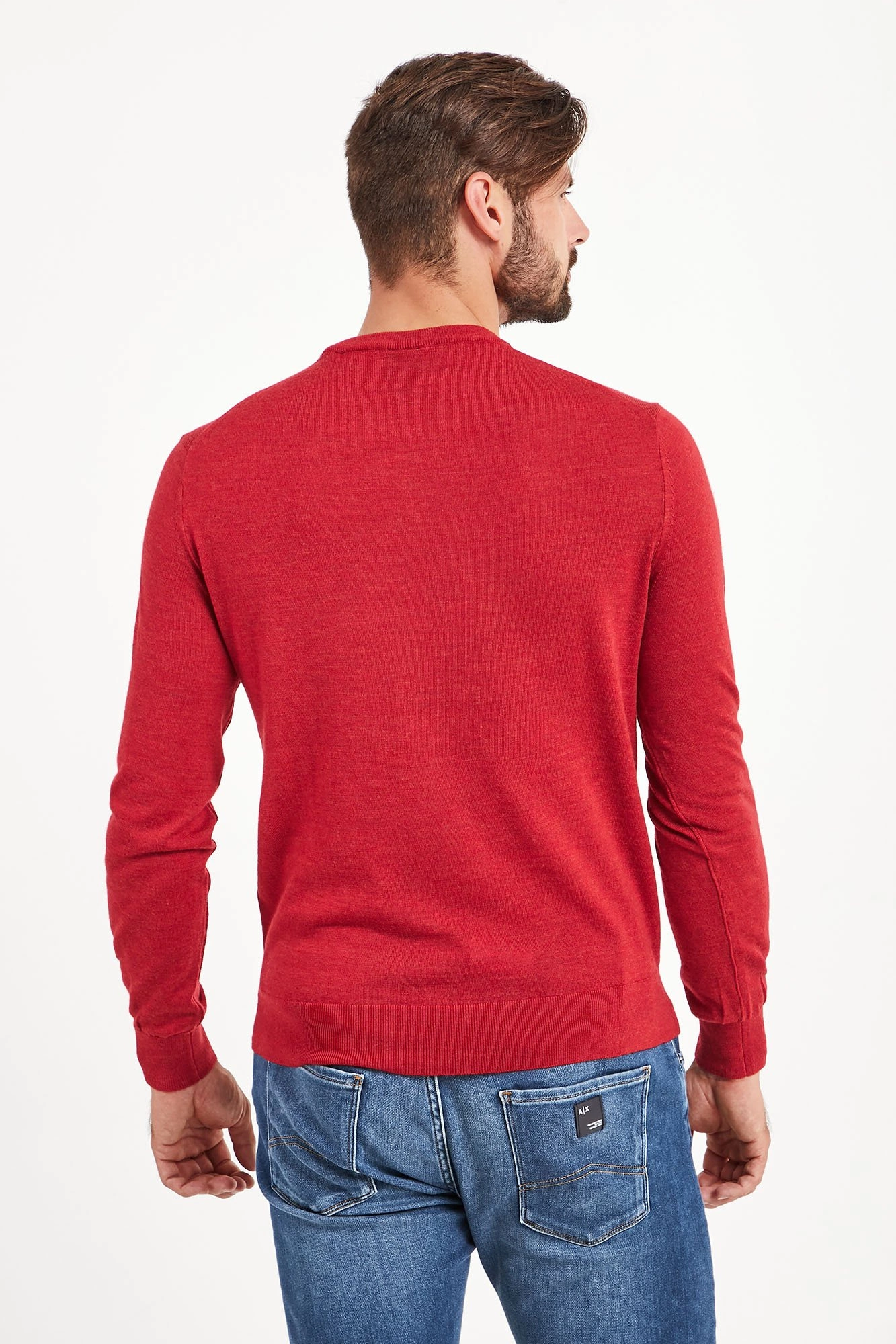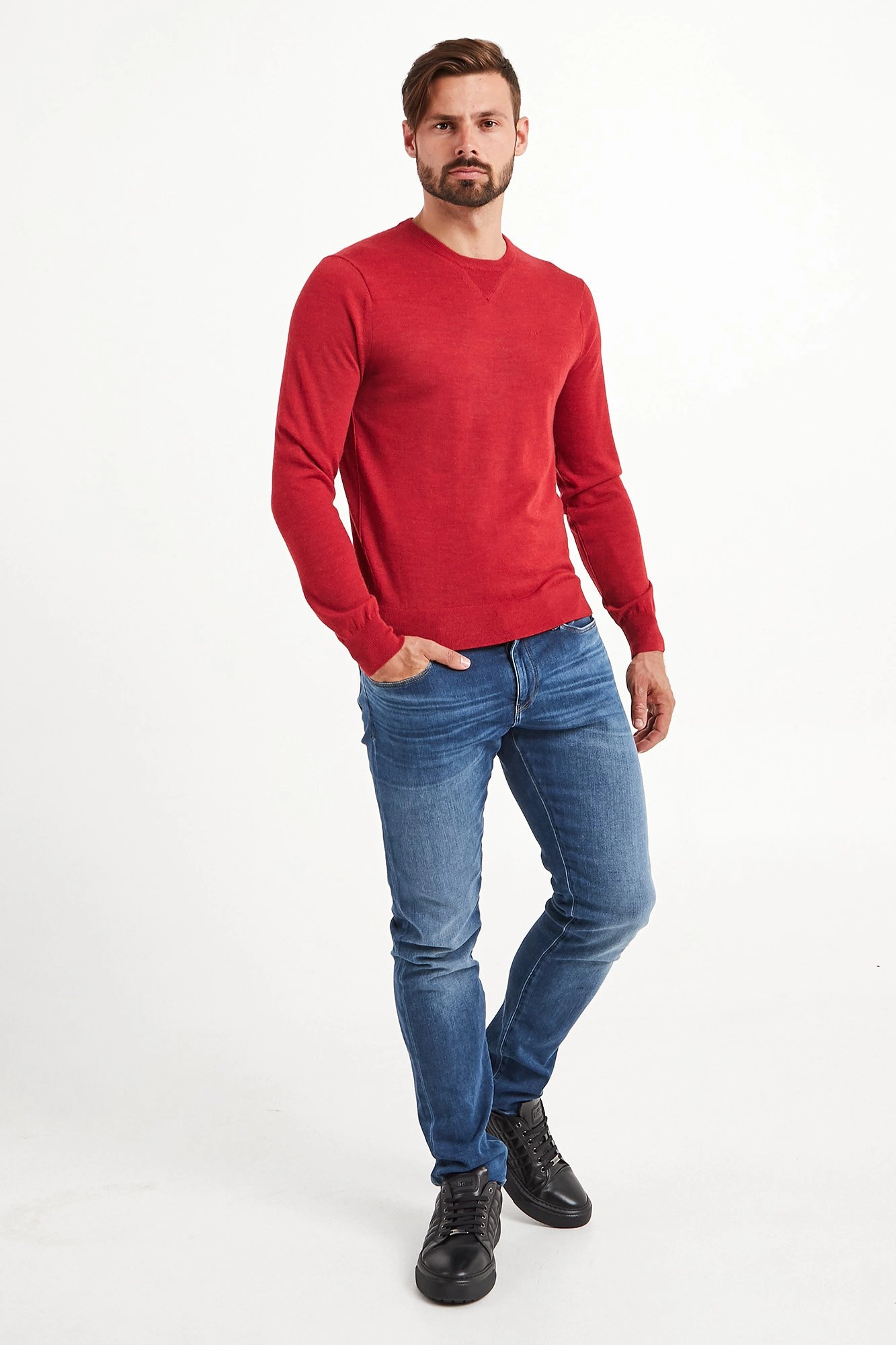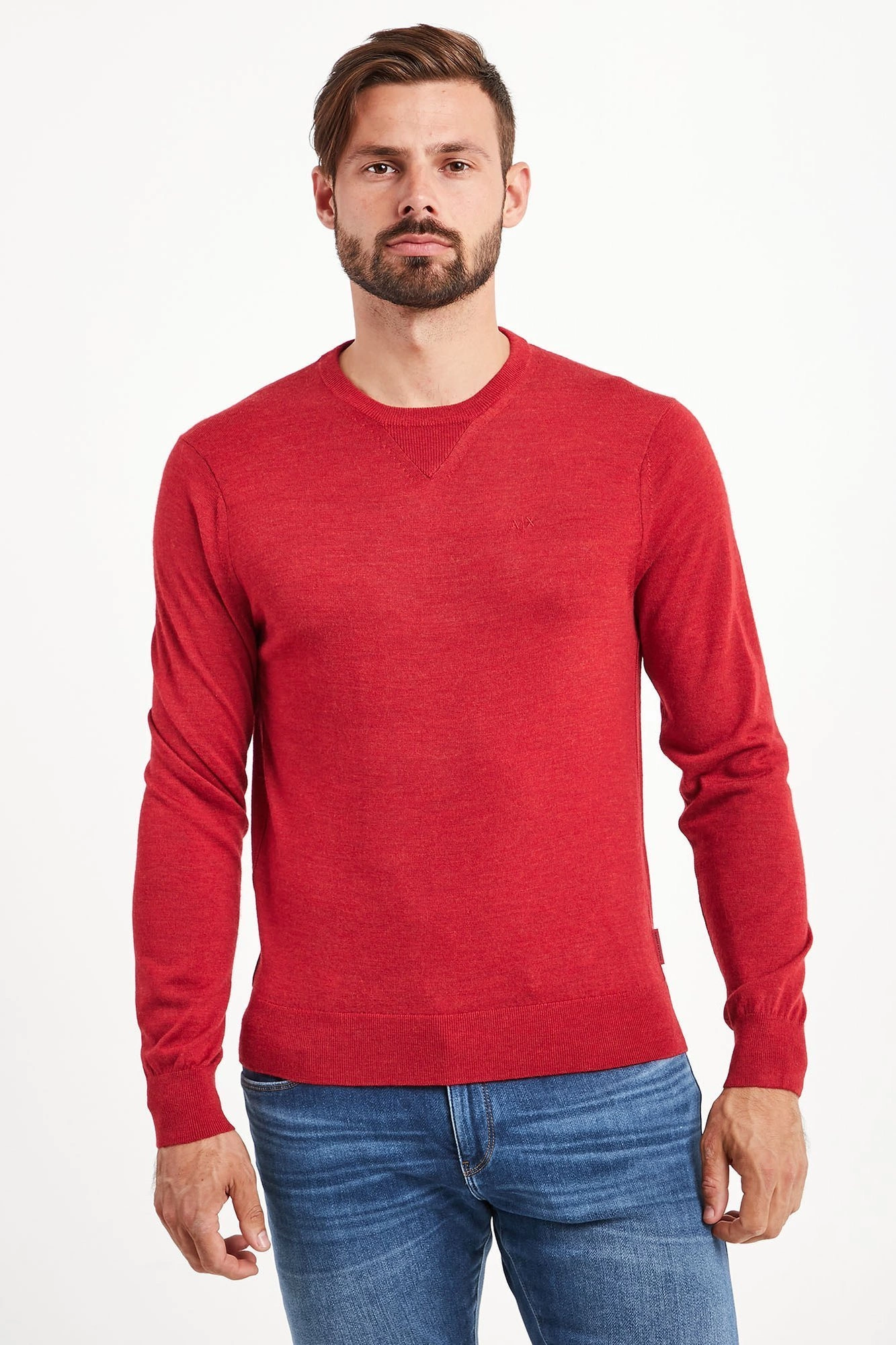 Klasyczny sweter czerwonym kolorze. Dekolt typu o-neck. Z przodu niewielki logowany haft. Rękawy i dół wykończone szerokim ściągaczem. Sweter wykonany z najwyższej jakości żywej wełny. Miękki, przyjemny w dotyku.
