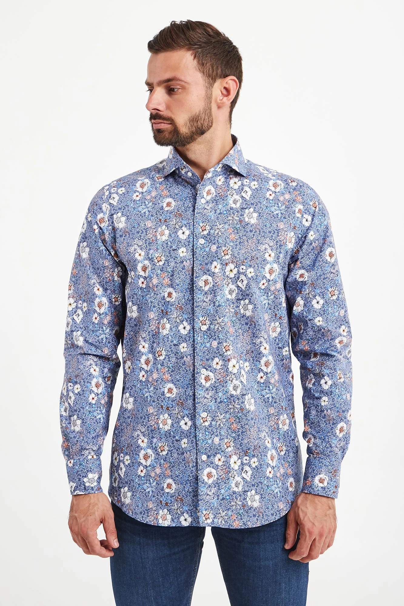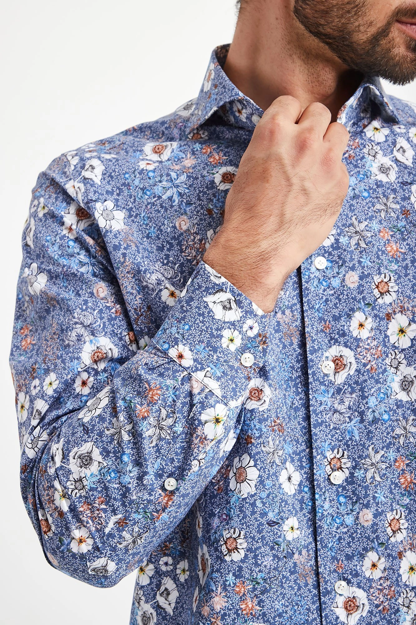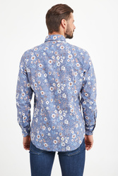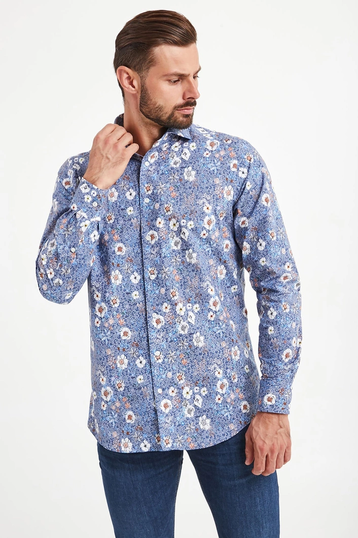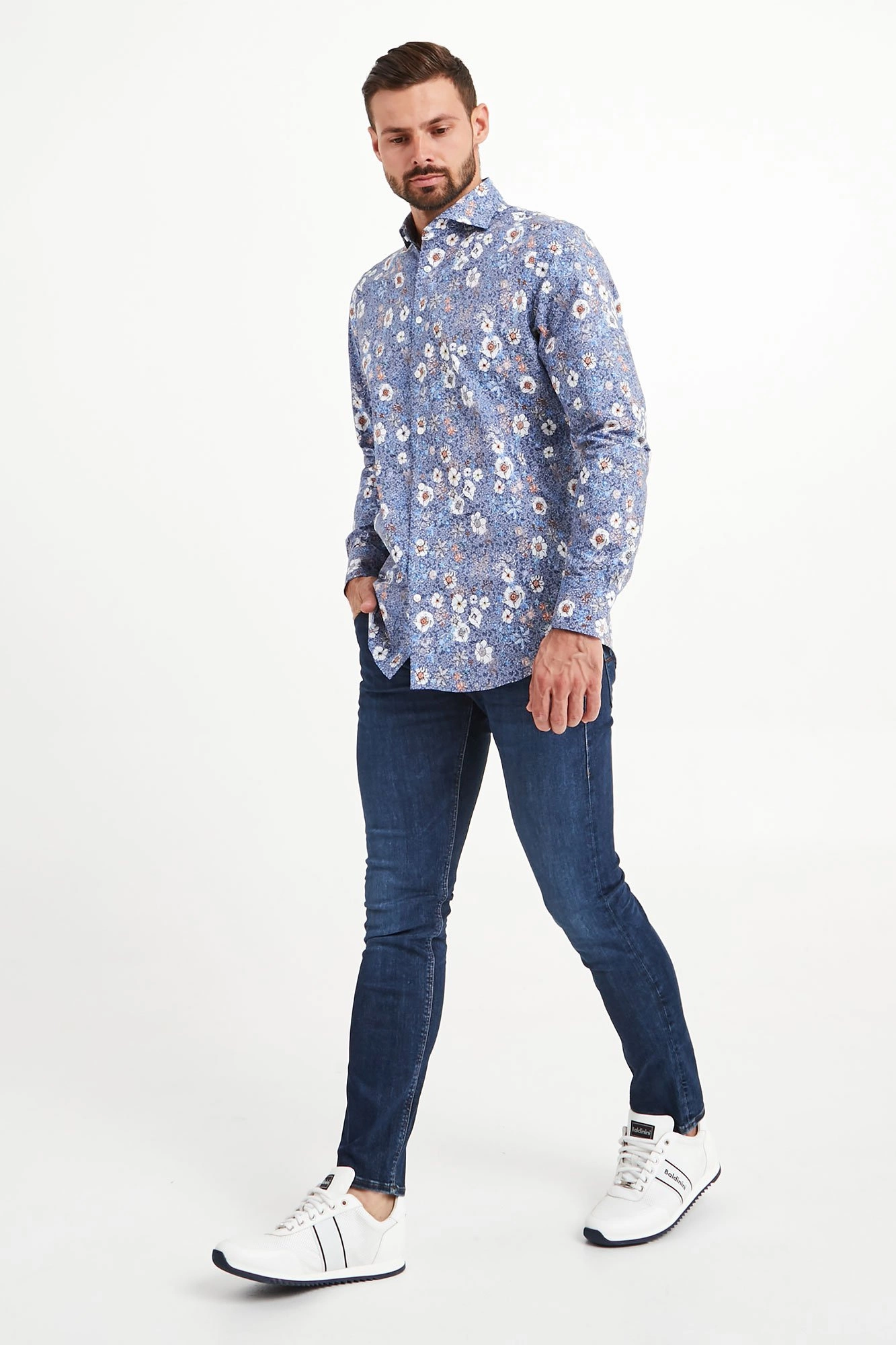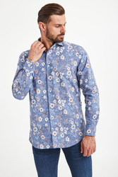 Koszula w niebieskim kolorze w wielokolorowy wzór z kwiatowym motywem. Zapinana na perłowe guziki. Kołnierzyk typu włoskiego. Rękawy wykończone ściętym mankietem, zapinanym na jeden guzik. Dół zaokrąglony. Koszula wykonana z wysokiej jakości bawełny z dodatkiem elastanu. Idealna zarówno do stylizacji biznesowych, jak i tych mniej formalnych.