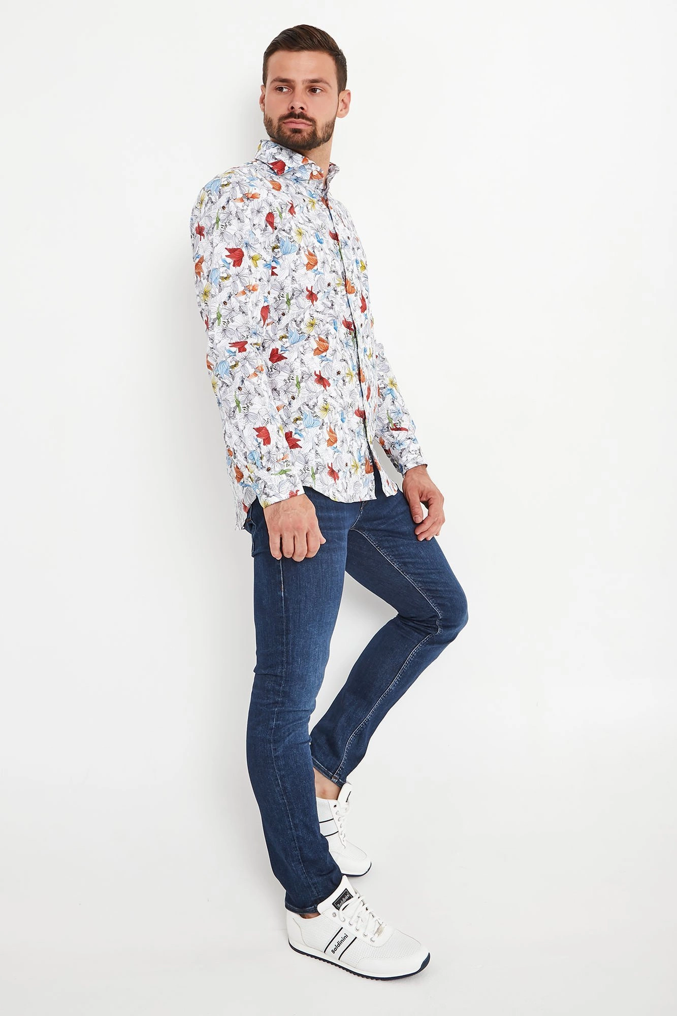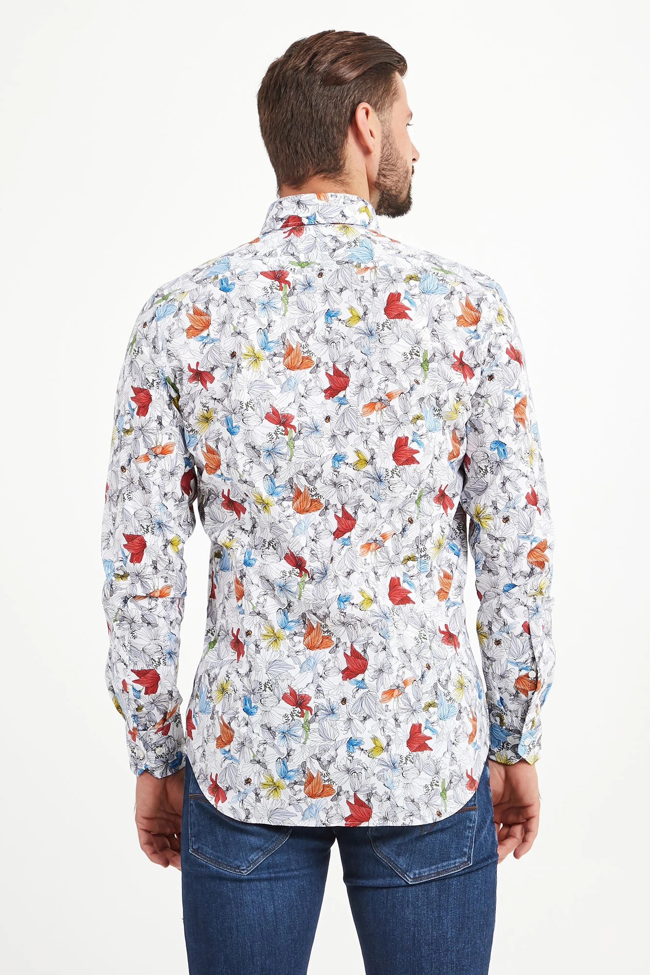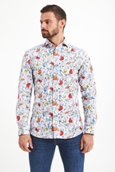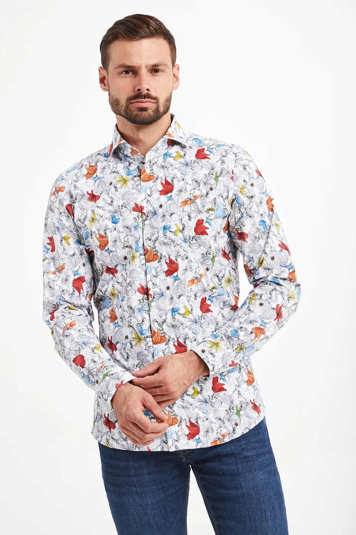 Koszula w białym kolorze w wielokolorowy, kwiatowy wzór. Zapinana na perłowe guziki. Kołnierzyk typu włoskiego. Rękawy wykończone mankietem, zapinanym na jeden guzik. Dół zaokrąglony. Koszula wykonana z wysokiej jakości bawełny z dodatkiem elastanu. Idealna propozycja zarówno do stylizacji biznesowych, jak i tych mniej formalnych.