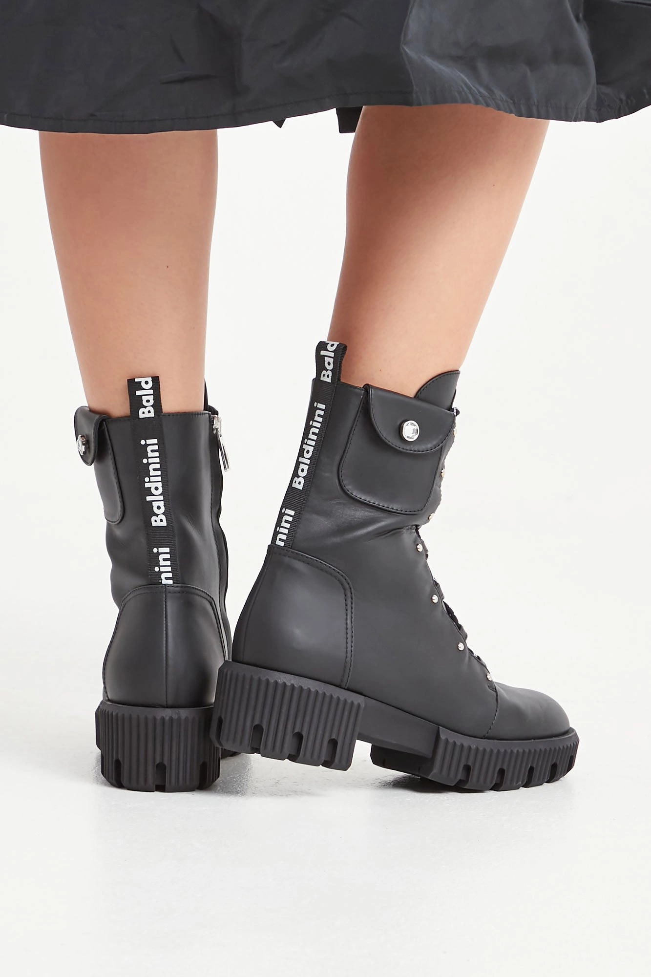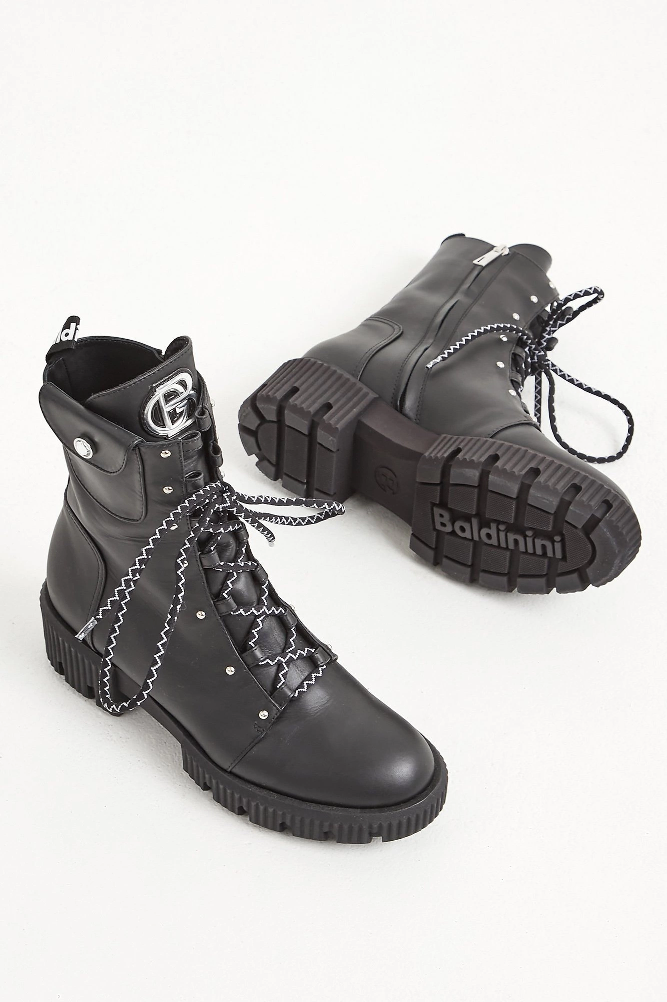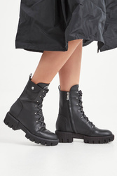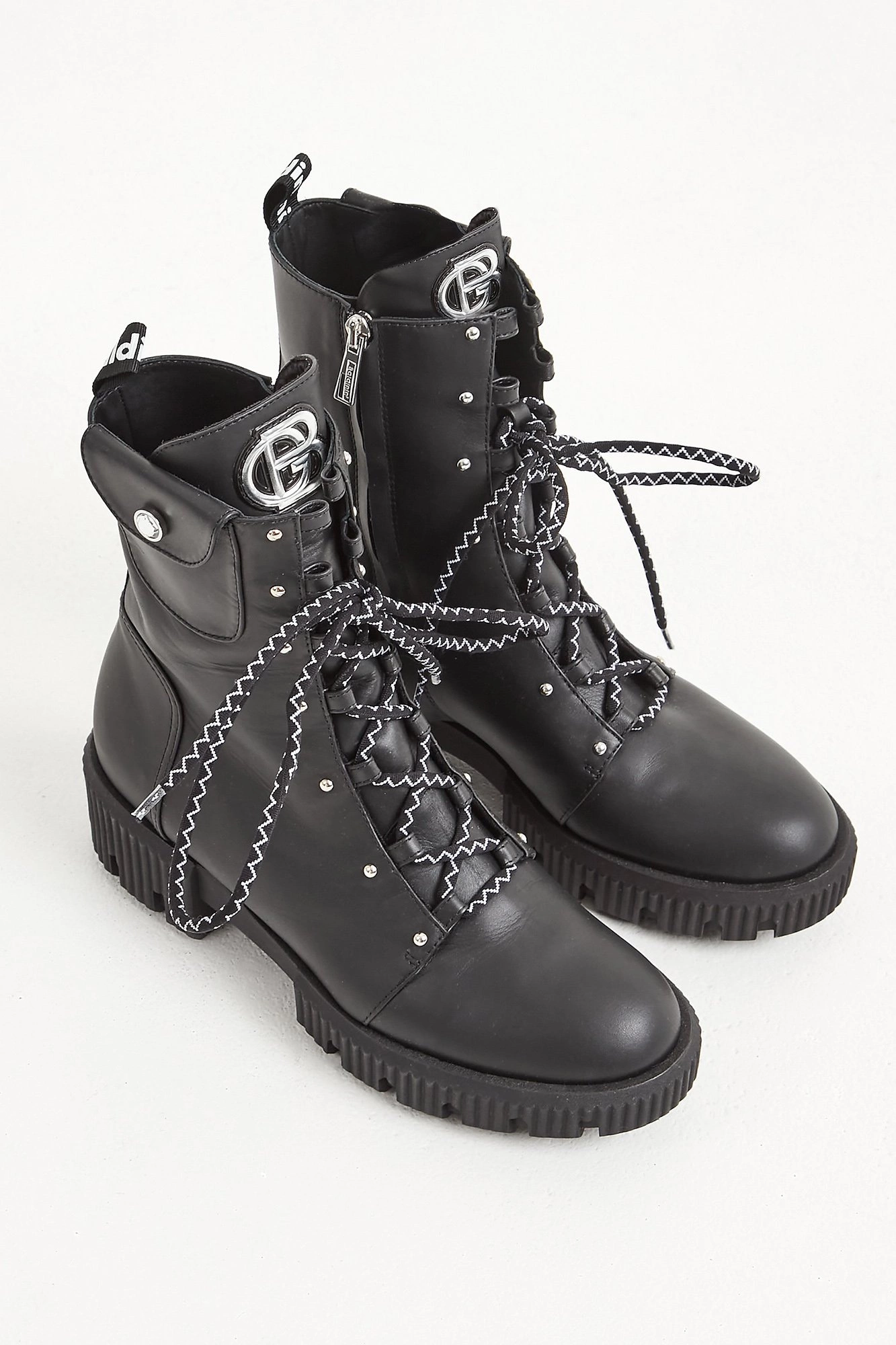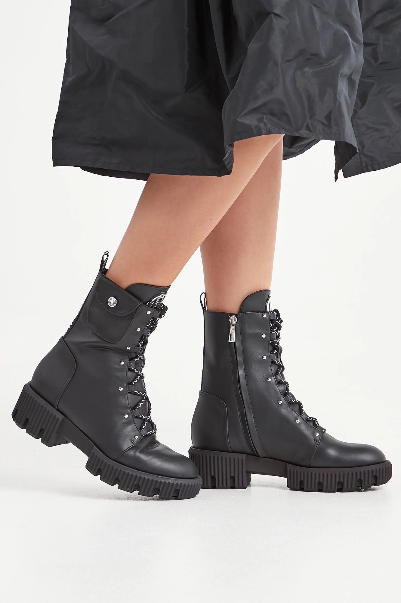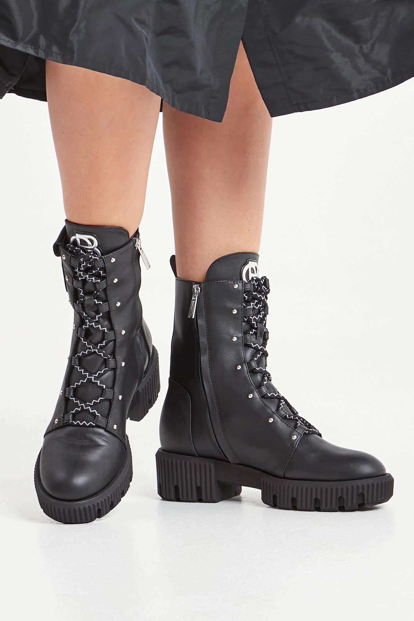 Trapery w czarnym kolorze. Wiązane na dwukolorowe sznurówki i zapinane na zamek po wewnętrznej stronie. Wzdłuż wiązania srebrne dżety. Na języku duża aplikacja w postaci logo marki. Z boku imitacja kieszonki z kryształkiem. Czarna podeszwa o wysokości ok. 5 cm. Trapery wykonane z najwyższej jakości skóry naturalnej. Lekkie i bardzo komfortowe.