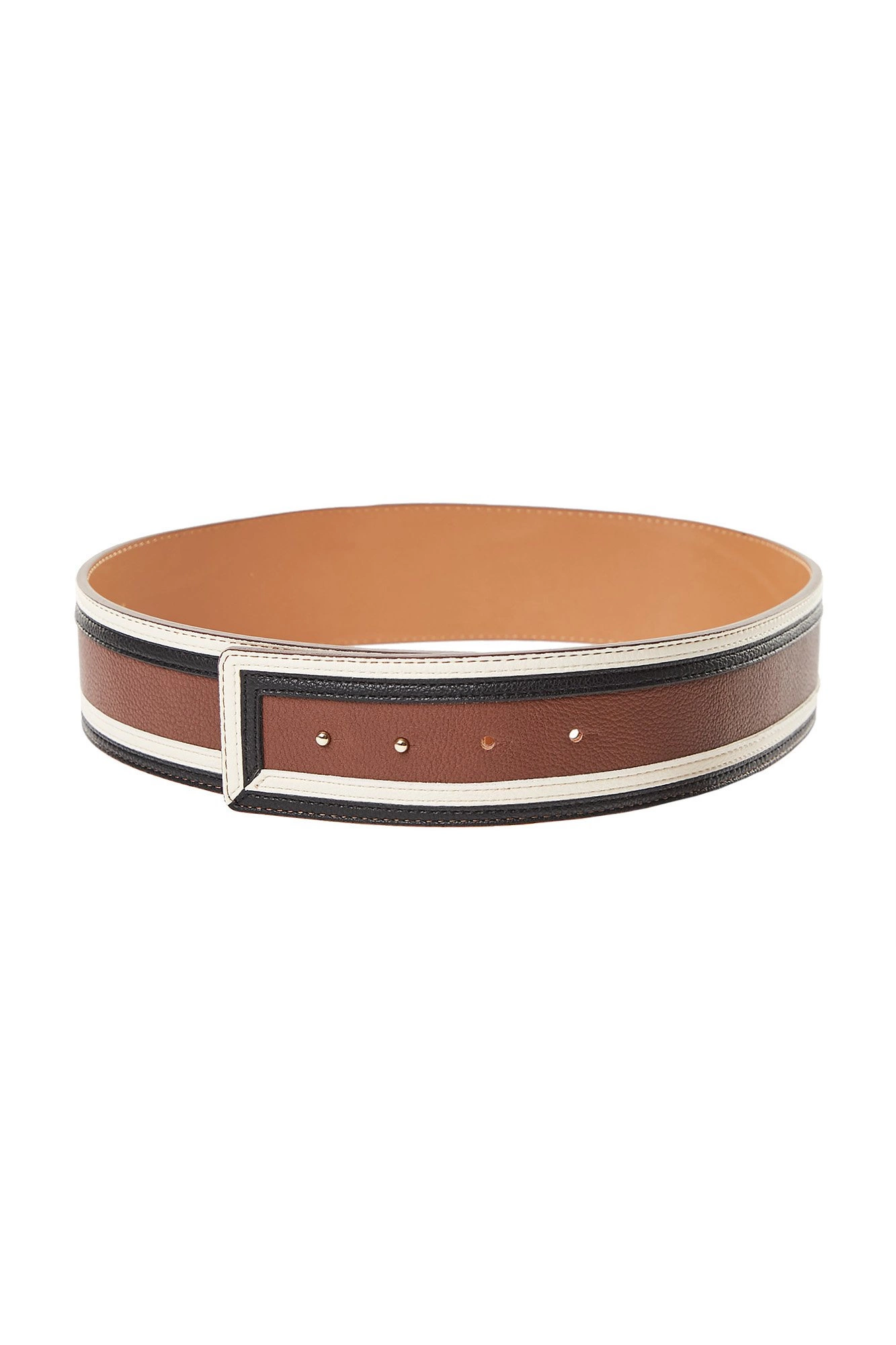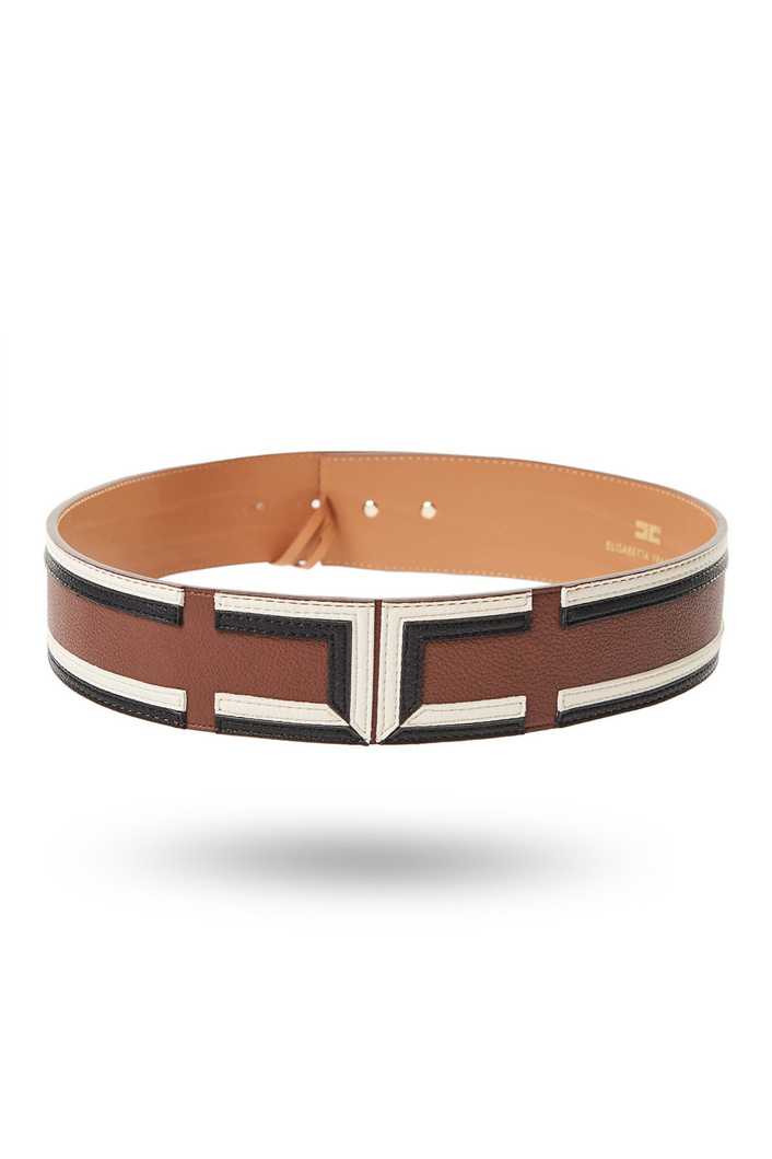 Pasek w odcieniach brązu, czerni i bieli. Na całości pasy, tworzące z przodu logo marki. Szerokość ok. 5 cm. Pasek wykonany z najwyższej jakości skóry ekologicznej. Uniwersalne urozmaicenie do wielu stylizacji.