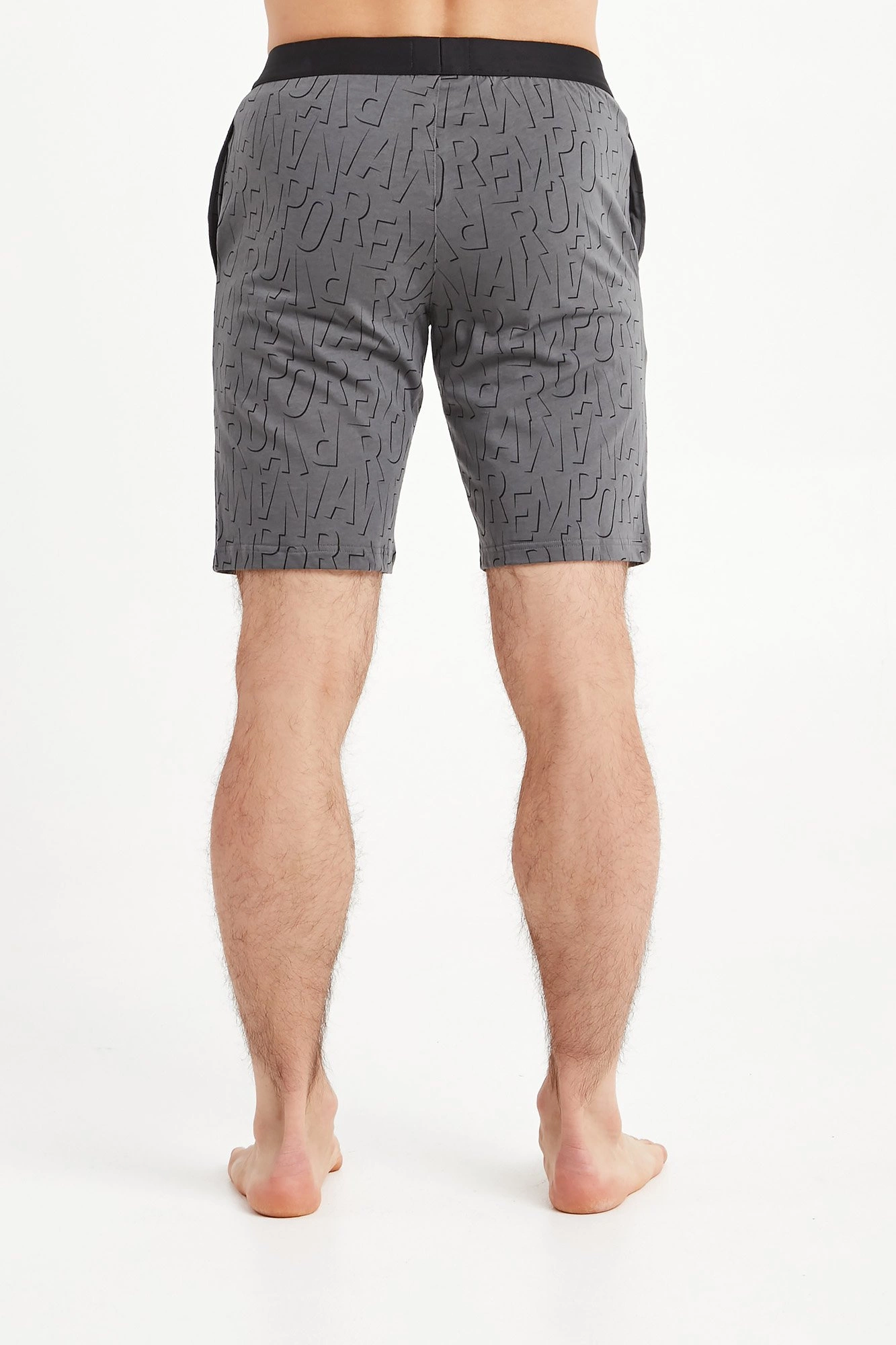 Dół w postaci szarych krótkich spodenek we wzór z logo marki. W pasie logowany ściągacz.