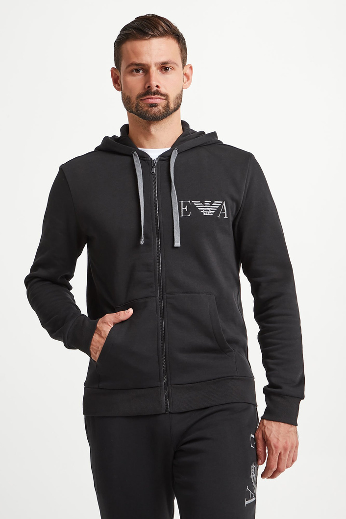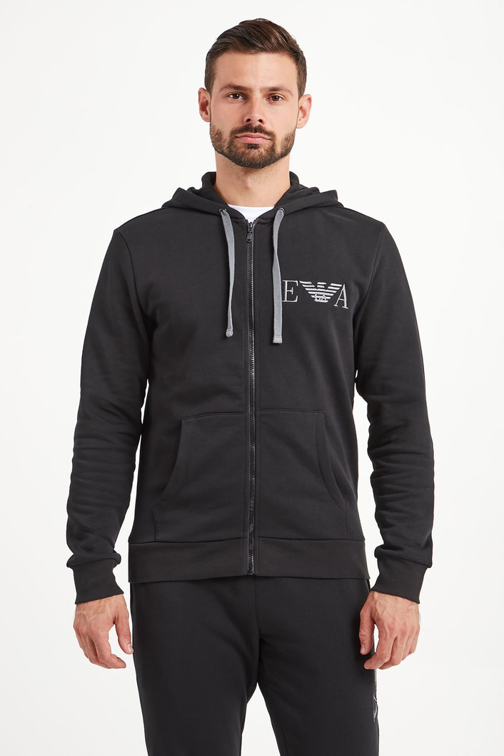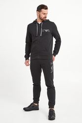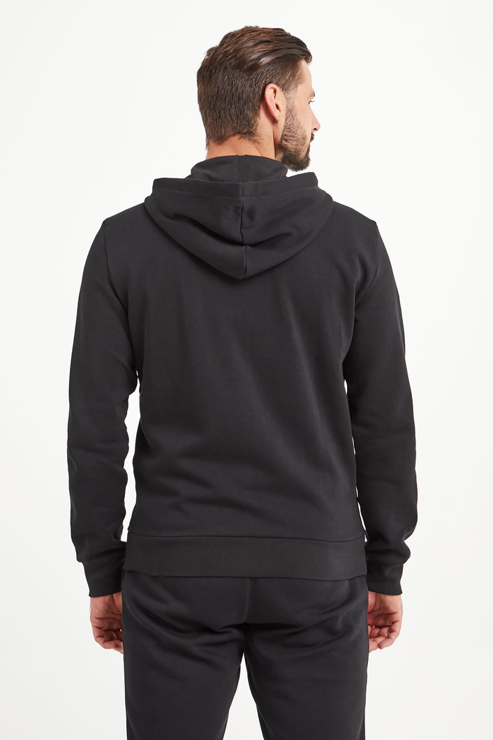 Czarna bluza z kapturem. Zapinana na zamek w tym samym kolorze. Kaptur regulowany za pomocą troczków. Z przodu szary haft z logo marki oraz kieszeń typu "kangurka". Rękawy i dół wykończone ściągaczem. Bluza wykonana z wysokiej jakości materiału. Miękka i komfortowa.