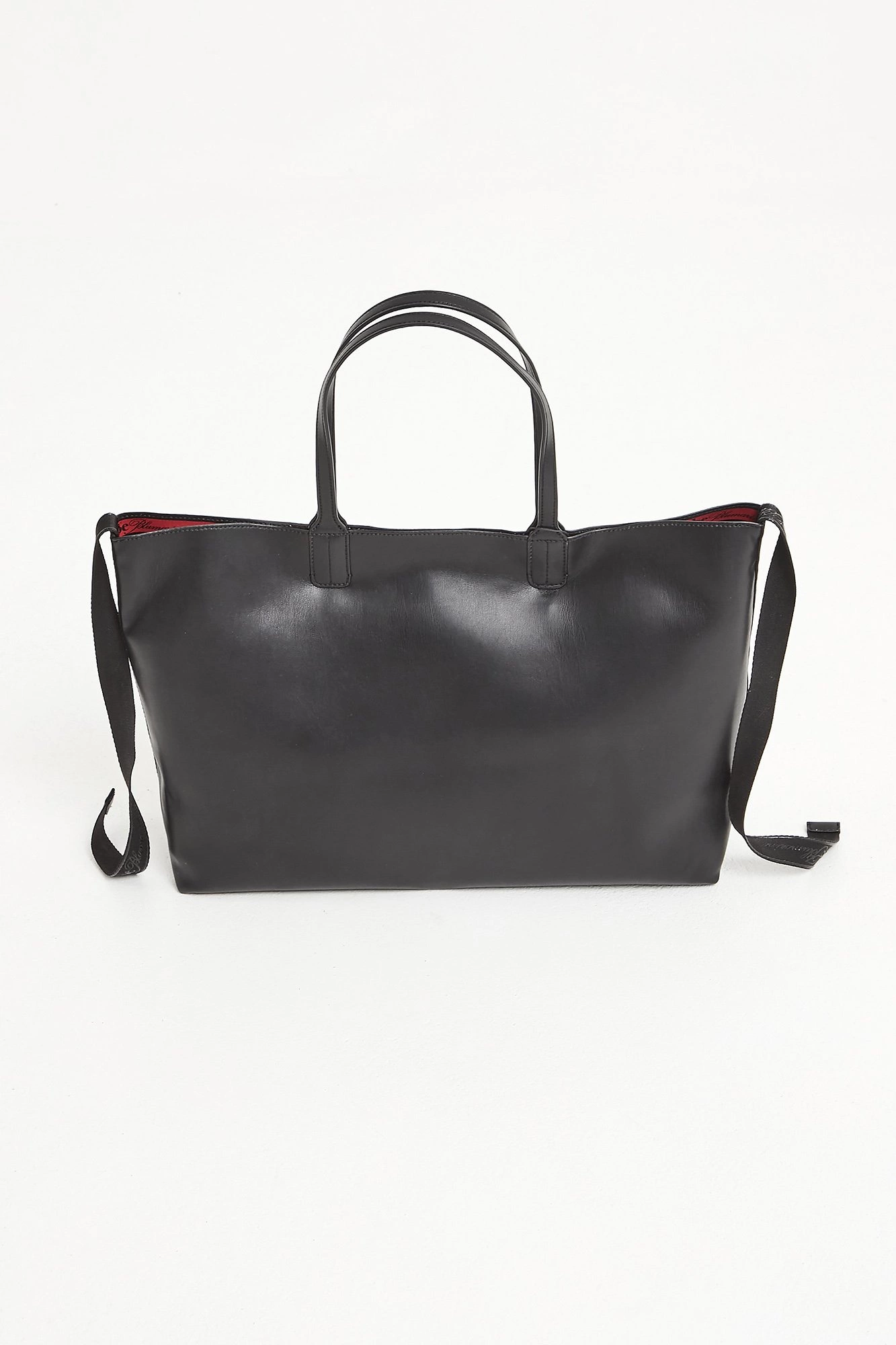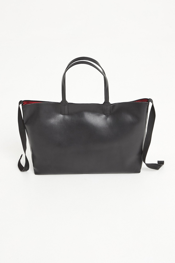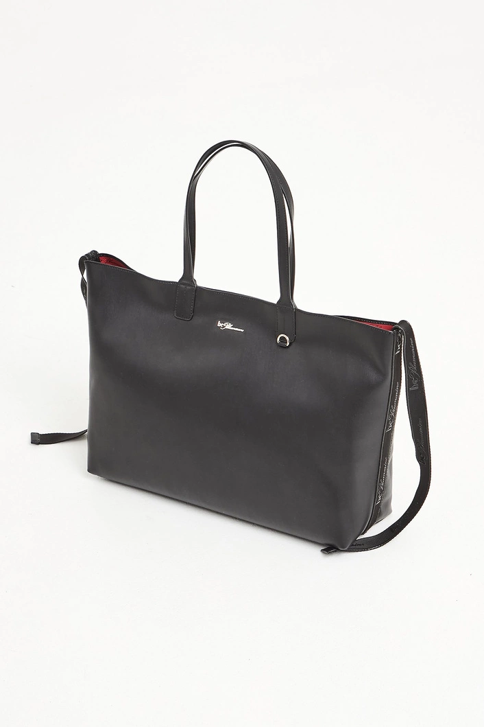 Shopperka w czarnym kolorze. Jednokomorowa. Zapinana za pomocą magnesów ukrytych w uchwytach. Po bokach materiałowe wstawki z czarnym nadrukiem nazwy marki. Wnętrze w zwierzęcy wzór w odcieniach brązu z czerwonymi akcentami. W komplecie niewielka kosmetyczka w ten sam wzór. Zapinana na złoty zamek, mocowana za pomocą złotego karabińczyka. Logowana podszewka w czarnym kolorze. Shopperka wykonana z wysokiej jakości skóry ekologicznej. W komplecie worek przeciwkurzowy. Pojemna, idealna do codziennych stylizacji.