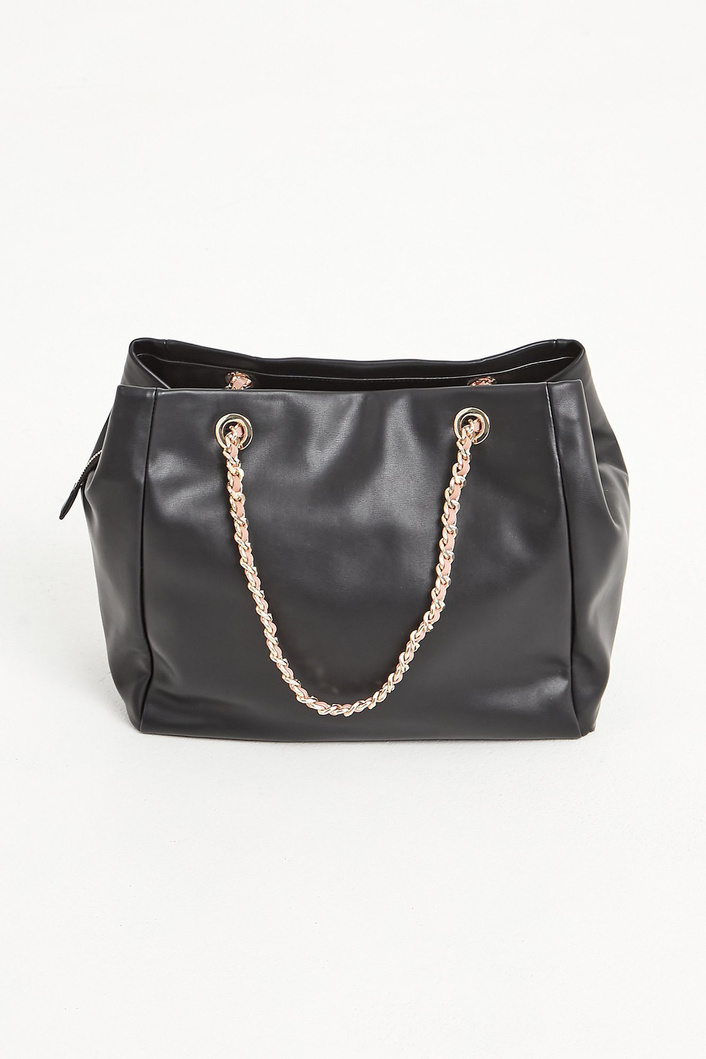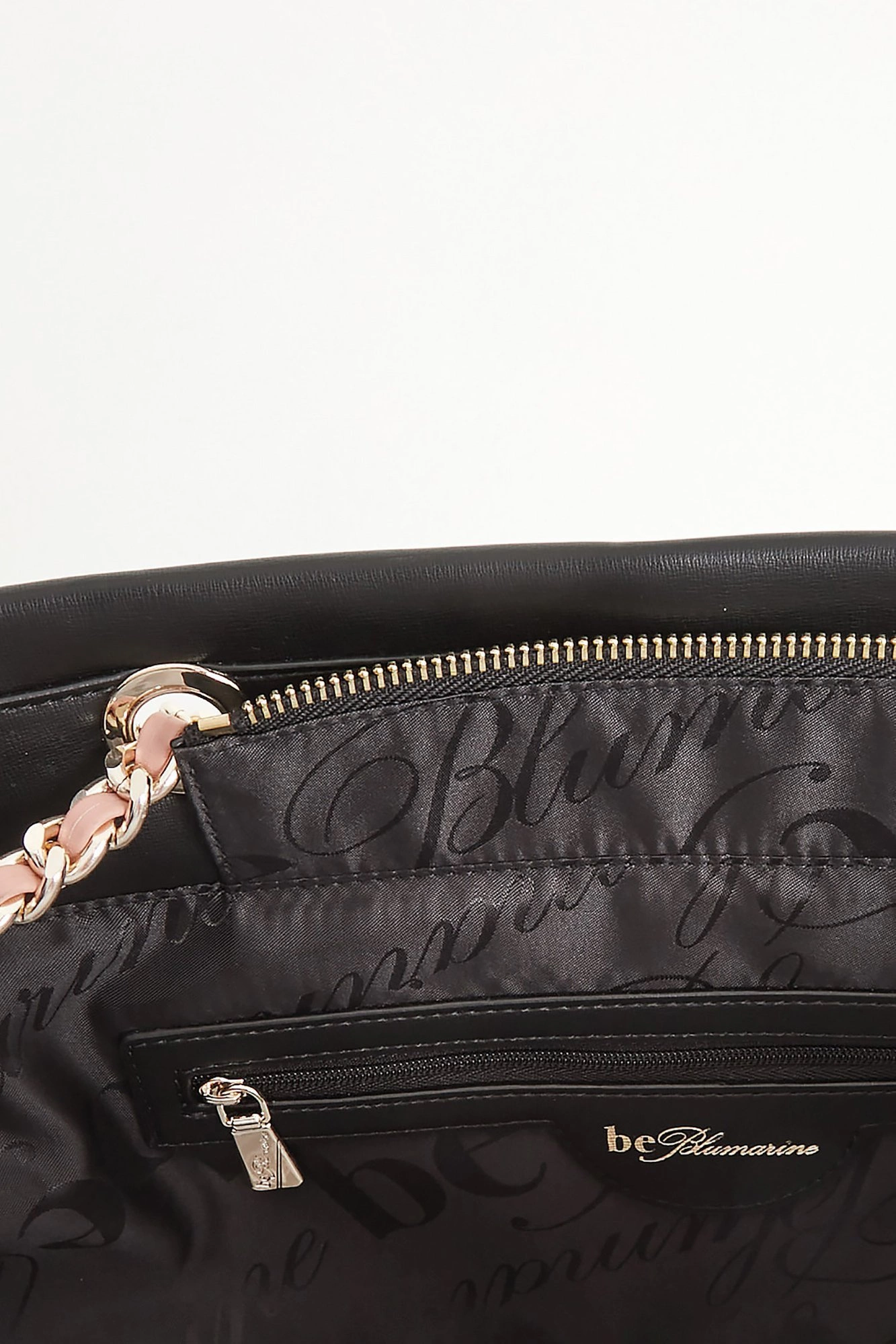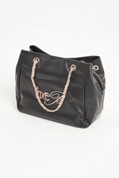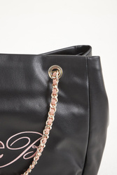 Torebka do ręki w czarnym kolorze. Jednokomorowa. Zapinana na złoty zamek sygnowany nazwą marki. Wewnątrz dwie kieszenie. Podszewka w czarnym kolorze we wzór. Z przodu haft w kolorze pudrowego różu z wielokolorowymi wstawkami. Uchwyty w postaci złotego łańcucha zdobionego różowym paskiem. Z boku złota aplikacja nazwy marki.