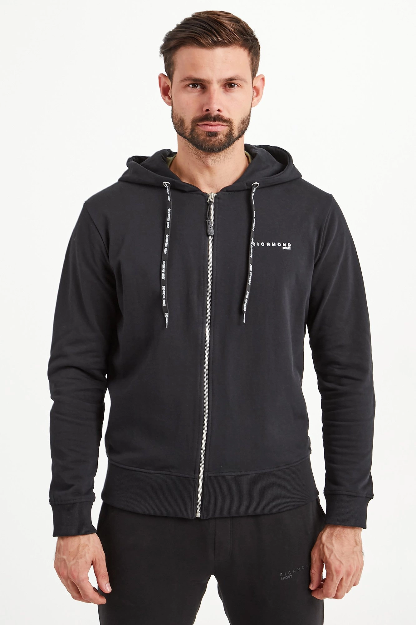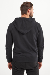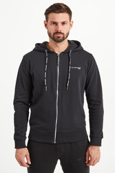 Bluza w czarnym kolorze z kapturem. Zapinana na srebrny zamek z dekoracyjną zawieszką. Kaptur regulowany za pomocą logowanych troczków. Z przodu nadruk z nazwą marki. Rękawy i dół wykończone ściągaczem. Bluza wykonana z wysokiej jakości bawełny. Wygodna i przyjemna w dotyku.