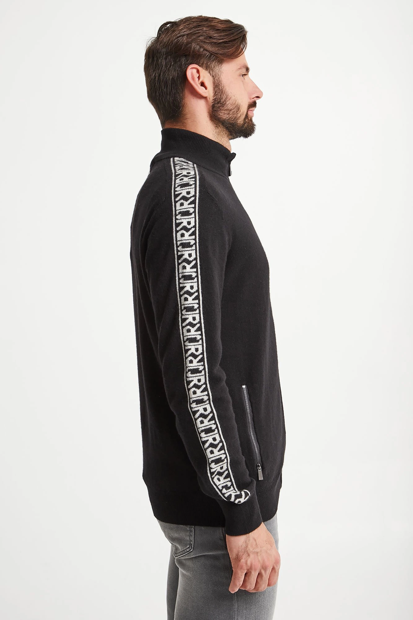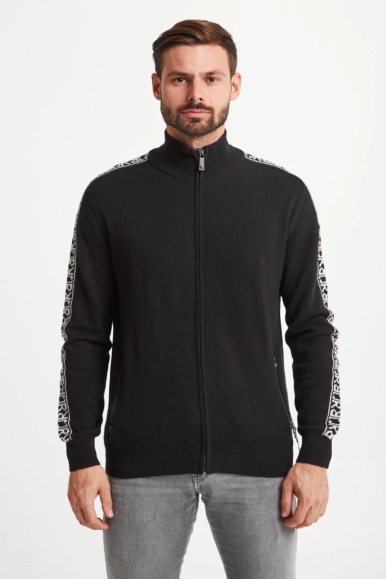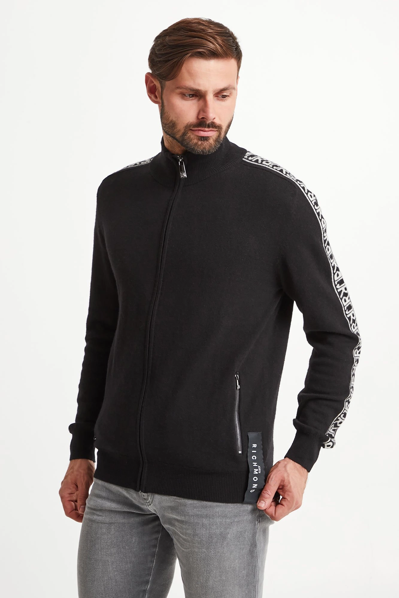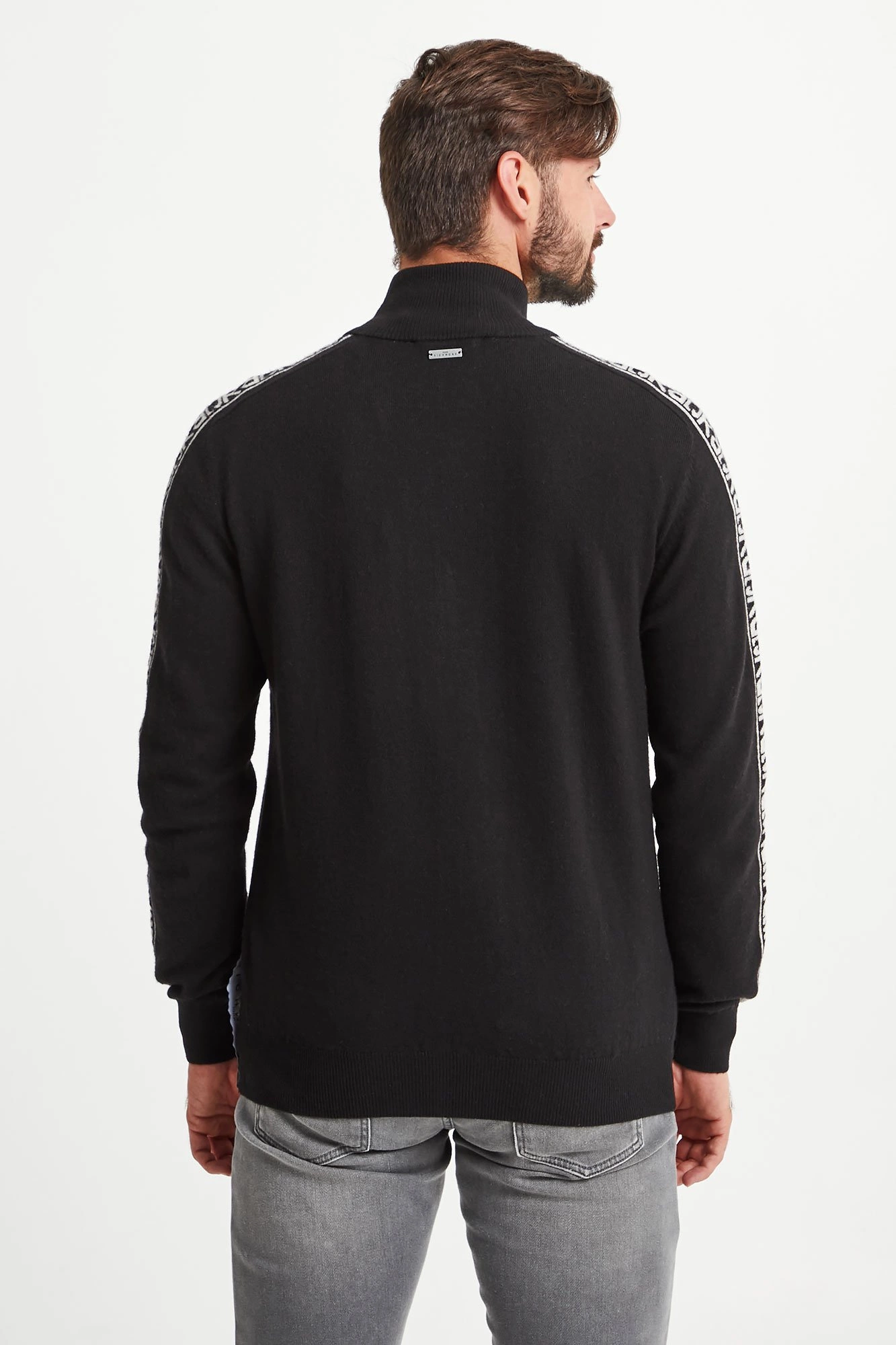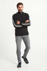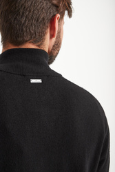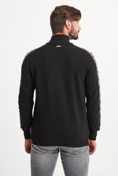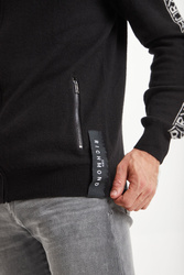 Ciepły sweter w czarnym kolorze. Zapinany na zamek z sygnowaną zawieszką. Dekolt wykończony golfem. Z przodu dwie kieszenie. Na ramionach kontrastowe lampasy z nazwą marki. U dołu niewielka, logowana naszywka. Sweter wykonany z najwyższej jakości wełny. Idealna propozycja na chłodniejsze dni.
