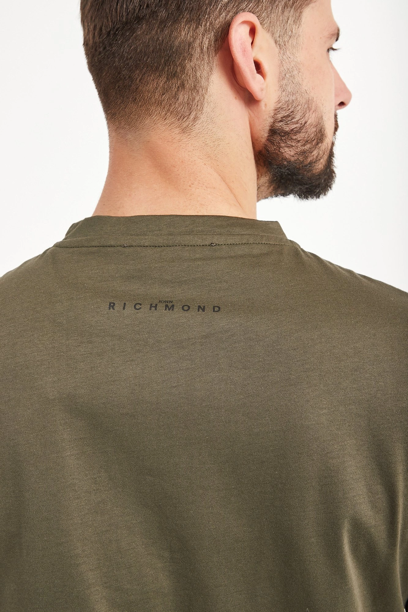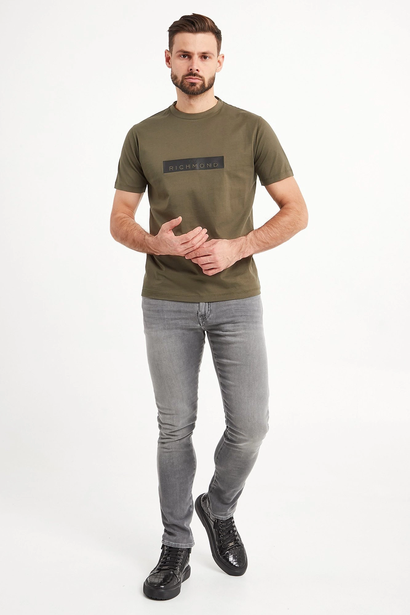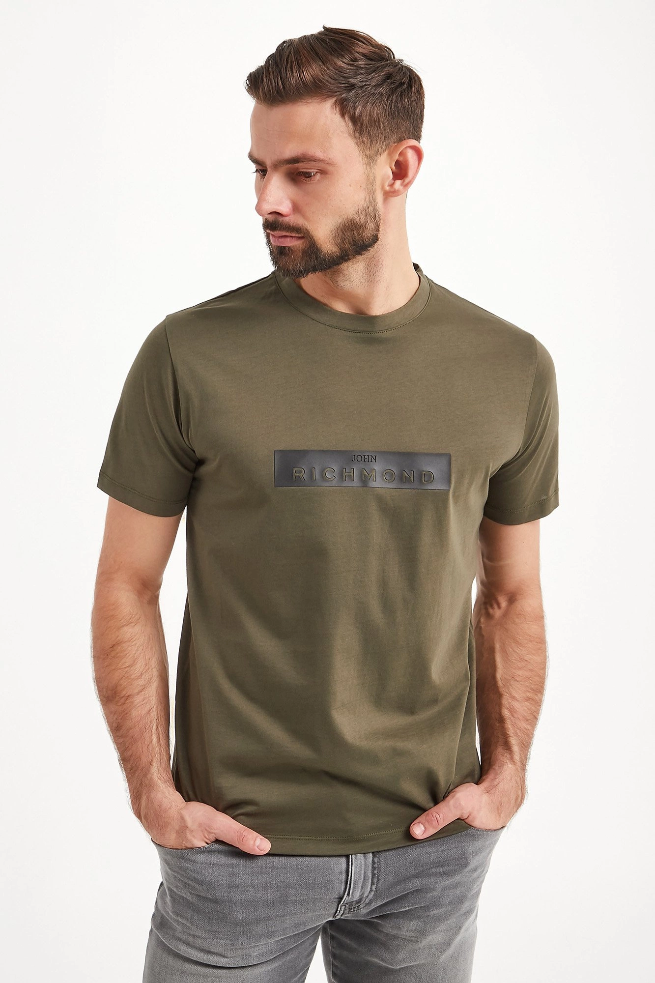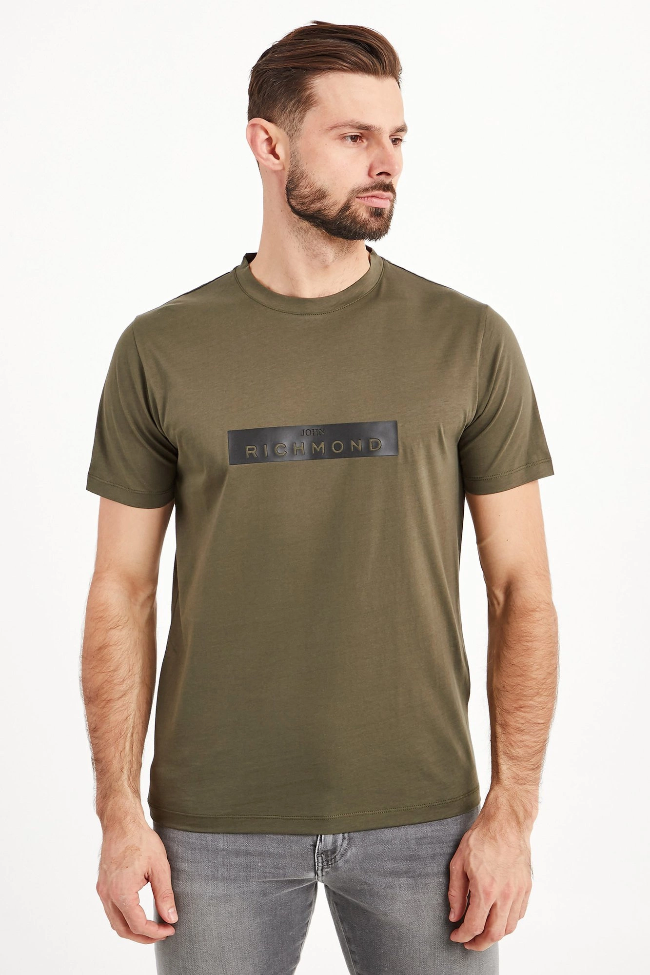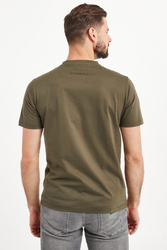 T-shirt w oliwkowym kolorze o prostym fasonie. Dekolt typu o-neck. Z przodu duży, czarny nadruk z nazwą marki. T-shirt wykonany z wysokiej jakości bawełny. Komfortowy, miękki i przewiewny.