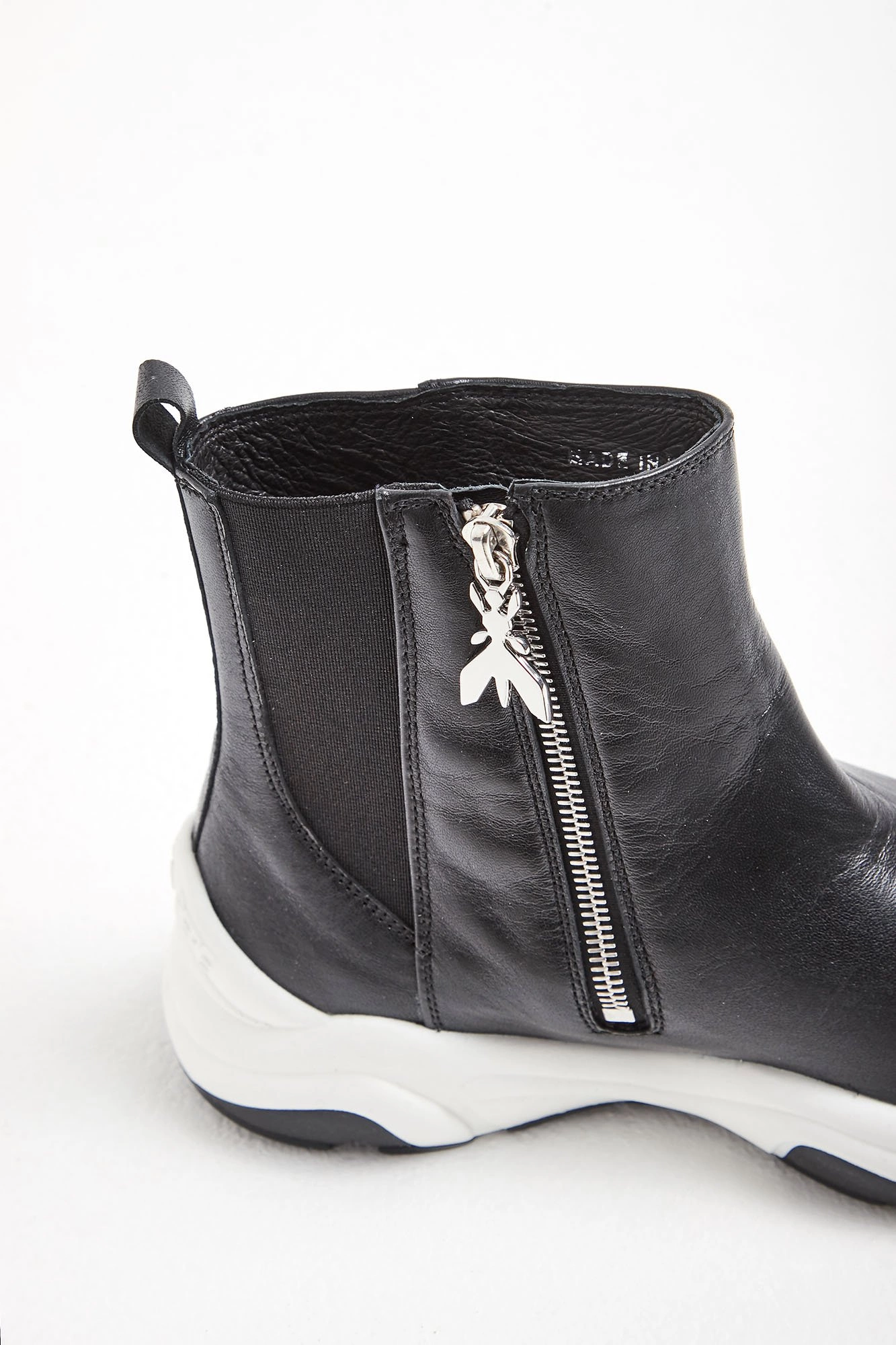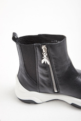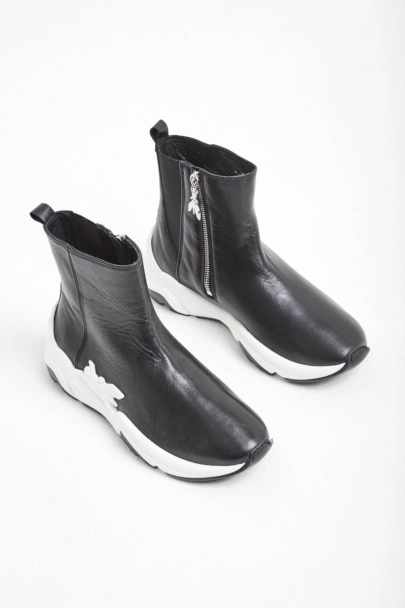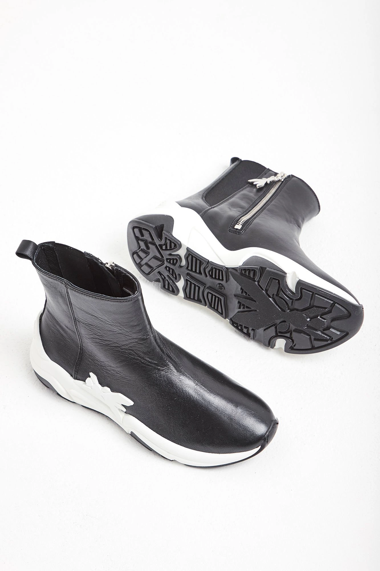 Sneakersy w czarnym kolorze. Zapinane od wewnątrz na srebrny zamek z logo marki. Z tyłu pętelka ułatwiająca zakładanie. Podeszwa biało-czarna z wysokogatunkowego tworzywa. Zdobiona nazwą i logo marki. Jej wysokość ok. 5 cm. Sneakersy wykonane z najwyższej jakości skóry naturalnej. Lekkie, wygodne i ponadczasowe.