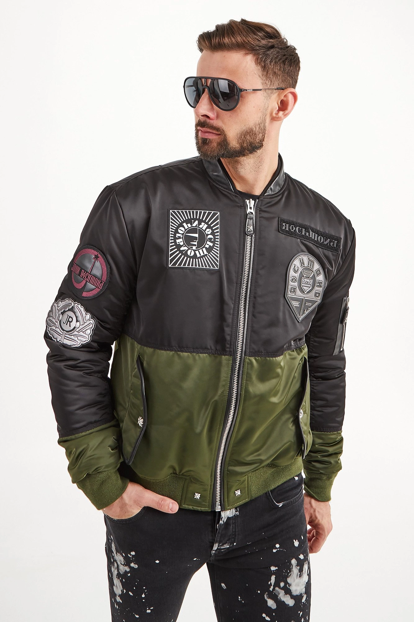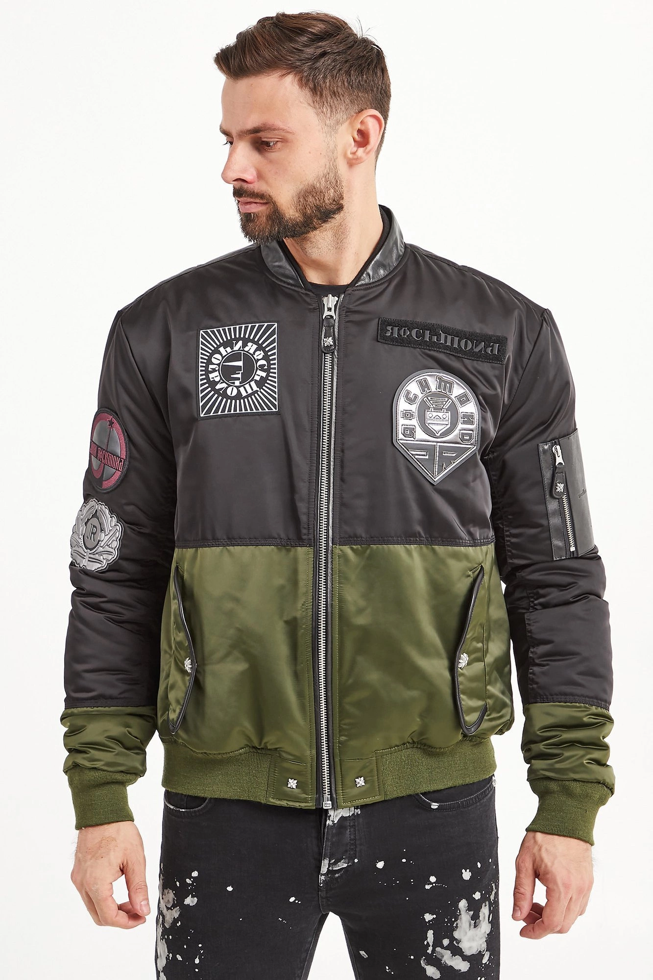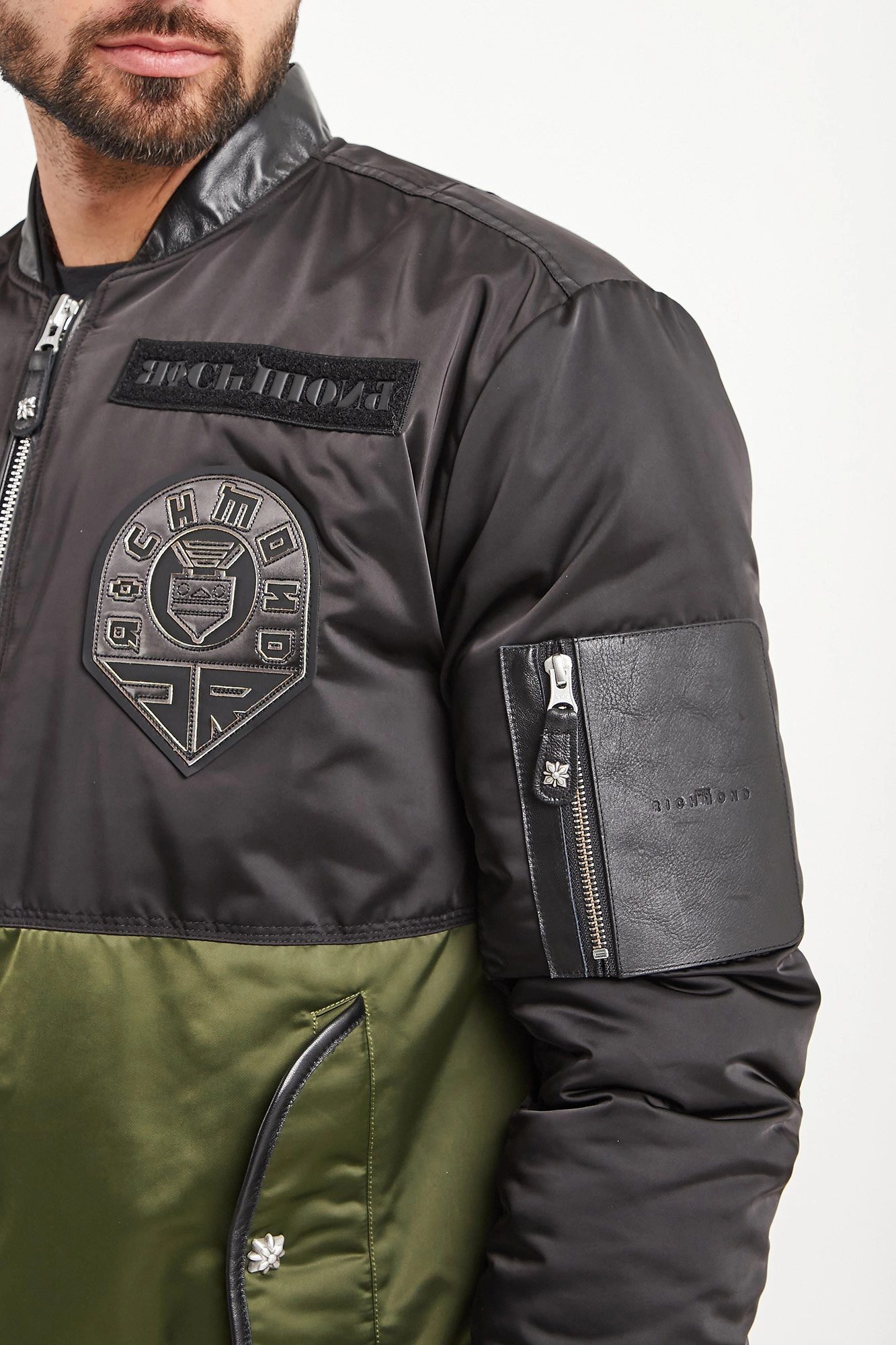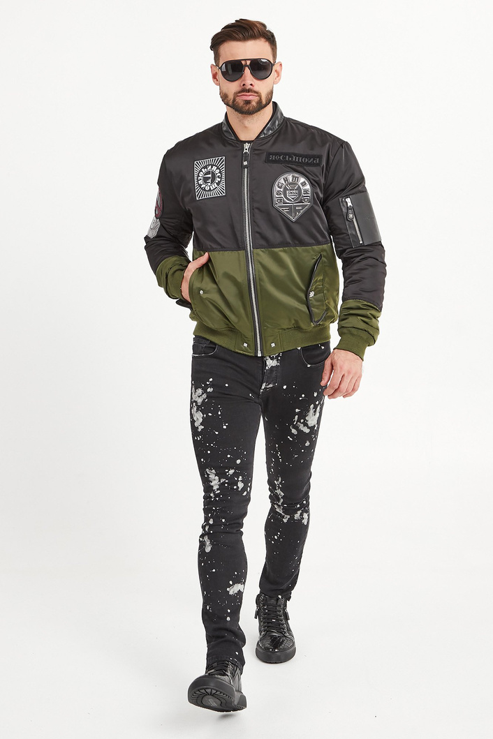 Efektowna, dwukolorowa bomberka o nieco luźniejszym fasonie. Dekolt wykończony skórzaną stójką. Zapinana na zamek z sygnowaną zawieszką. Z przodu liczne, wielokolorowe naszywki oraz dwie kieszenie. Rękawy i dół wykończone ściągaczem. Na jednym z nich kieszeń z dekoracyjnym zamkiem i tłoczeniem nazwy marki. Z tyłu, na wysokości karku aplikacja z metalowym logo. Kurtka wykonana z najwyższej jakości materiałów. Ciepła, lekka i stylowa.