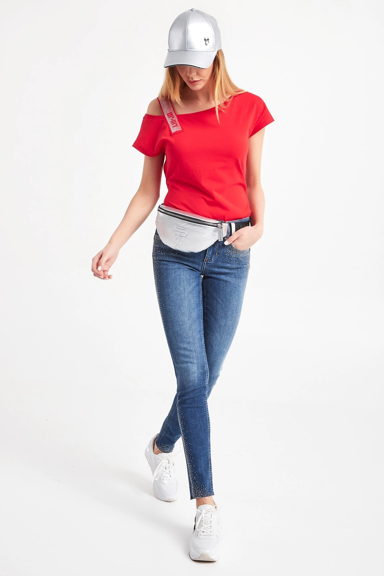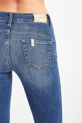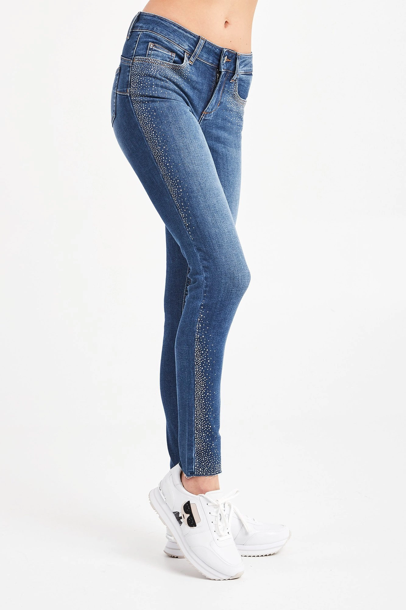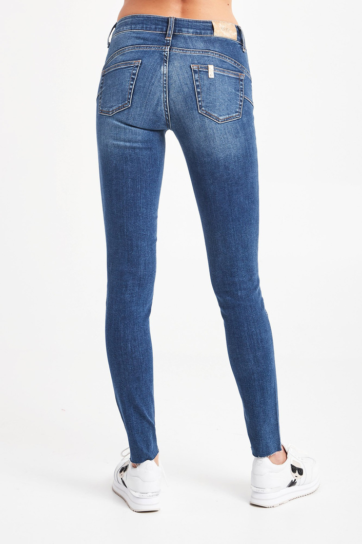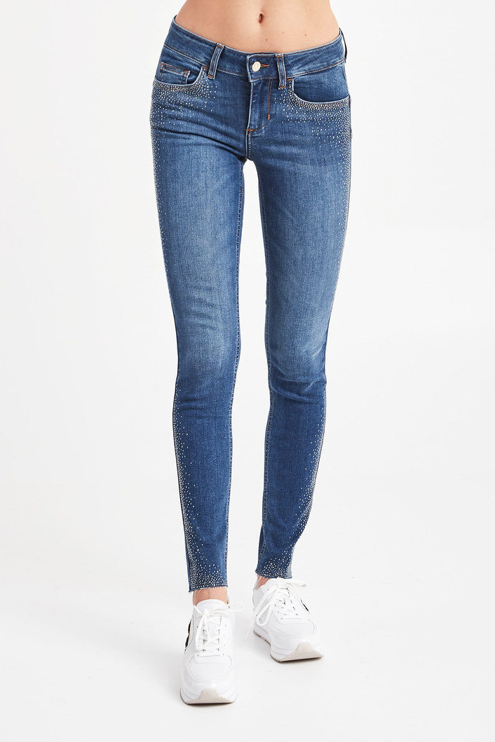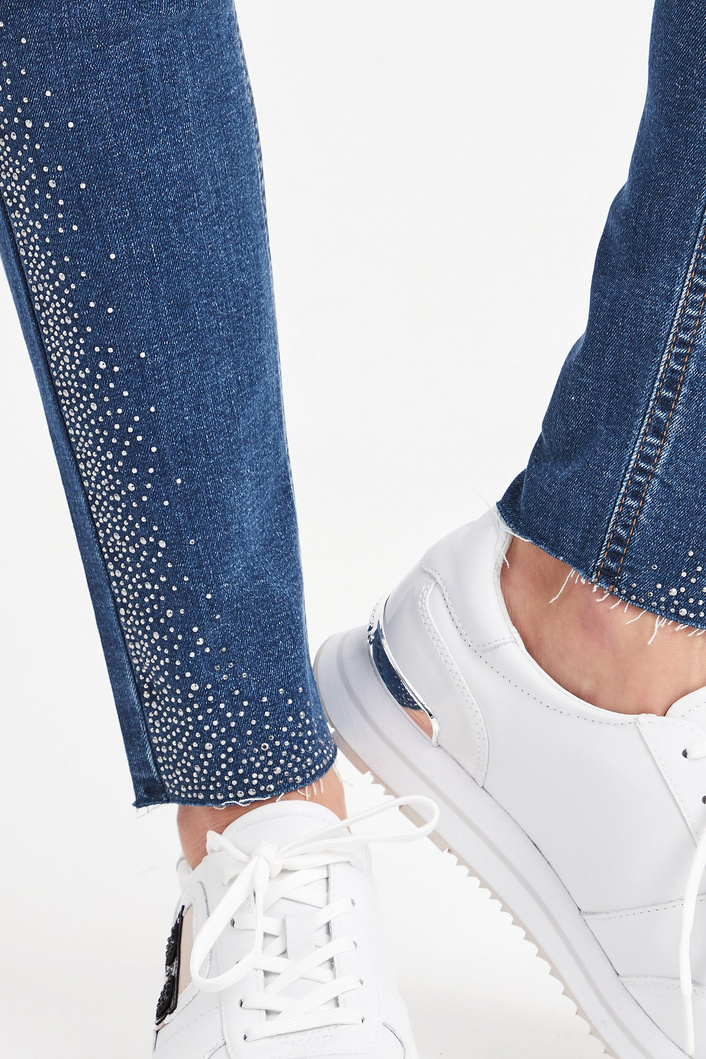 Jeansy w niebieskim kolorze. Fason bottom up. Zapinane na zamek i sygnowany guzik. Model z pięcioma kieszeniami. Wokół nich i na nogawkach połyskujące kryształki. Dół nogawek wykończony strzępieniem. Z tyłu naszywka z nazwą marki oraz aplikacja z kryształkiem. Jeansy wykonane z wysokiej jakości materiału. Wygodne i lekko elastyczne.