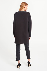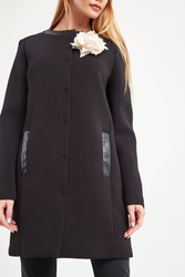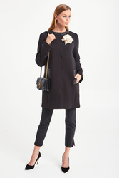 Kobiecy płaszcz w czarnym kolorze. Fason prosty. Zapinany na napy. Z przodu dekoracyjna broszka w postaci kremowego kwiatu. Poniżej dwie kieszenie. Z tyłu niewielka logowana aplikacja. Płaszcz wykonany z wysokiej jakości materiału. Ponadczasowy i wygodny.