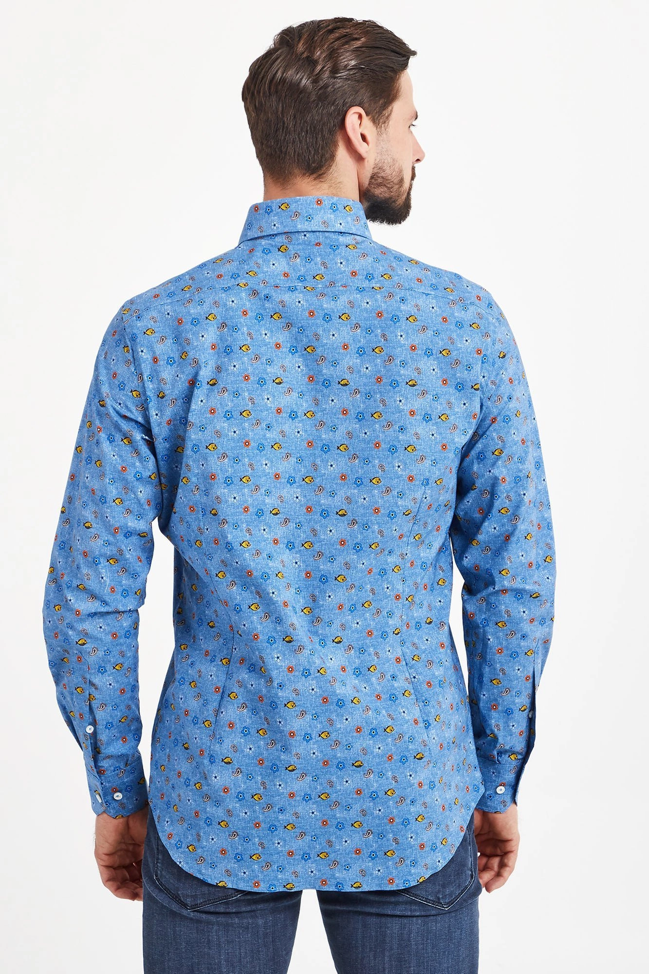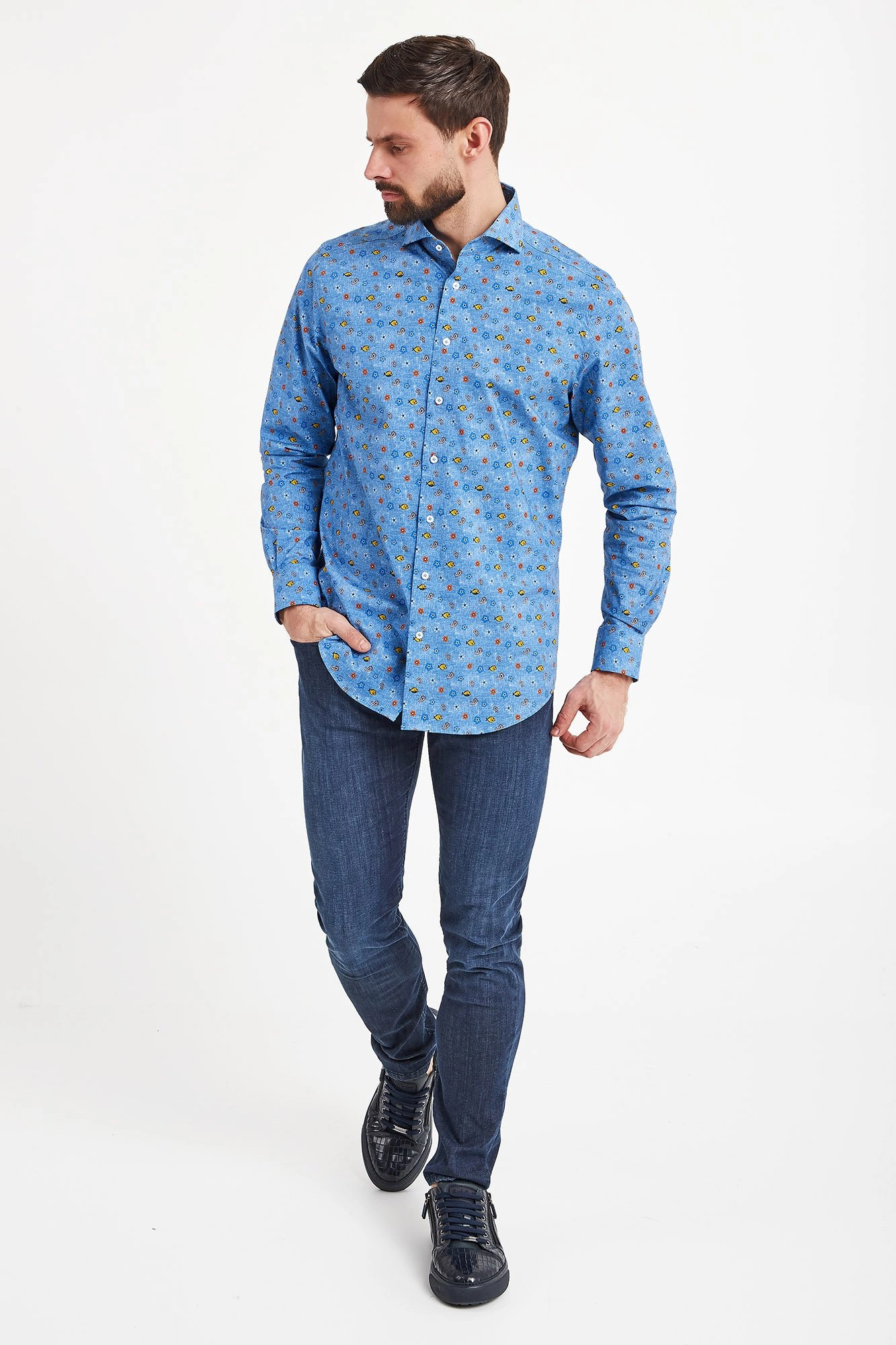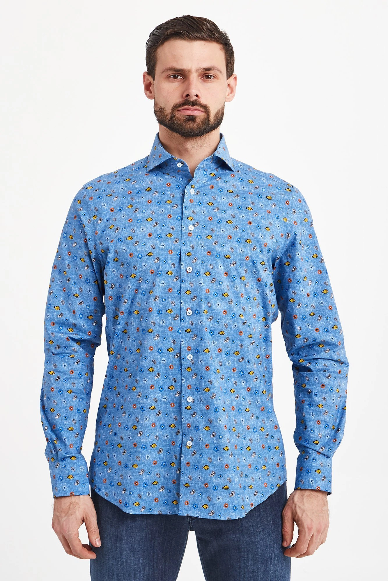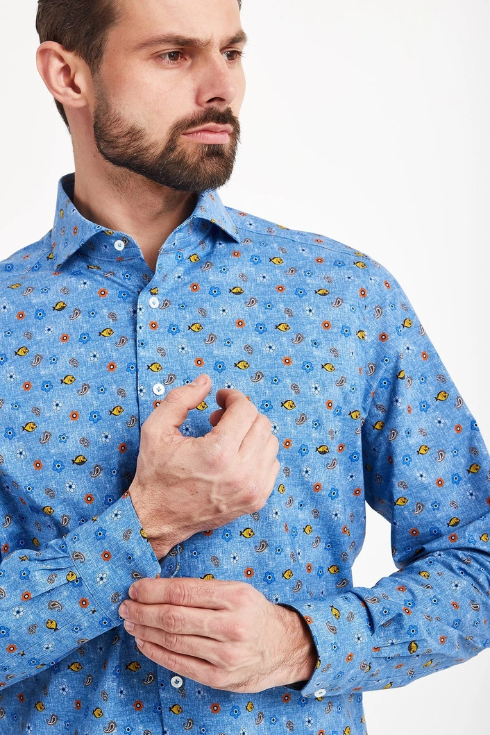Koszula w błękitnym kolorze. Zapinana na niewielkie guziki. Fason modern fit. Na całości kolorowy wzór. Rękawy wykończone prostym mankietem zapinanym na jeden guzik. Koszula wykonana z wysokiej jakości bawełny. Elegancka, stylowa i ponadczasowa. Fantazyjna propozycja zarówno do dziennych, jak i wieczorowych stylizacji.