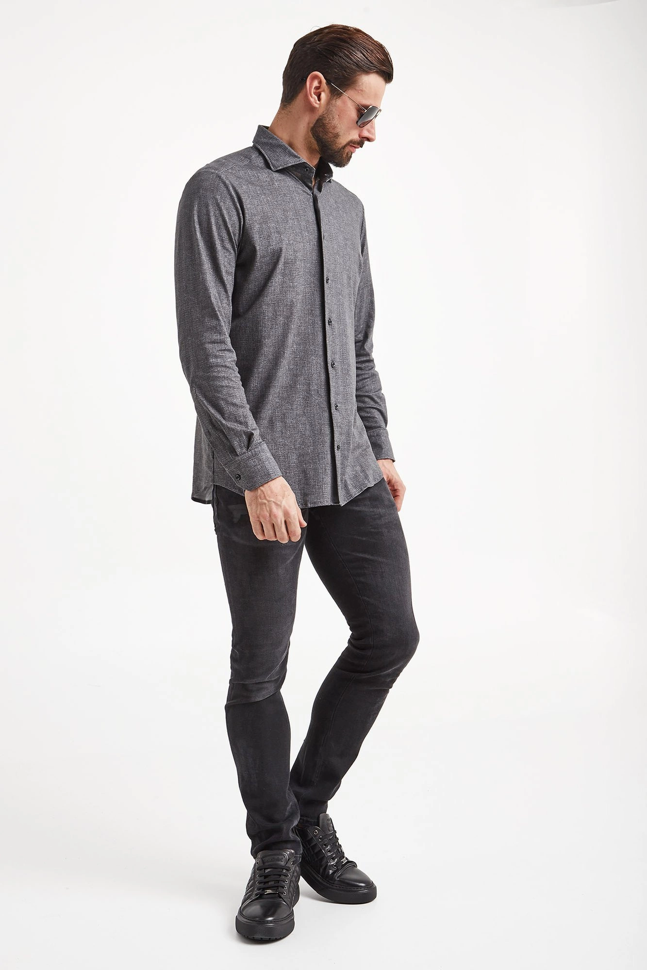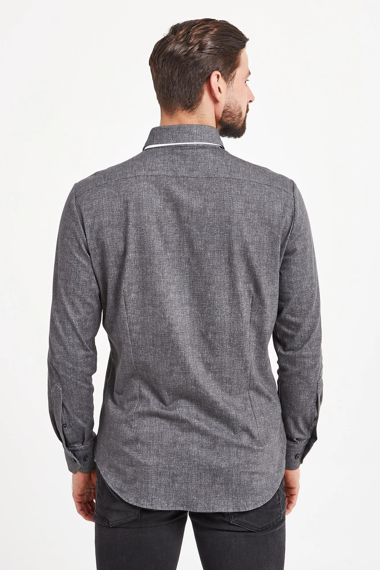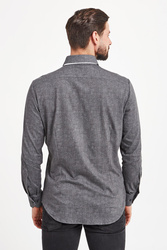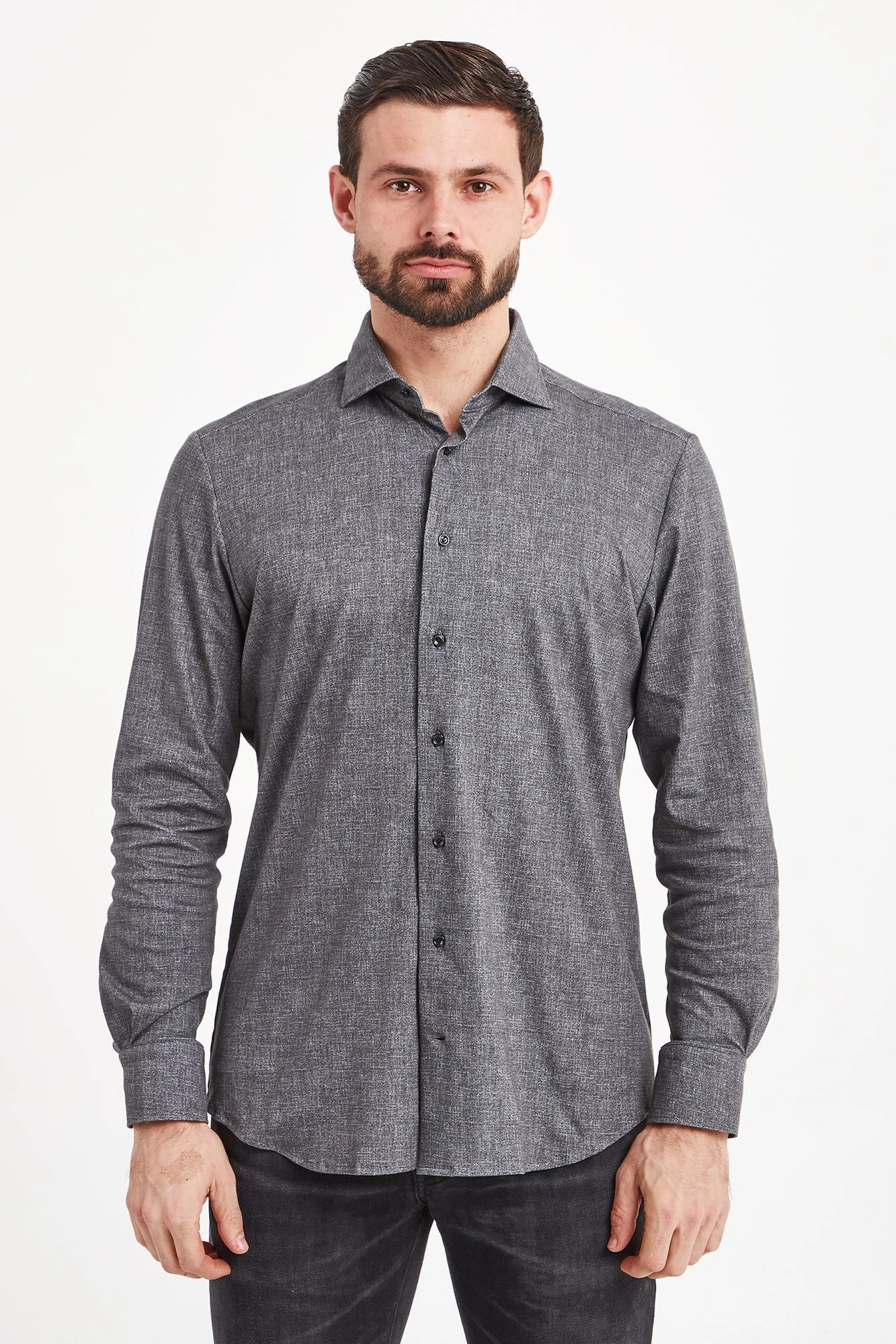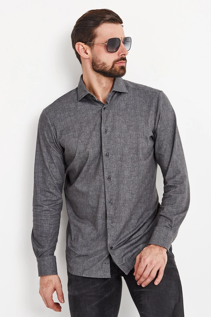 Koszula w grafitowym kolorze. Zapinana na niewielkie guziki. Fason slim fit. Na całości melanżowy wzór. Rękawy wykończone prostym mankietem zapinanym na jeden guzik. Koszula wykonana z wysokiej jakości bawełny z dodatkiem elastanu. Elegancka, stylowa i ponadczasowa. Fantazyjna propozycja zarówno do dziennych, jak i wieczorowych stylizacji.
