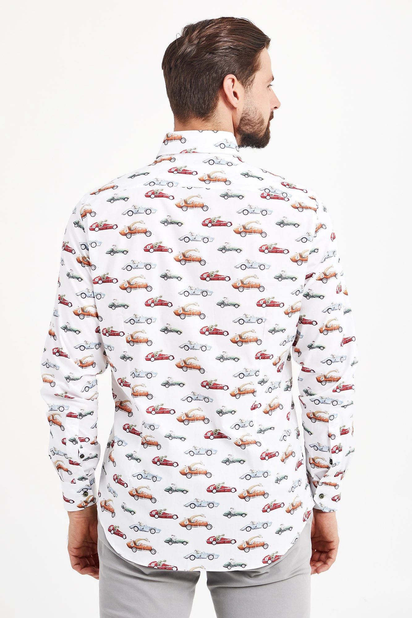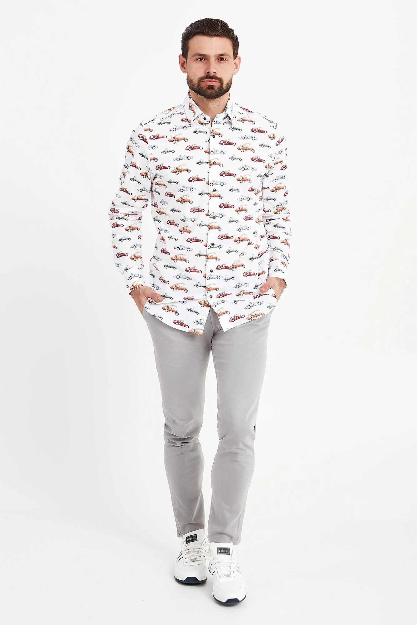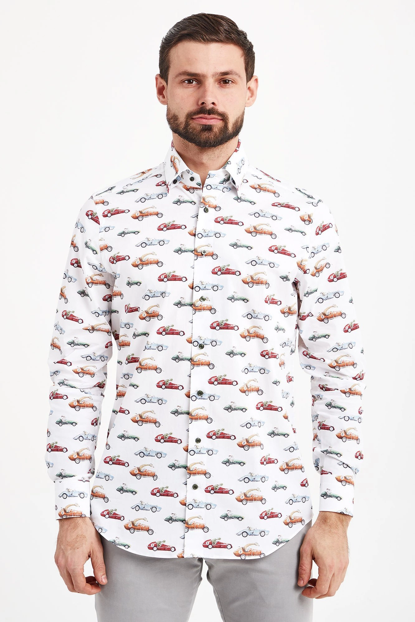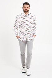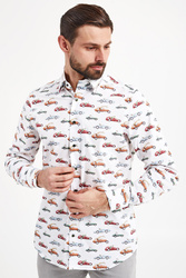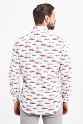 Koszula w białym kolorze. Zapinana na niewielkie guziki. Fason modern fit. Na całości kolorowy wzór w samochodziki. Rękawy wykończone prostym mankietem zapinanym na jeden guzik. Koszula wykonana z wysokiej jakości bawełny. Elegancka, stylowa i ponadczasowa. Fantazyjna propozycja zarówno do dziennych, jak i wieczorowych stylizacji.
