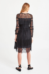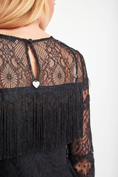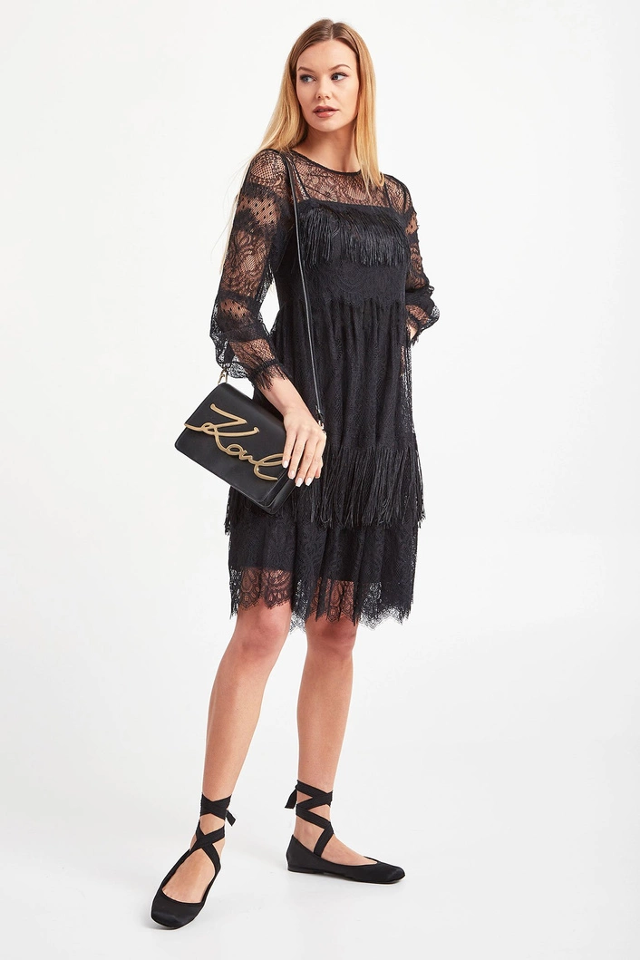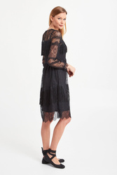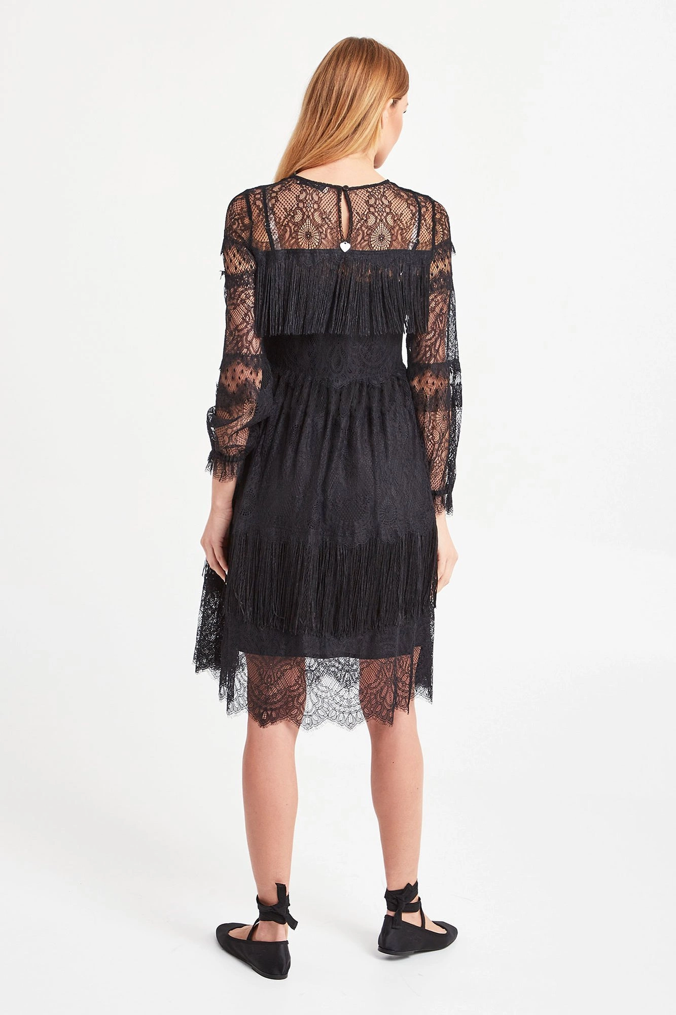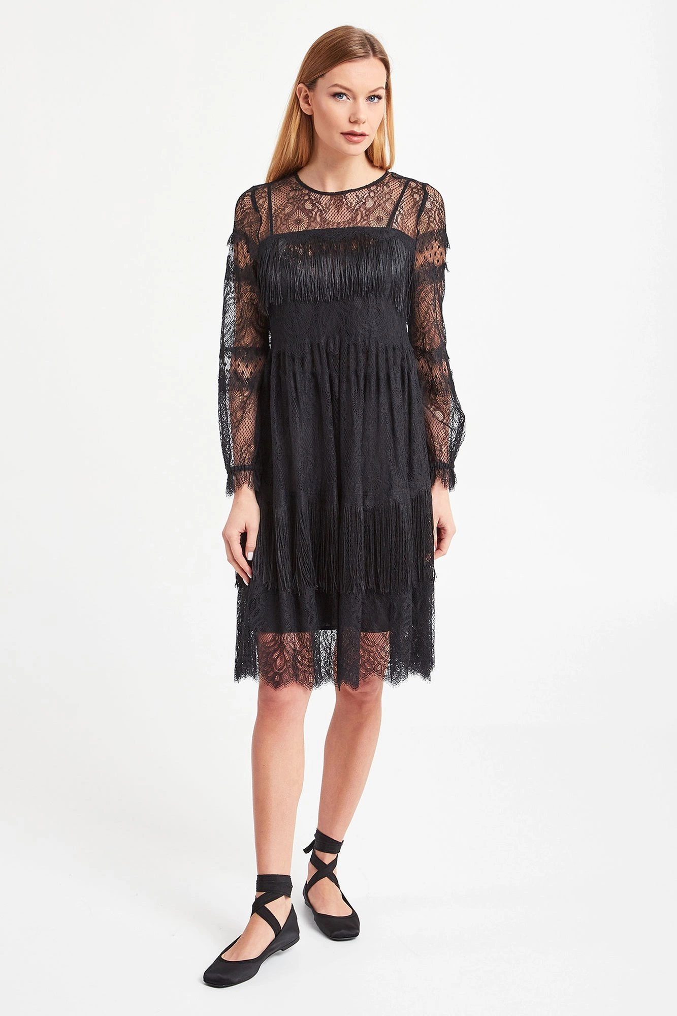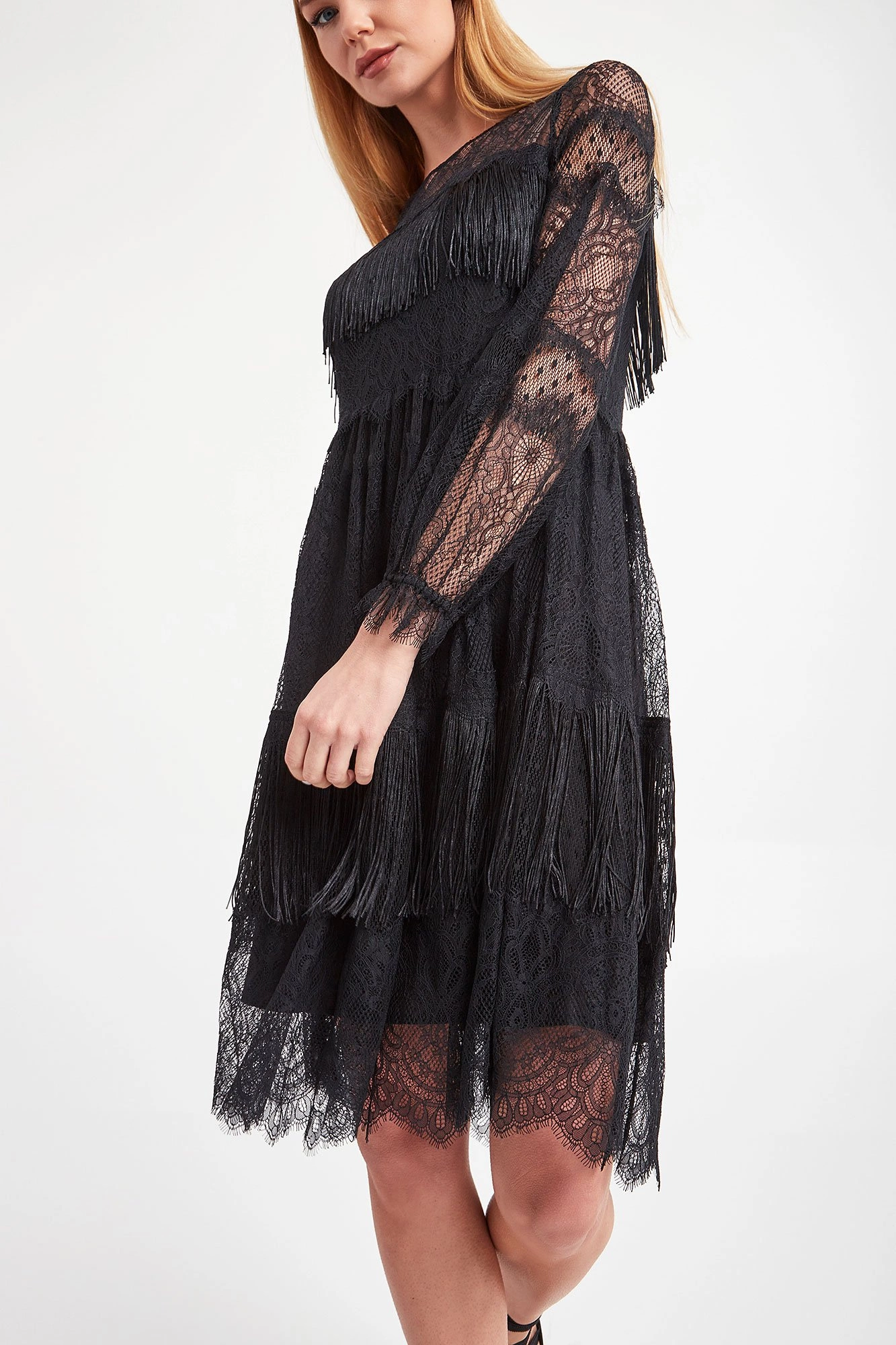Koronkowa sukienka w czarnym kolorze. Zapinana z boku. Dekolt typu o-neck. Długie, lekko transparentne rękawy. Rozkloszowany dół. Na całości dekoracyjne frędzle. Długość mini. W komplecie halka. Sukienka wykonana z najwyższej jakości, zwiewnego materiału. Elegancka i ponadczasowa. Doskonała propozycja do wielu wieczorowych stylizacji.