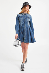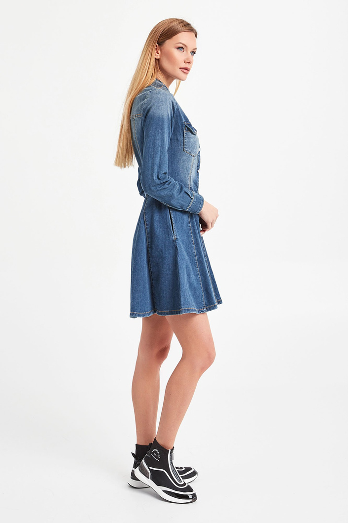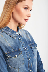 Jeansowa sukienka typu szmizjerka. Dekolt wykończony kołnierzykiem wysadzanym połyskującymi kryształkami. Zapinana na napy. Na całości delikatne przetarcia. Dół rozkloszowany. Z tyłu, na wysokości karku serduszko. Długość mini. Sukienka wykonana z wysokiej jakości bawełny z dodatkiem elastanu. Ponadczasowa i kobieca.