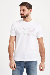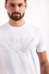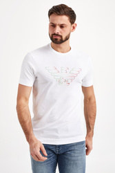 Biały t-shirt o prostym fasonie. Z przodu duży nadruk z logo marki. Dekolt okrągły. T-shirt wykonany z najwyższej jakości bawełny. Przewiewny i ponadczasowy.