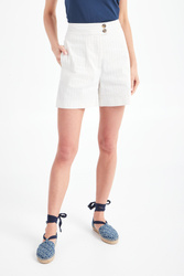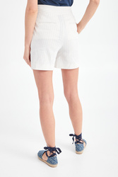 Eleganckie spodenki w białym kolorze. Zapinane na zamek i dwa guziki z logo. Po bokach dwie kieszenie. Na całości paski. Spodenki wykonane z najwyższej jakości materiału z bawełnianą podszewką. Przewiewne i stylowe.