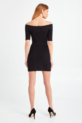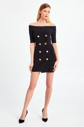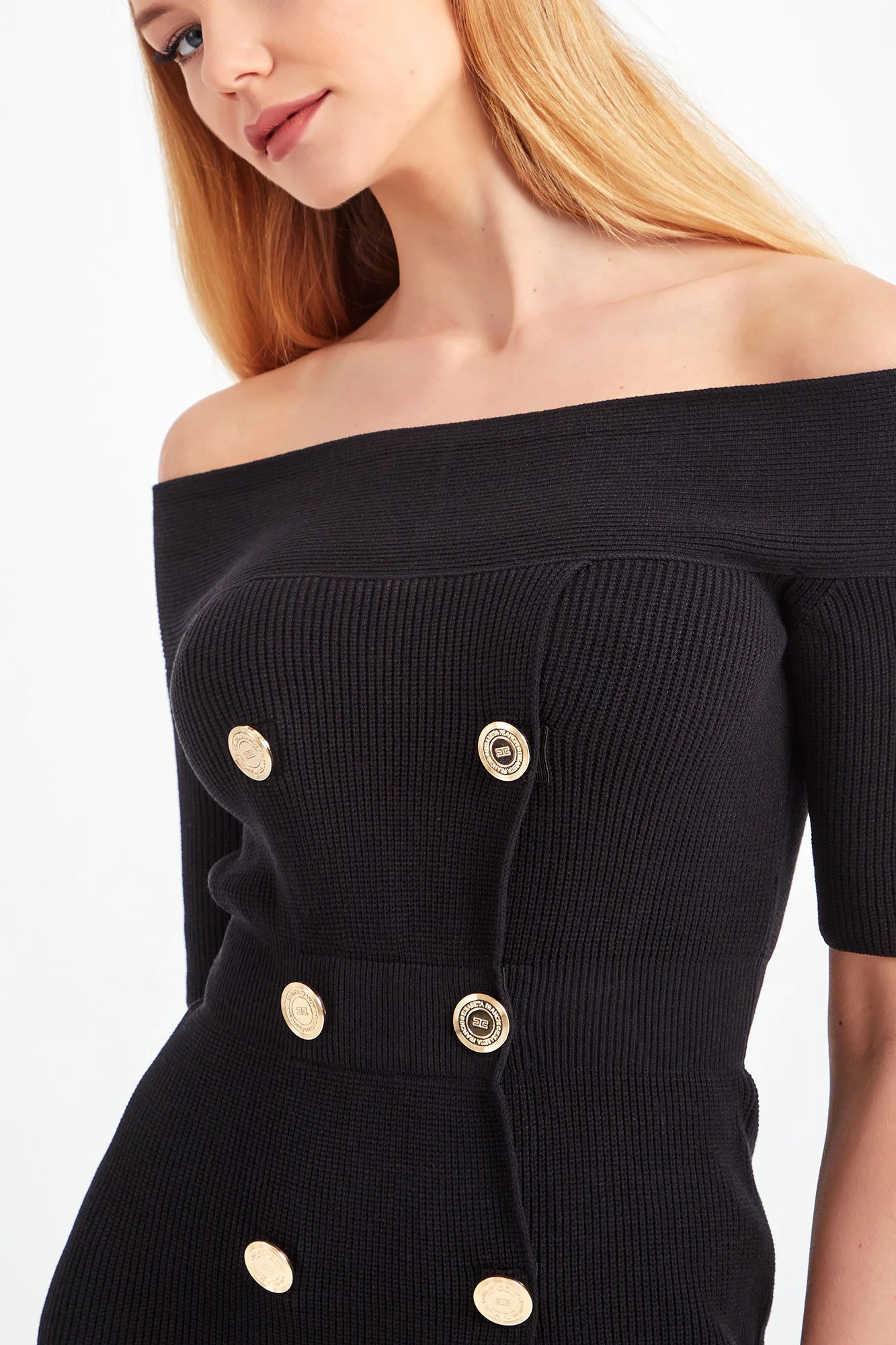 Sukienka w czarnym kolorze o dopasowanym fasonie. Na całości prążki. Z przodu logowane guziki. Dekolt w hiszpańskim stylu. Sukienka wykonana z najwyższej jakości materiału. Ponadczasowa i bardzo kobieca.