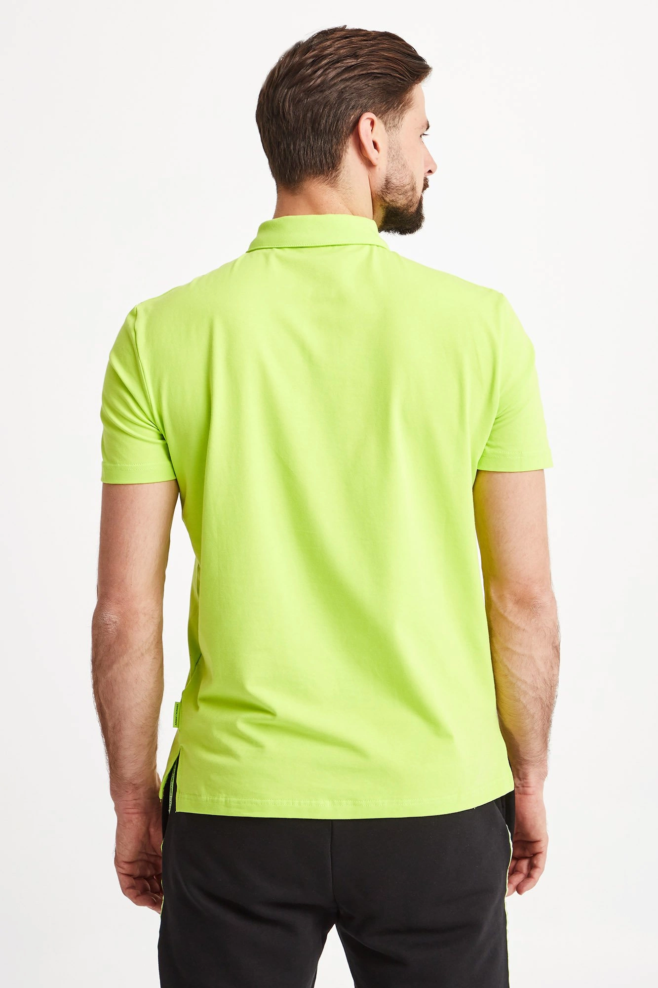 Klasyczne polo w limonkowym kolorze. Fason lekko dopasowany. Zapinane na guziki. Z przodu czarno-szary nadruk z nazwą marki. T-shirt wykonany z wysokiej jakości bawełny. Przewiewny i lekki.