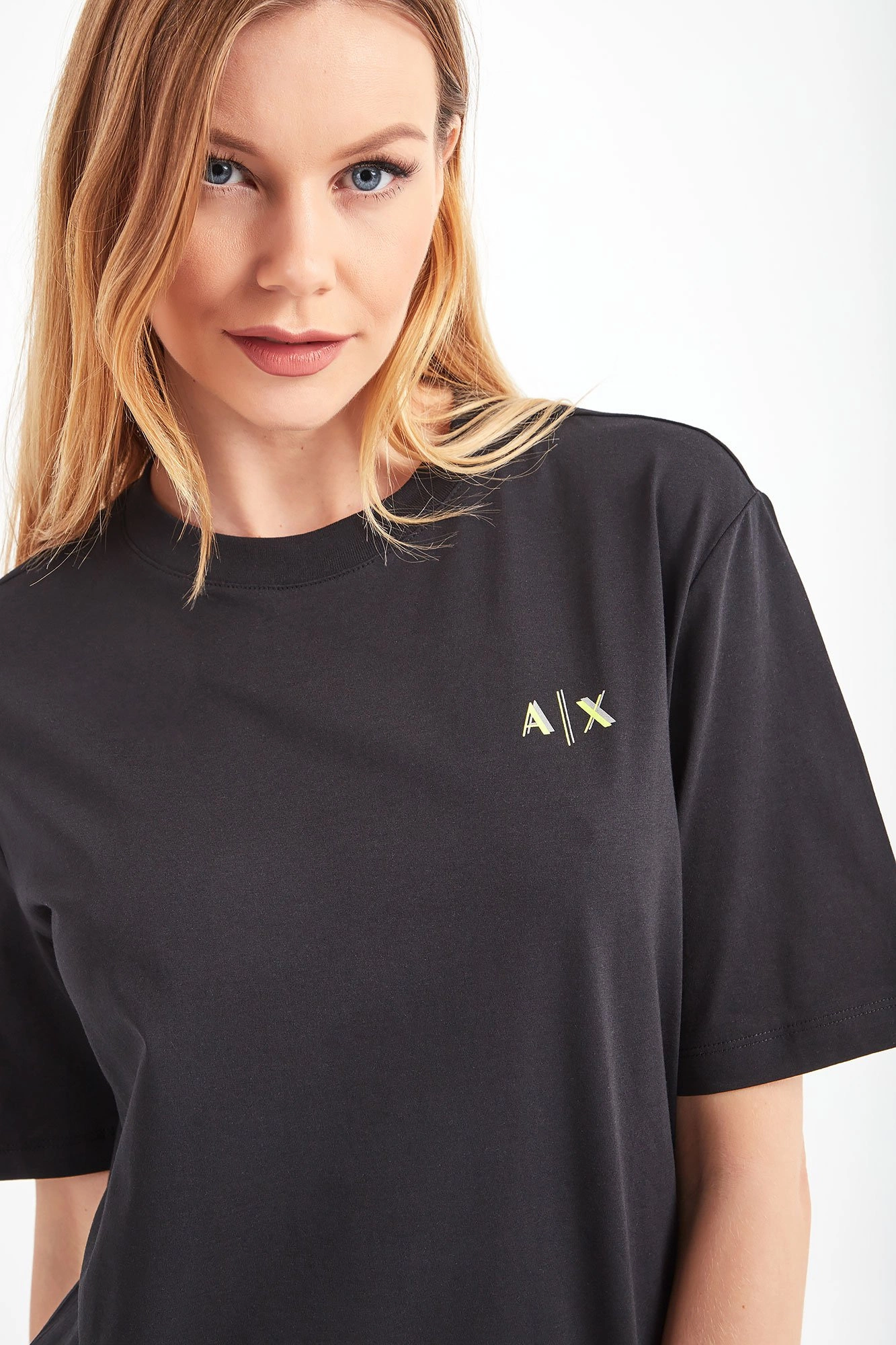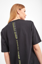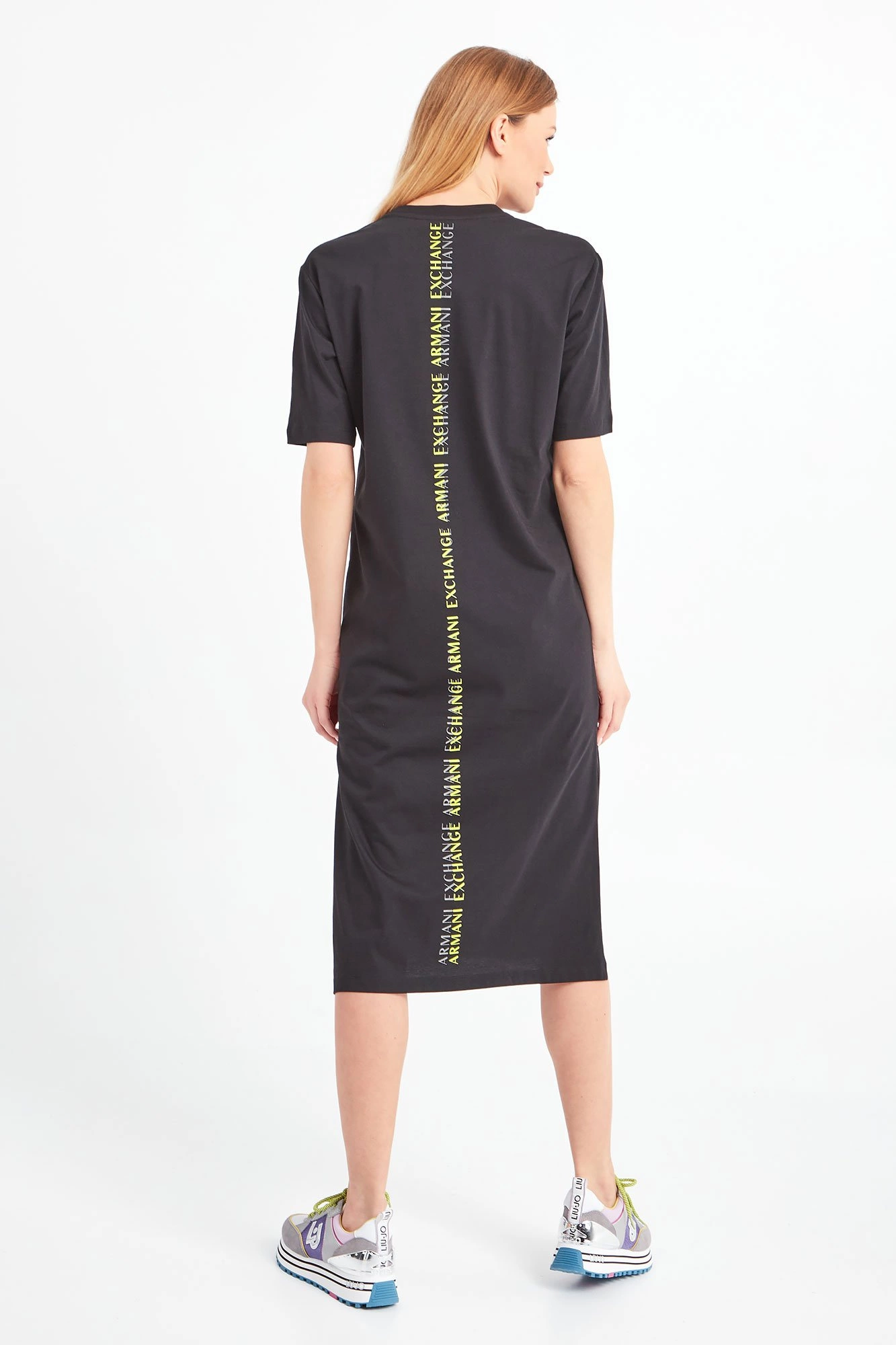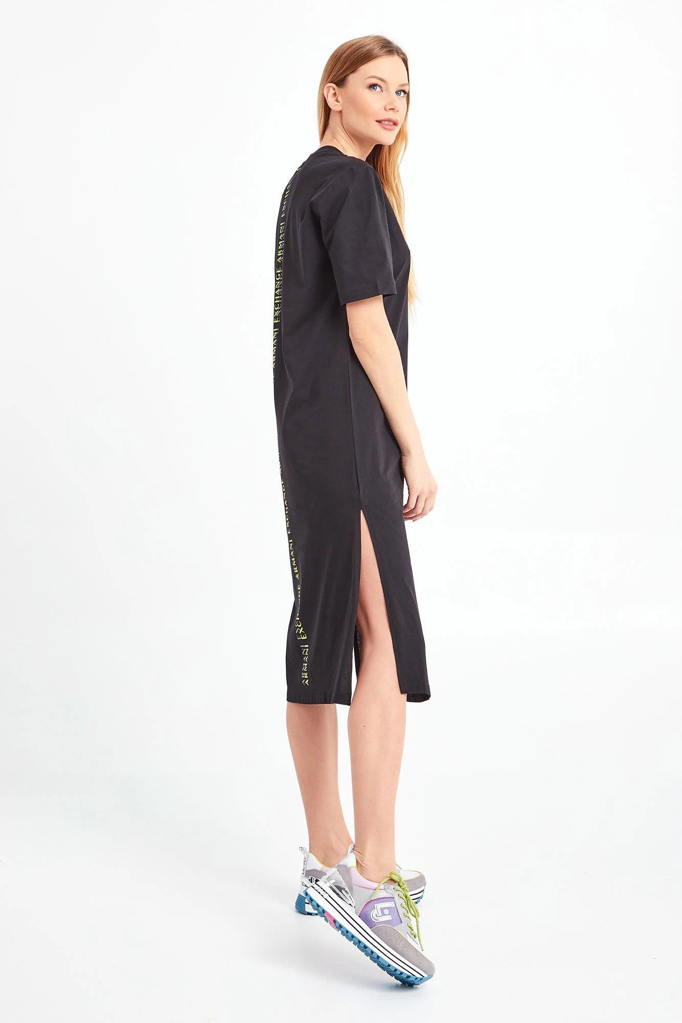 Sukienka w czarnym kolorze o fasonie relaxed fit. Dekolt typu o-neck. Z przodu i z tyłu nadruk logo i nazwy marki w srebrnym i limonkowym kolorze. Po bokach ozdobne rozcięcia. Sukienka wykonana z wysokiej jakości bawełny. Długość midi. Wygodna i stylowa.