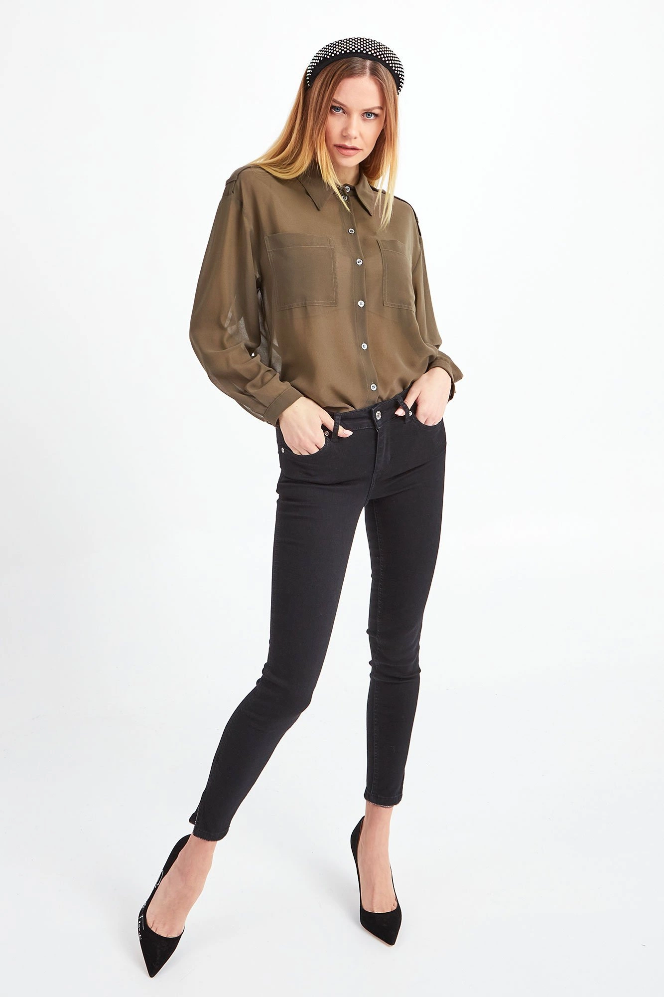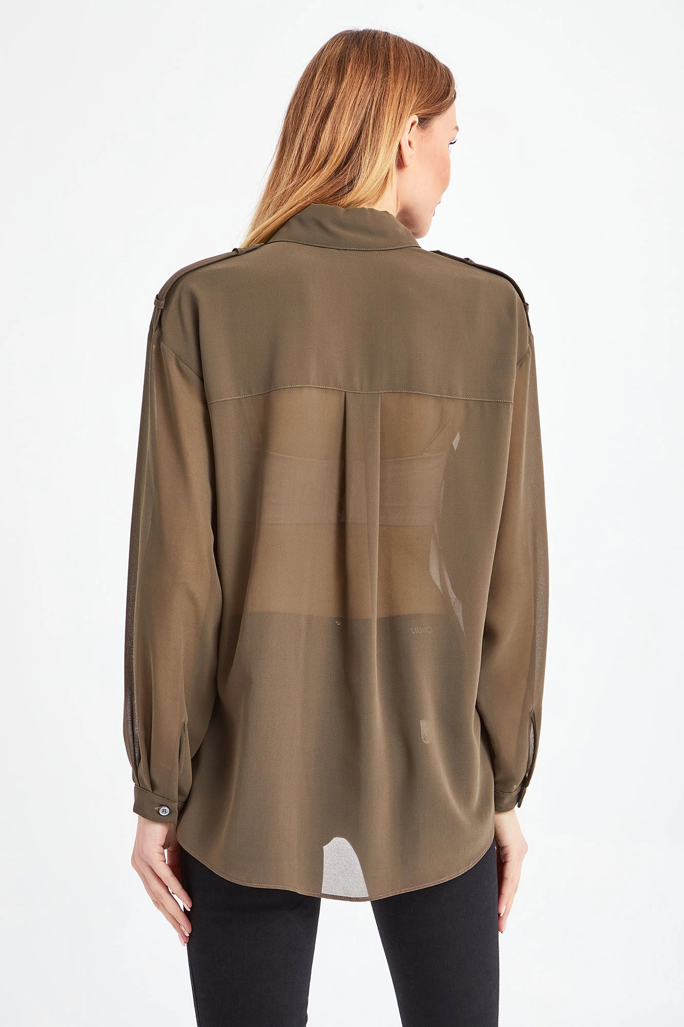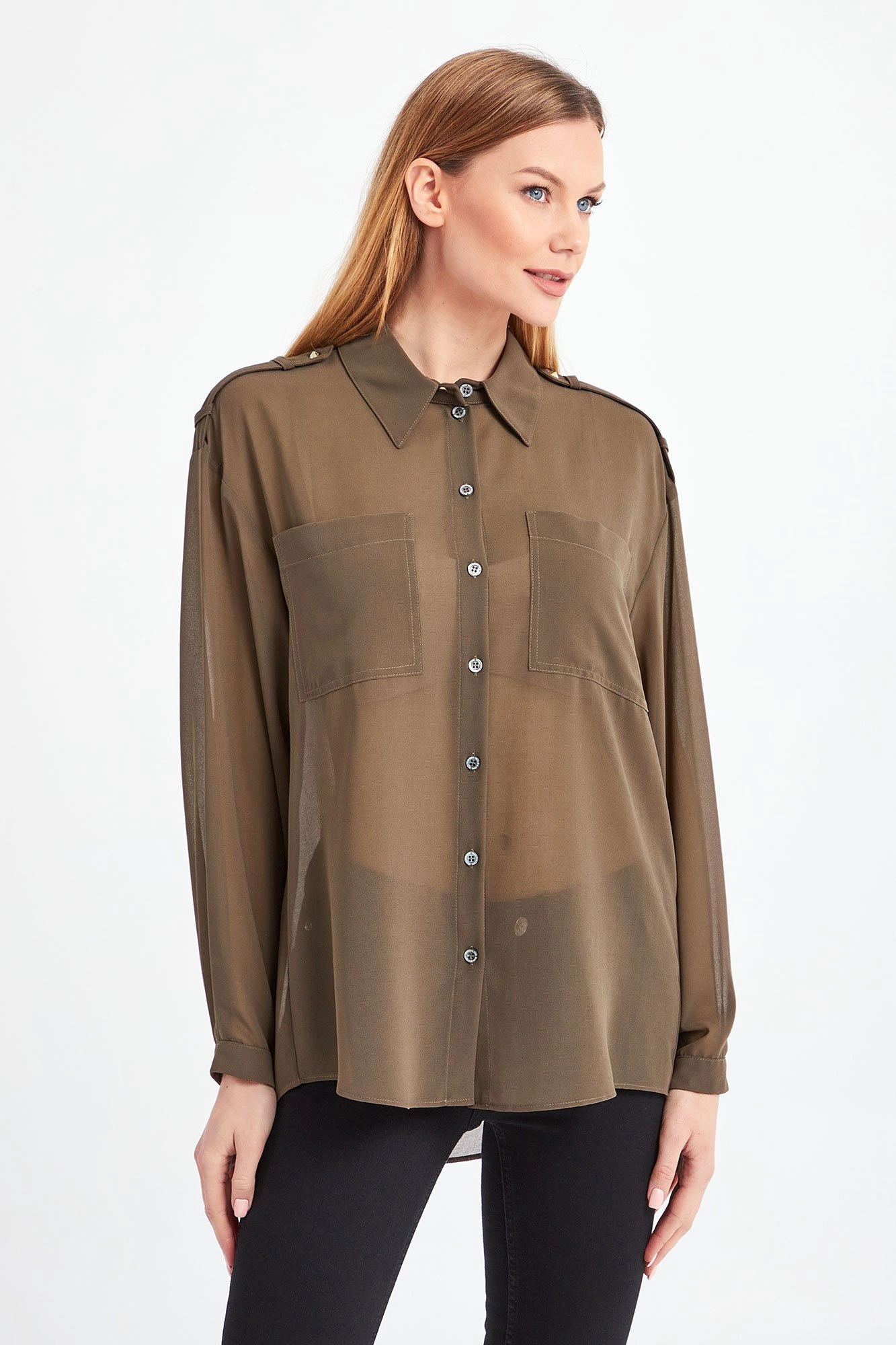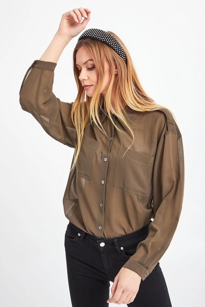 Transparentna koszula w kolorze zgniłej zieleni (mangrove green). Zapinana na sygnowane guziki. Z przodu dwie niezapinane kieszenie. Mankiety proste, zapinane na jeden guzik. Fason nieco luźniejszy. Na ramionach pagony zdobione złotą aplikacją z tłoczeniem logo marki. Tył dłuższy niż przód. Koszula wykonana z najwyższej jakości materiału. Lekka i zwiewna.