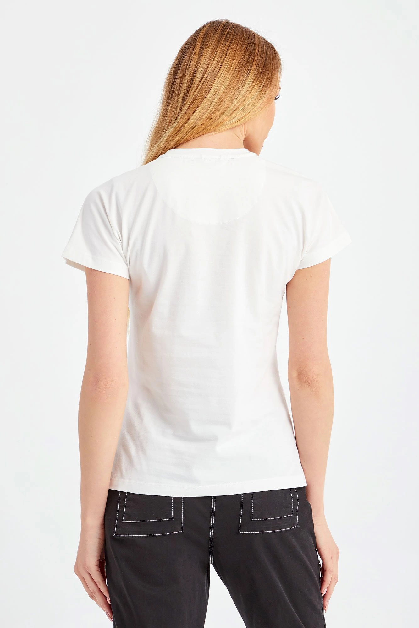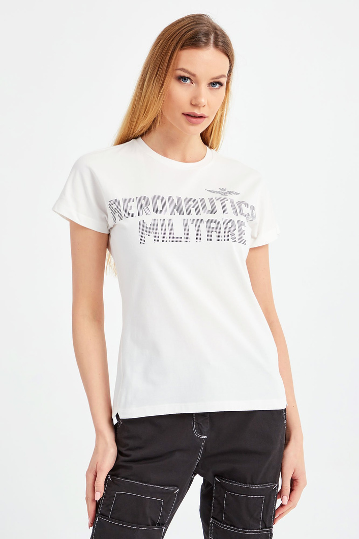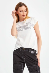 Biały t-shirt o nieco luźniejszym fasonie. Z przodu duży nadruk z logo i nazwa marki. Dekolt typu o-neck. T-shirt wykonany z najwyższej jakości bawełny z dodatkiem elastanu. Lekki i przewiewny.
