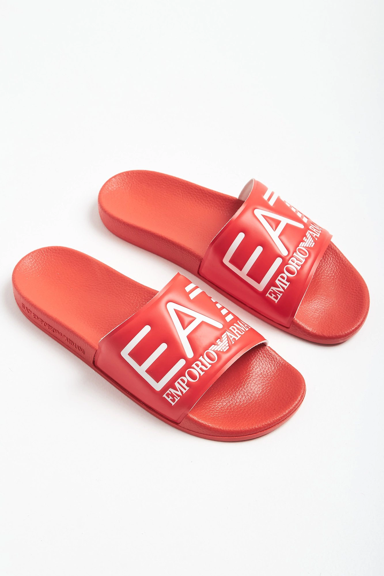 Klapki marki EA7 Emporio Armani. Czerwone z białymi elementami. Na szerokim czerwonym pasku białe, tłoczony monogram marki. Z zewnętrznej strony podeszwy tłoczone logo. Gruba podeszwa profilowana tak, by ułatwiać wygodne chodzenie. Lekkie, komfortowe i przyjemne w noszeniu. Idealnie sprawdzą się w każdym wiosenno-letnim looku, nadając mu stylu, nietuzinkowości i charakteru.