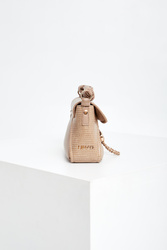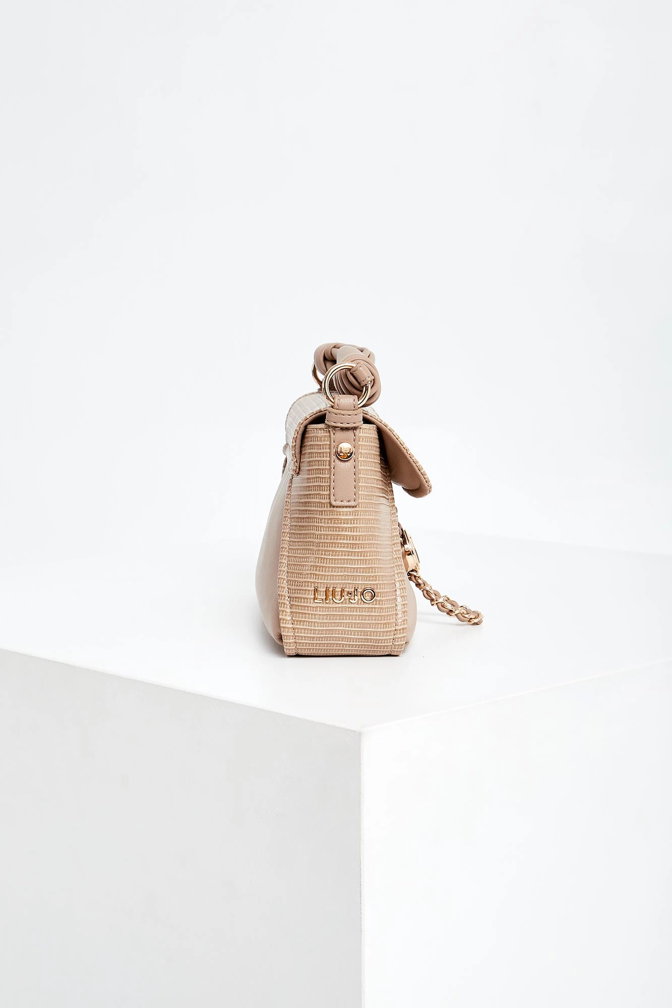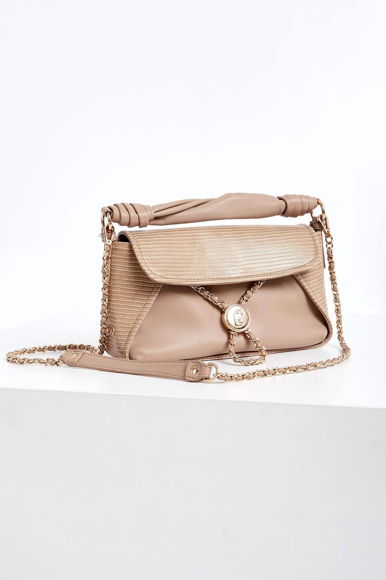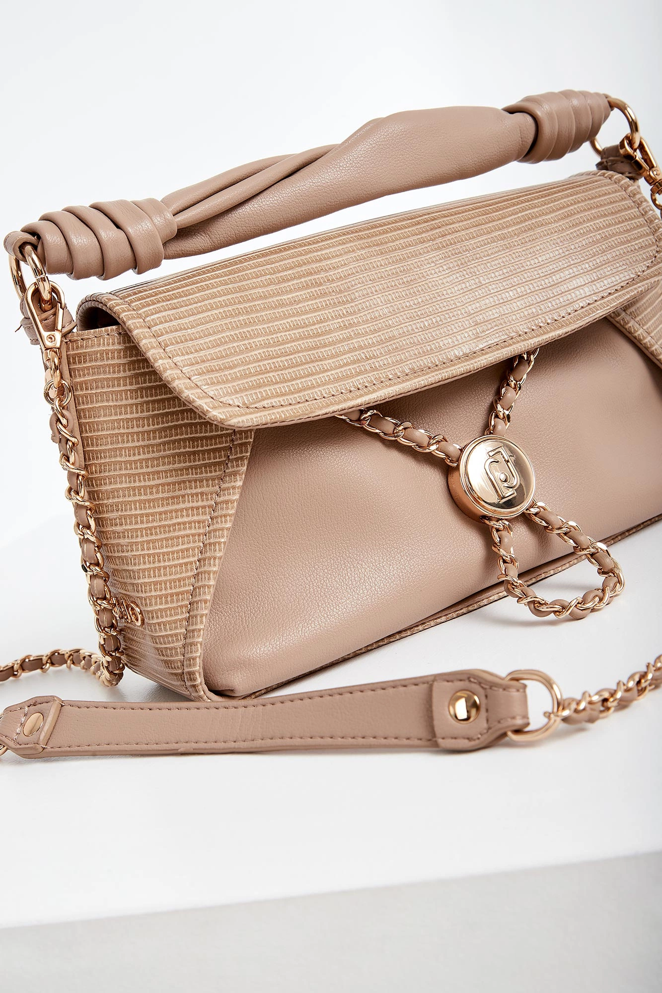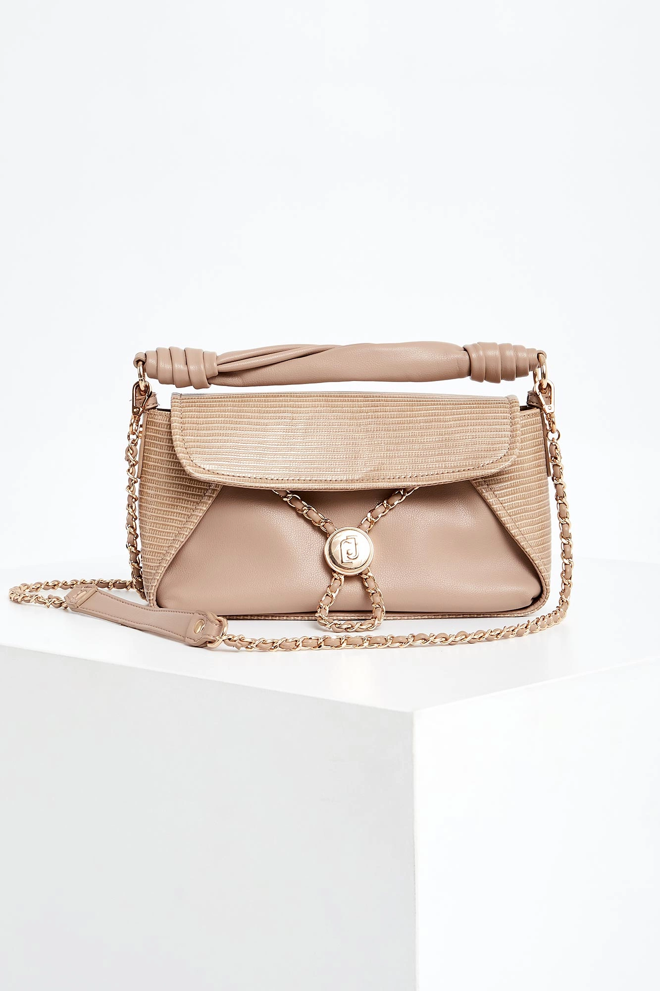 Torebka marki Liu Jo w kolorze beżowym. Klapa zapinana na metalowe zapięcie. Z przodu aplikacja z logo marki na łańcuszku. Klapa i boki z tłoczeniem. Do noszenia w ręku i na ramieniu. W komplecie złoty łańcuszek mocowany karabińczykami. Wewnątrz różowa podszewka, bez kieszeni.