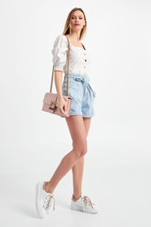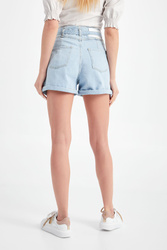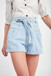 Spodenki jeansowe w niebieskim kolorze. Zapinane na zamek i guzik. Model z czterema kieszeniami. W komplecie pasek do przewiązania. Nogawki z podwinięciem Z tyłu na pasku biała aplikacja z tłoczeniem nazwy marki. Spodenki wykonane z wysokiej jakości bawełny. Wygodne i ponadczasowe.
