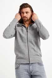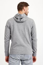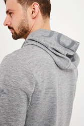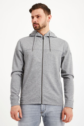 Bluza z kapturem marki Joop! w kolorze szarego melanżu. Fason regular fit. Zapinana na zamek. Kaptur zdobiony szarą aplikacją nazwy marki, regulowany za pomocą troczków. Rękawy wykończone ściągaczem. Bluza wykonana z wysokiej jakości materiału.
