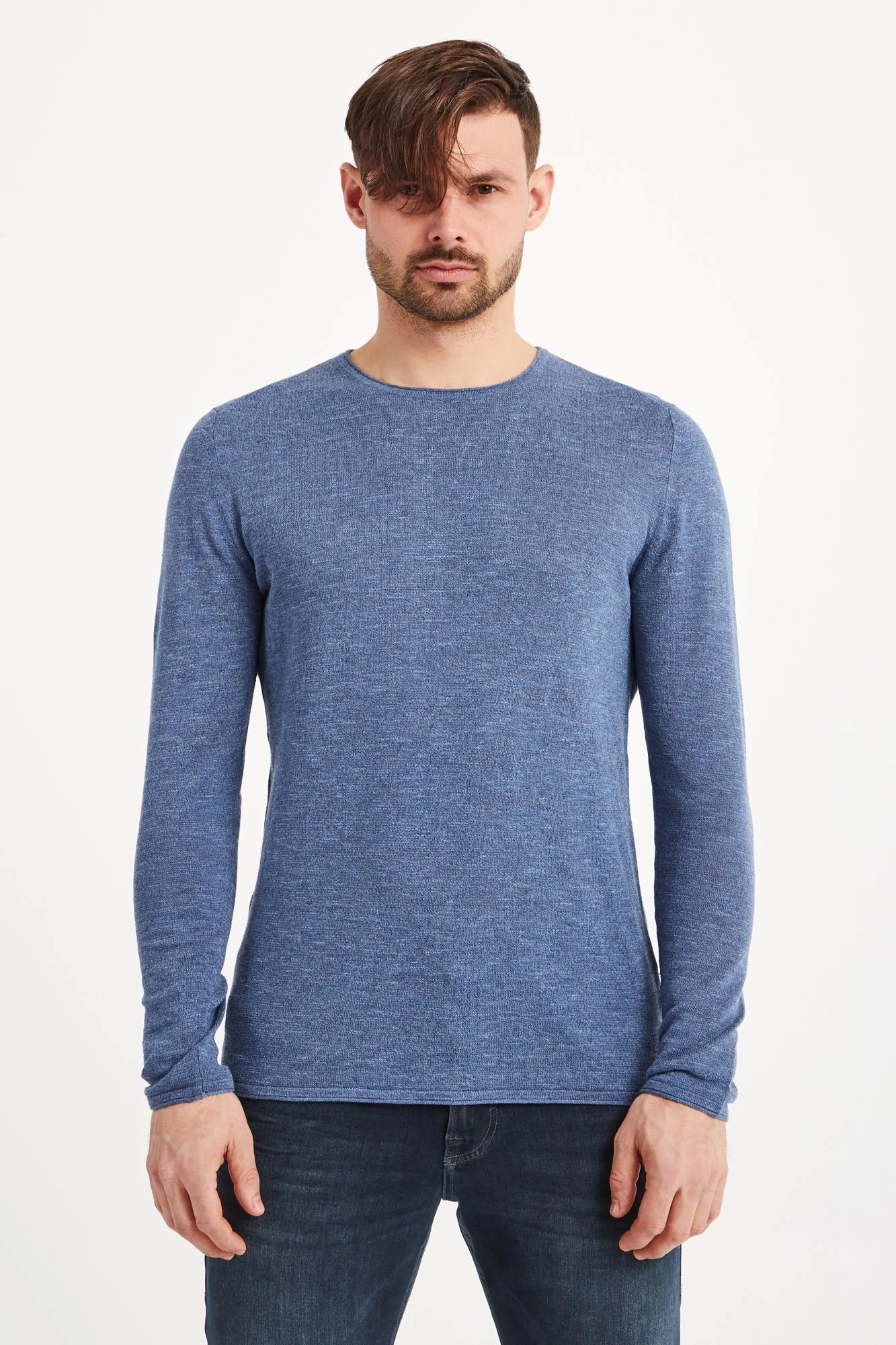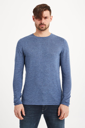 Sweter w kolorze niebieskiego melanżu. Fason regular fit. Dekolt typu o-neck. Rękawy, dół i dekolt wykończone podwinięciem. Sweter wykonany z wysokiej jakości materiału z lnem i bawełną.