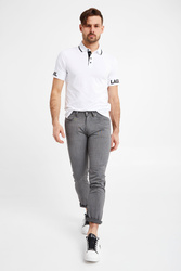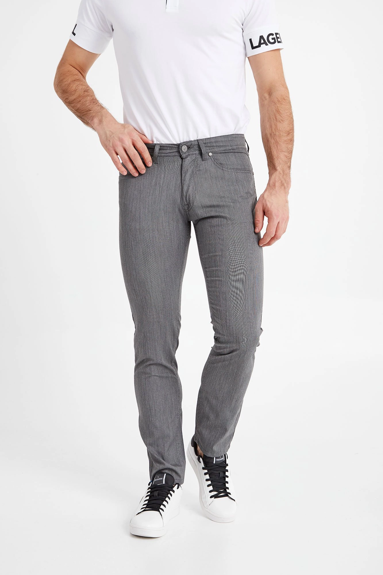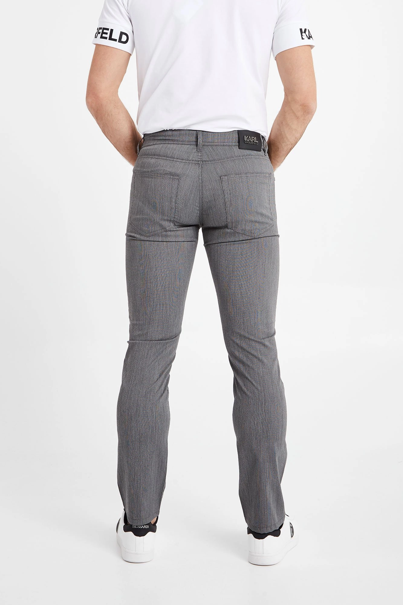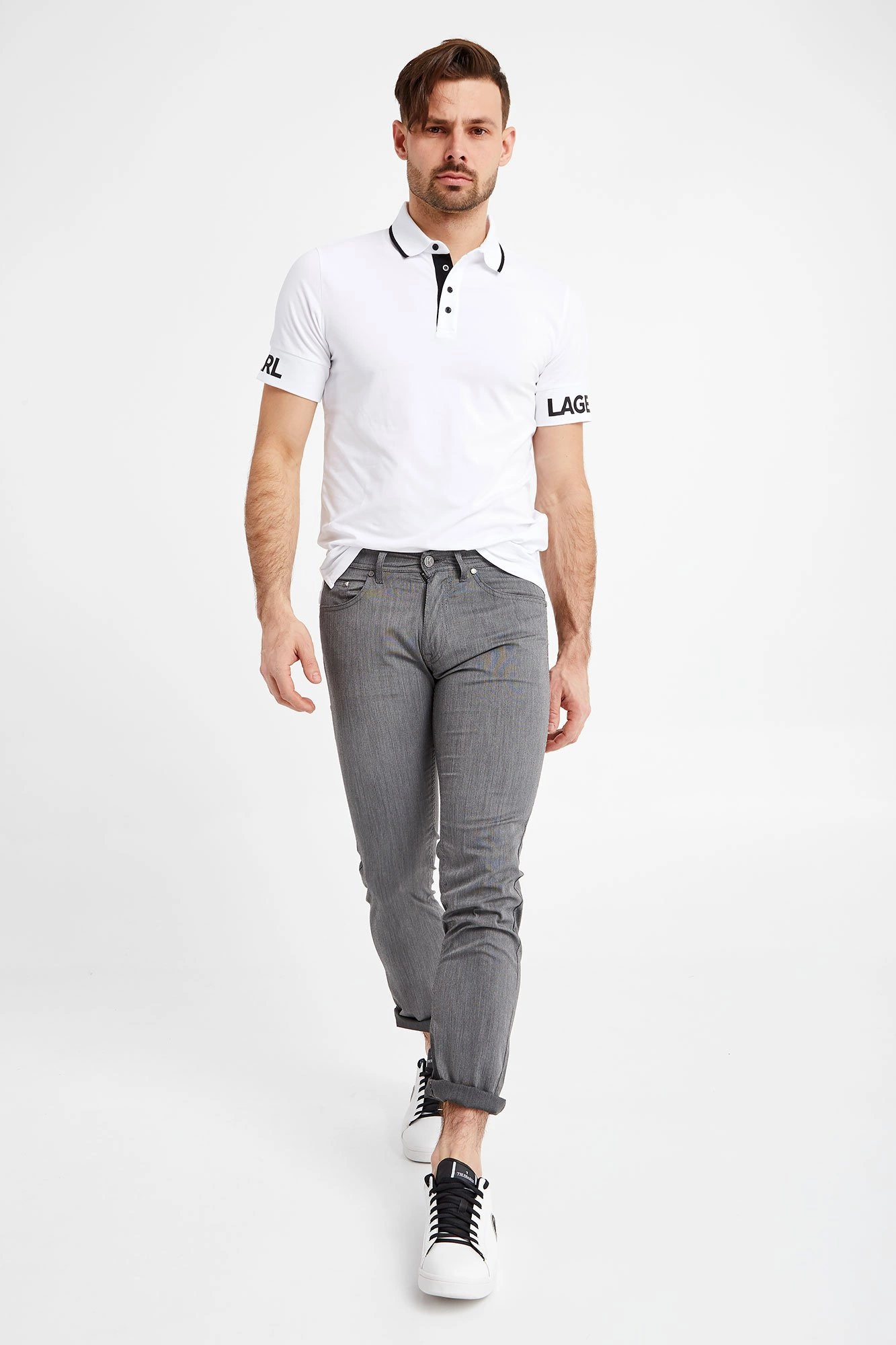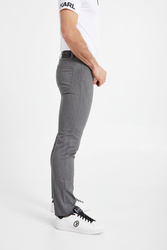 Casualowe spodnie w kolorze szarego melanżu. Zapinane na zamek i logowany guzik. Pięciokieszeniowe. Ponadczasowa klasyka, pasująca do każdego typu stylizacji.