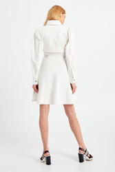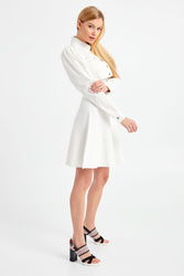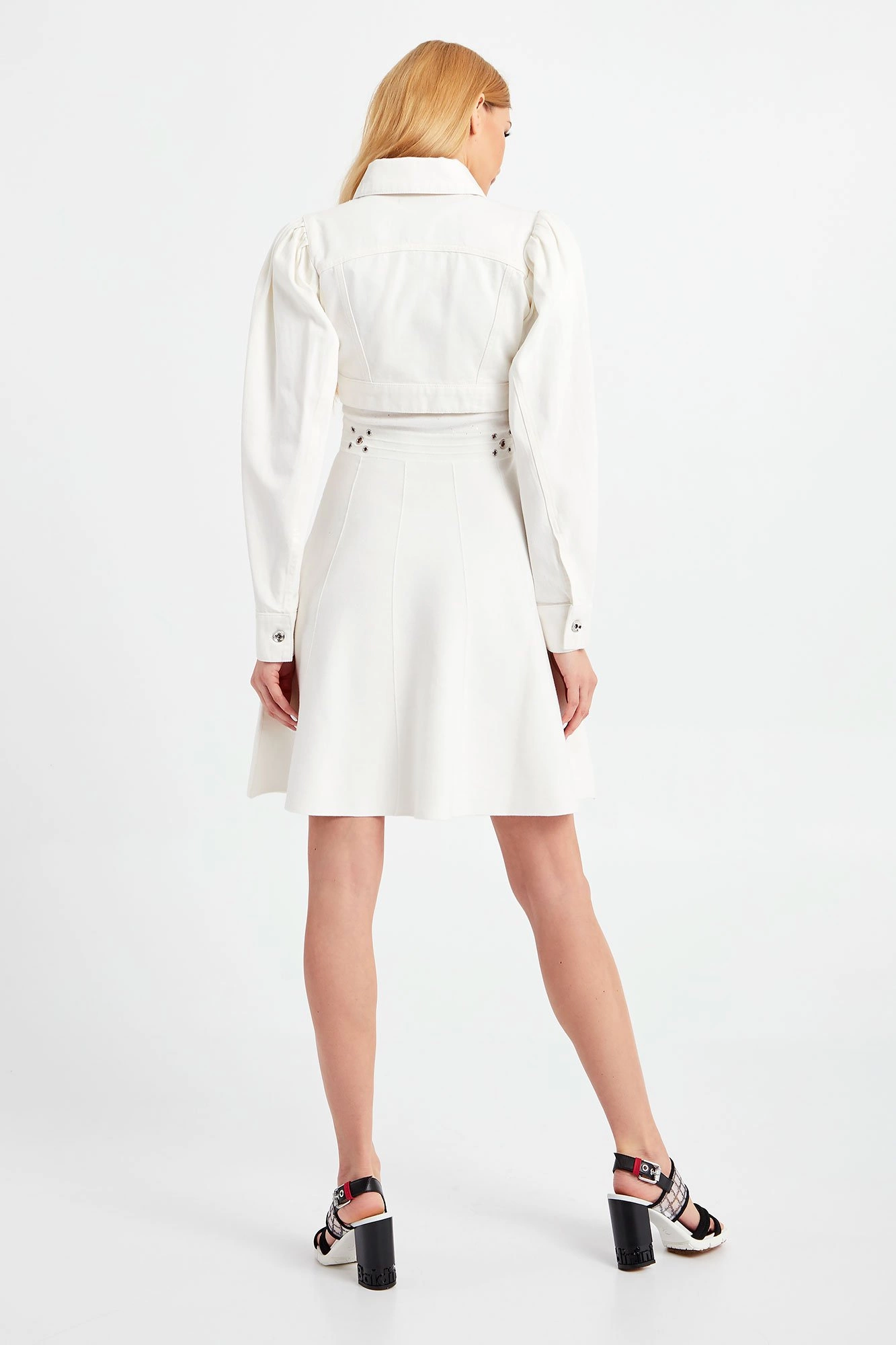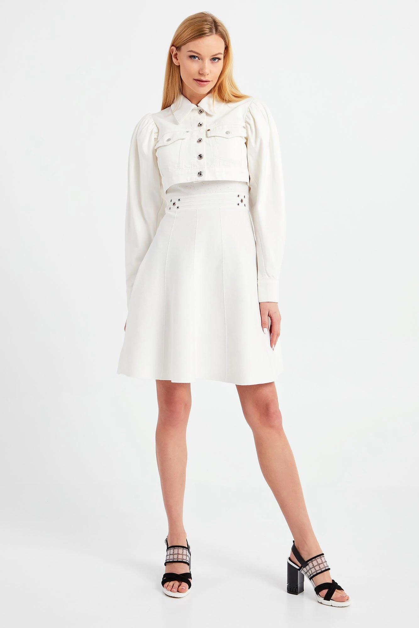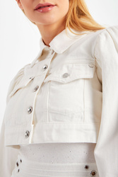Kurtka jeansowa w białym kolorze. Zapinana na srebrne guziki. Z przodu dwie kieszenie z patką, zapinane na srebrne napy. Fason cropped. Bufiaste rękawy zapinane na jeden guzik. Bardzo kobieca i fantazyjna.