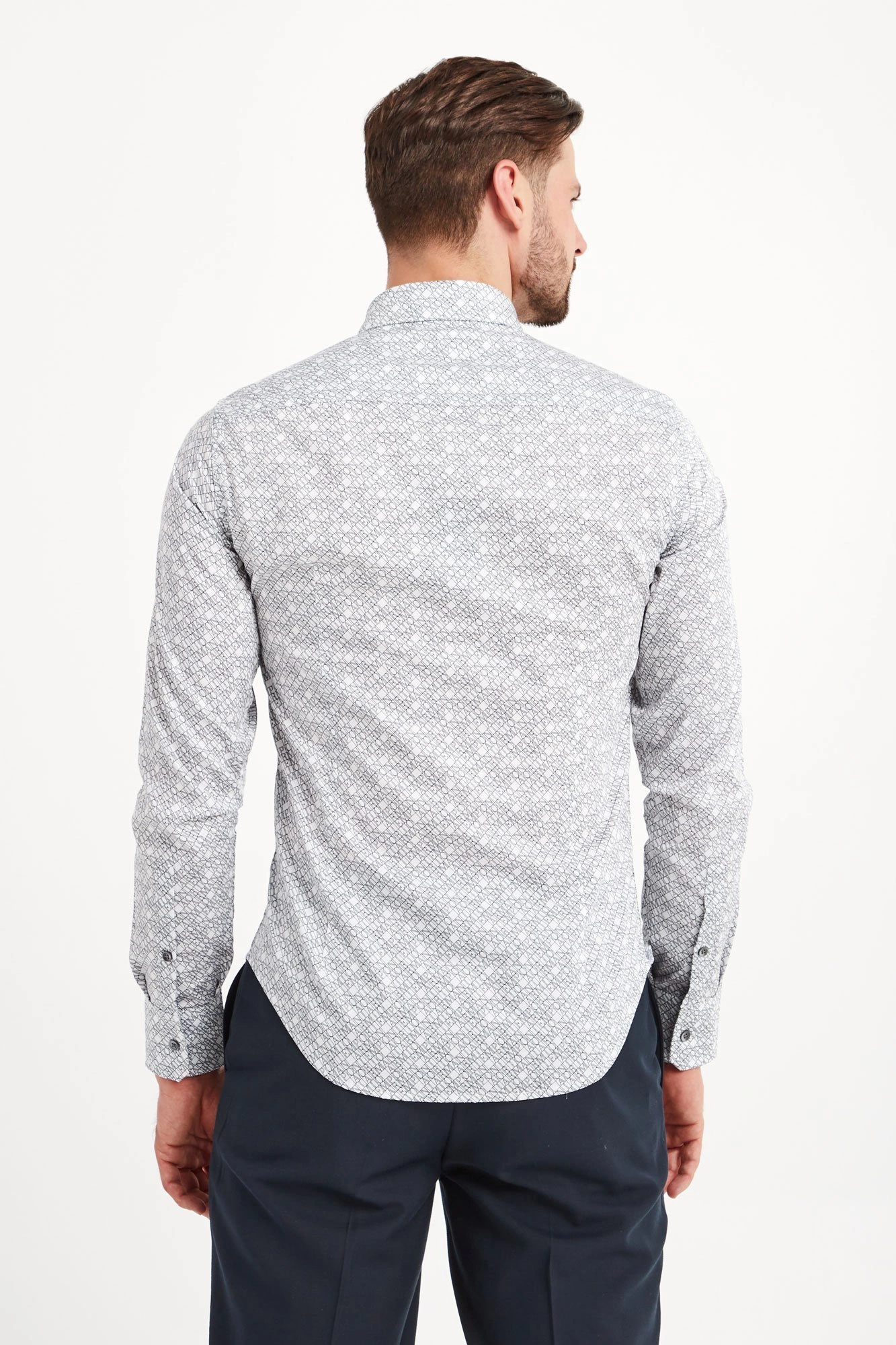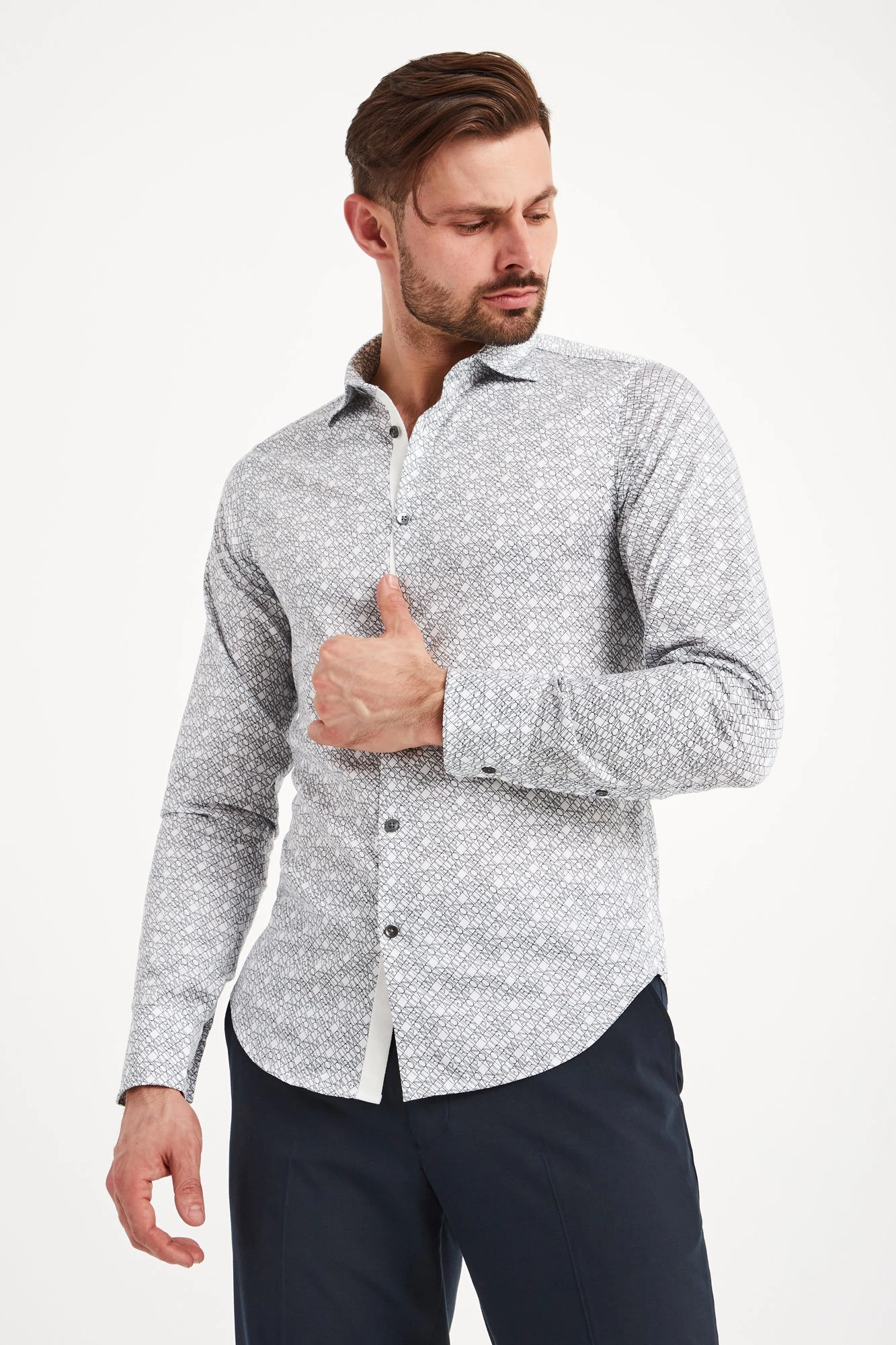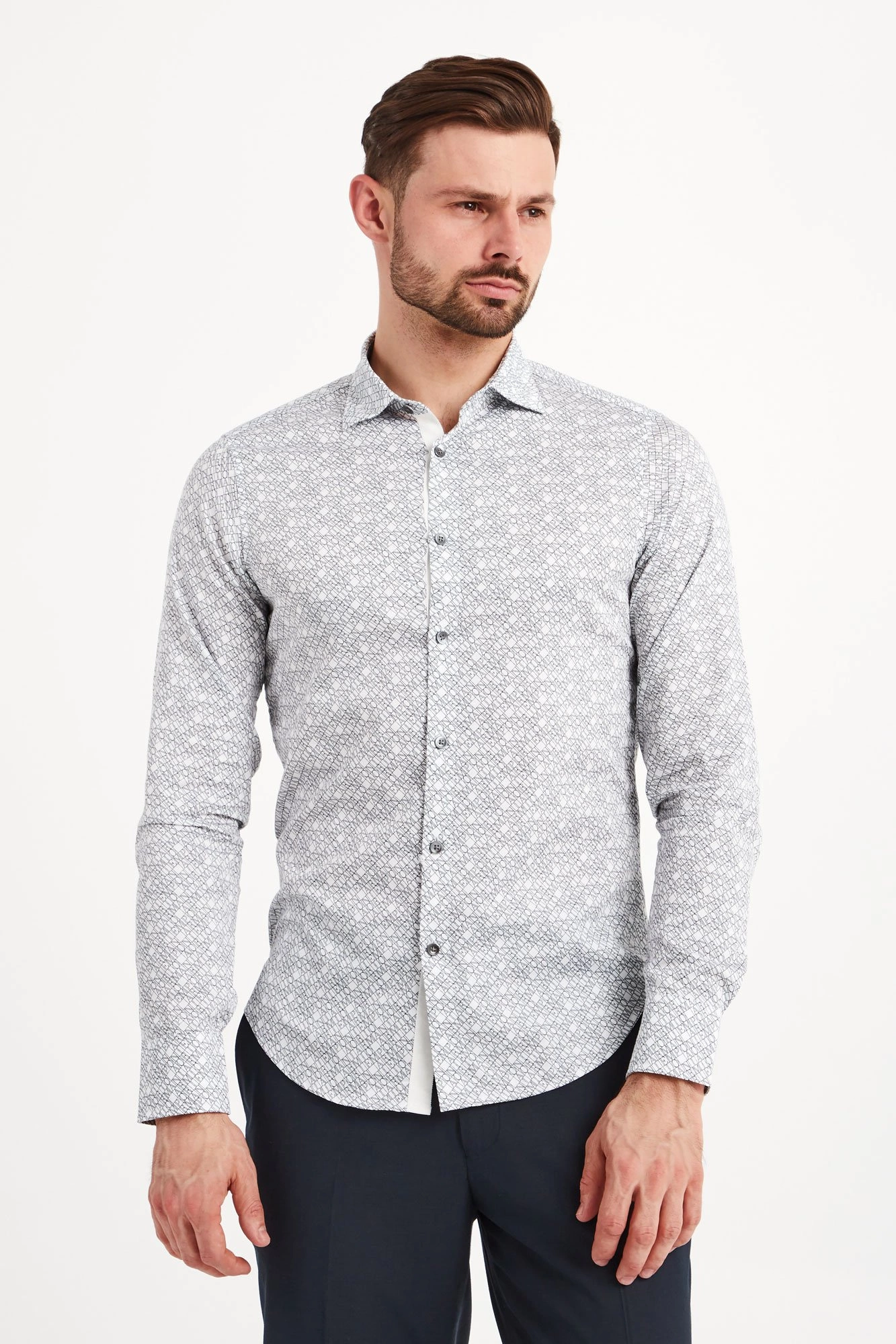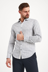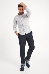 Biała koszula w czarny wzór nazwy marki. Fason slim fit. Zapinana na niewielkie guziki. Kołnierzyk włoski typu cutaway. Rękawy wykończone ściętym mankietem zapinanym na jeden guzik. Koszula wykonana z wysokiej jakości bawełny z dodatkiem elastanu.