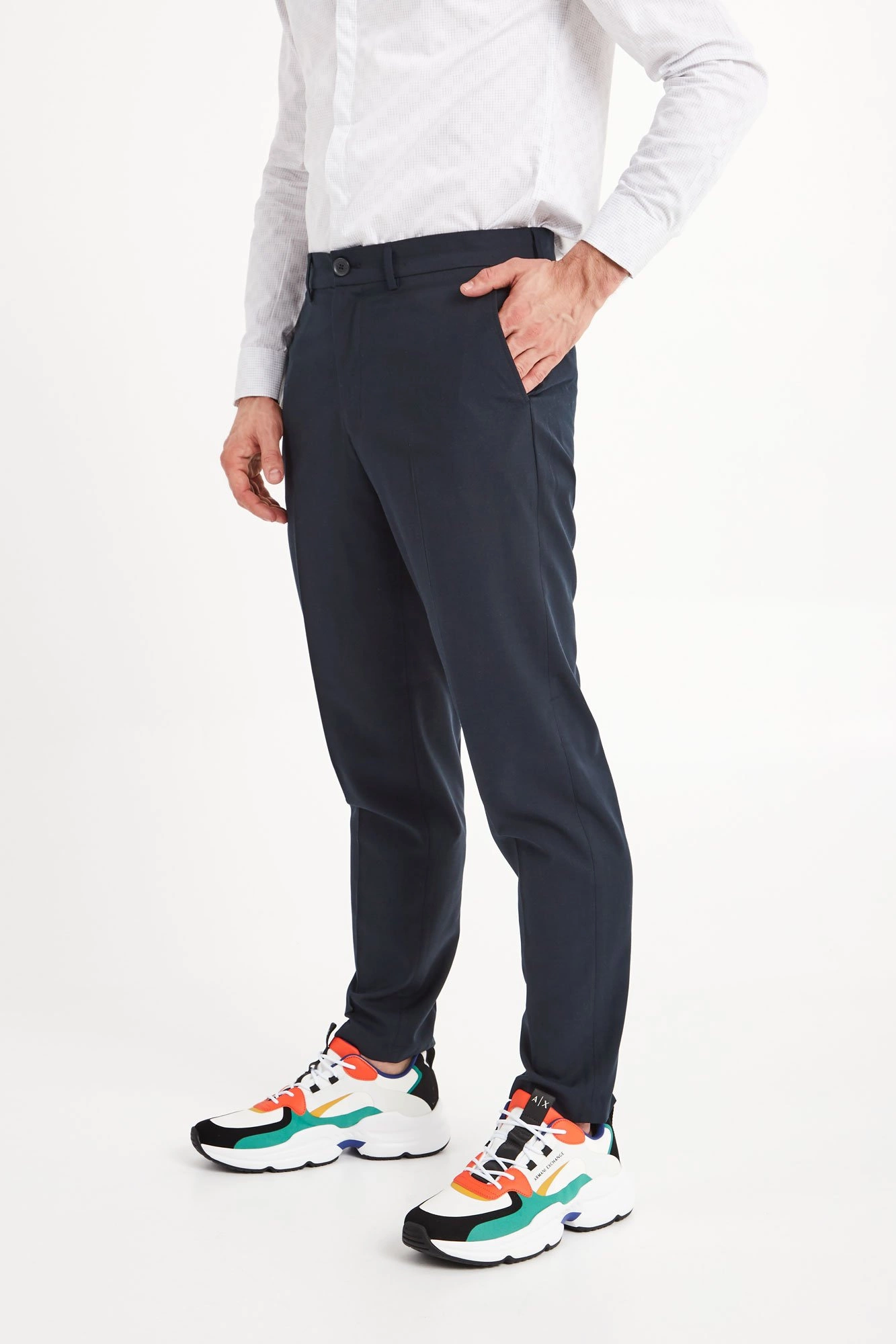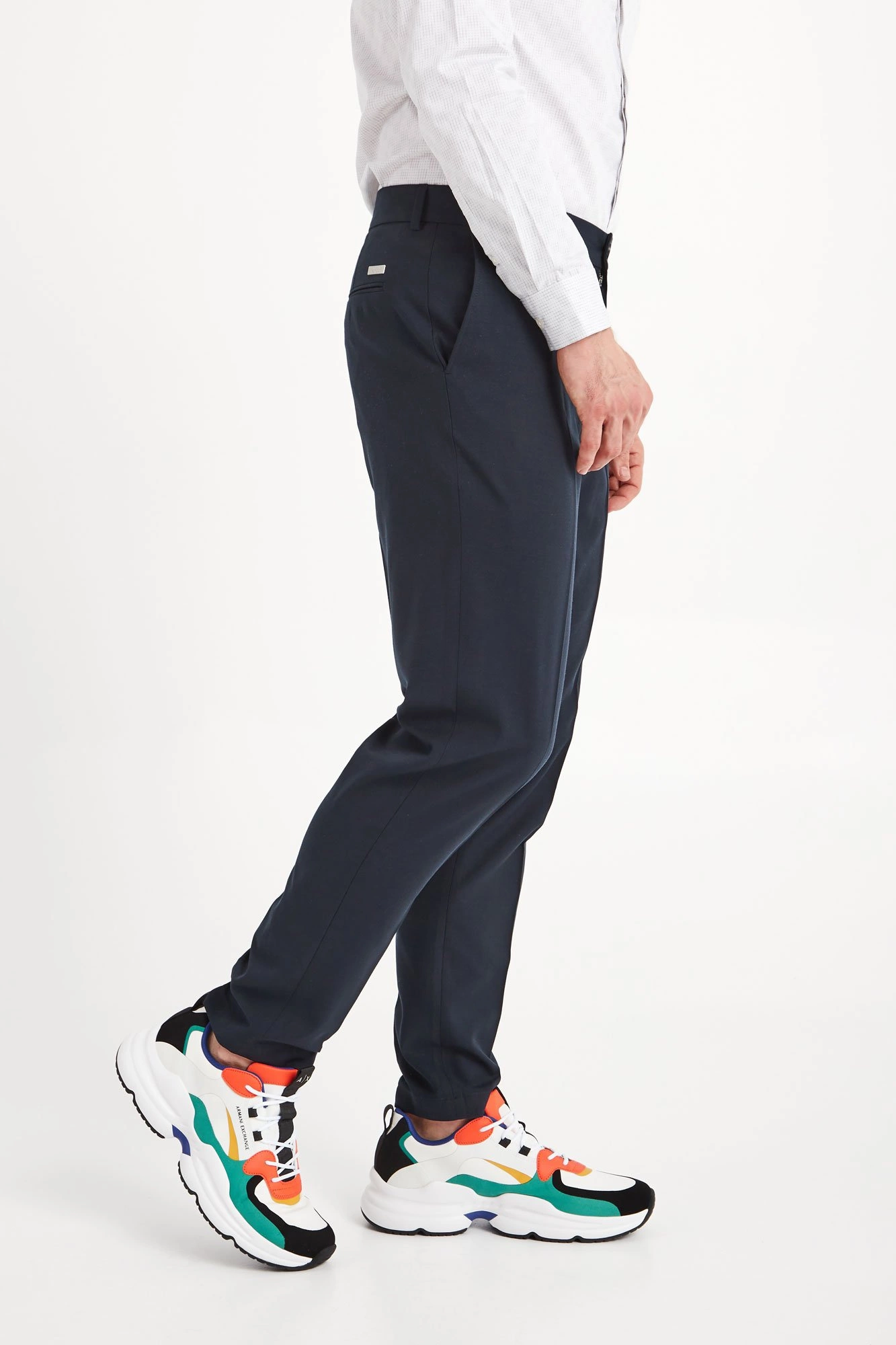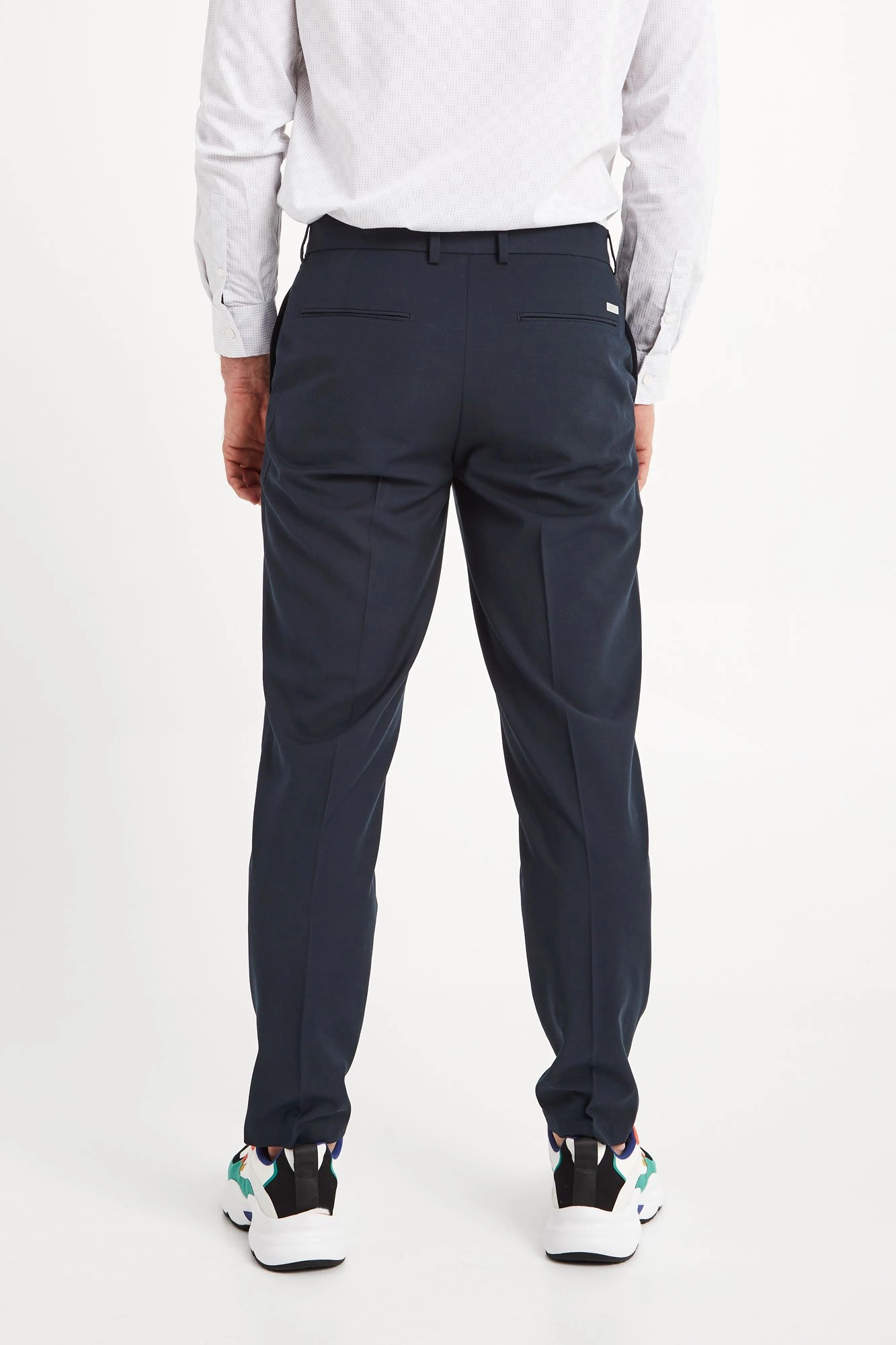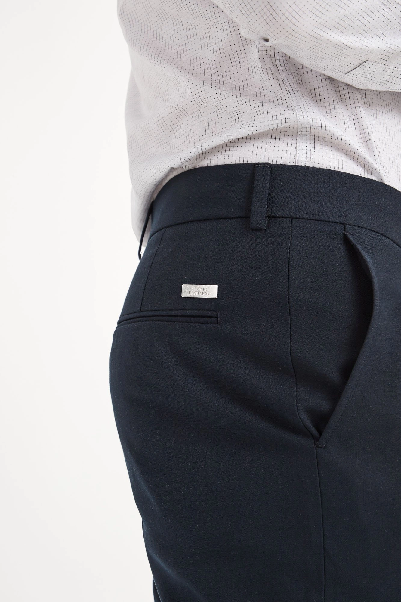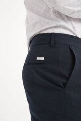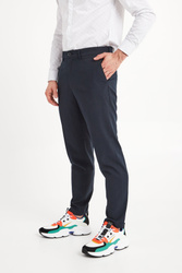 Klasyczne spodnie w granatowym kolorze. Zapinane na zamek i guzik. Model z czterema kieszeniami. Z tyłu metalowa aplikacja z nazwą marki. Nogawki z kantem, delikatnie zwężane. Spodnie wykonane z wysokiej jakości materiału z dodatkiem wiskozy. Eleganckie i ponadczasowe.