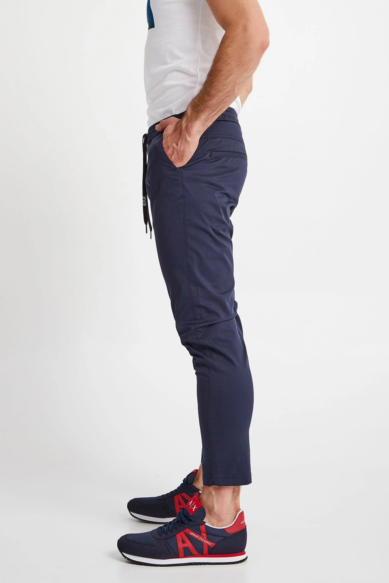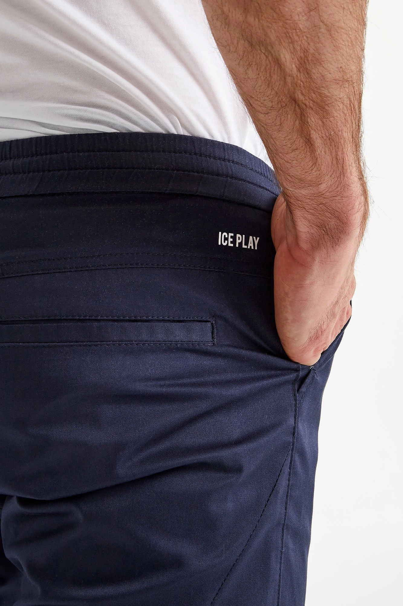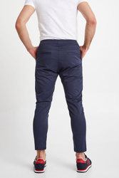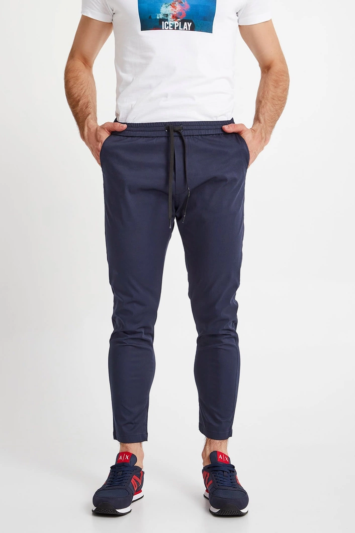 Spodnie marki Ice Play w kolorze granatowym. Fason slim fit. Pas elastyczny regulowany za pomocą troczków. Model z czterema kieszeniami. Nogawki dopasowane. Spodnie wykonane z wysokiej jakości bawełny z dodatkiem elastanu. Doskonały element garderoby w casualowym stylu.