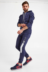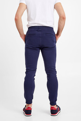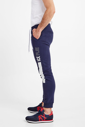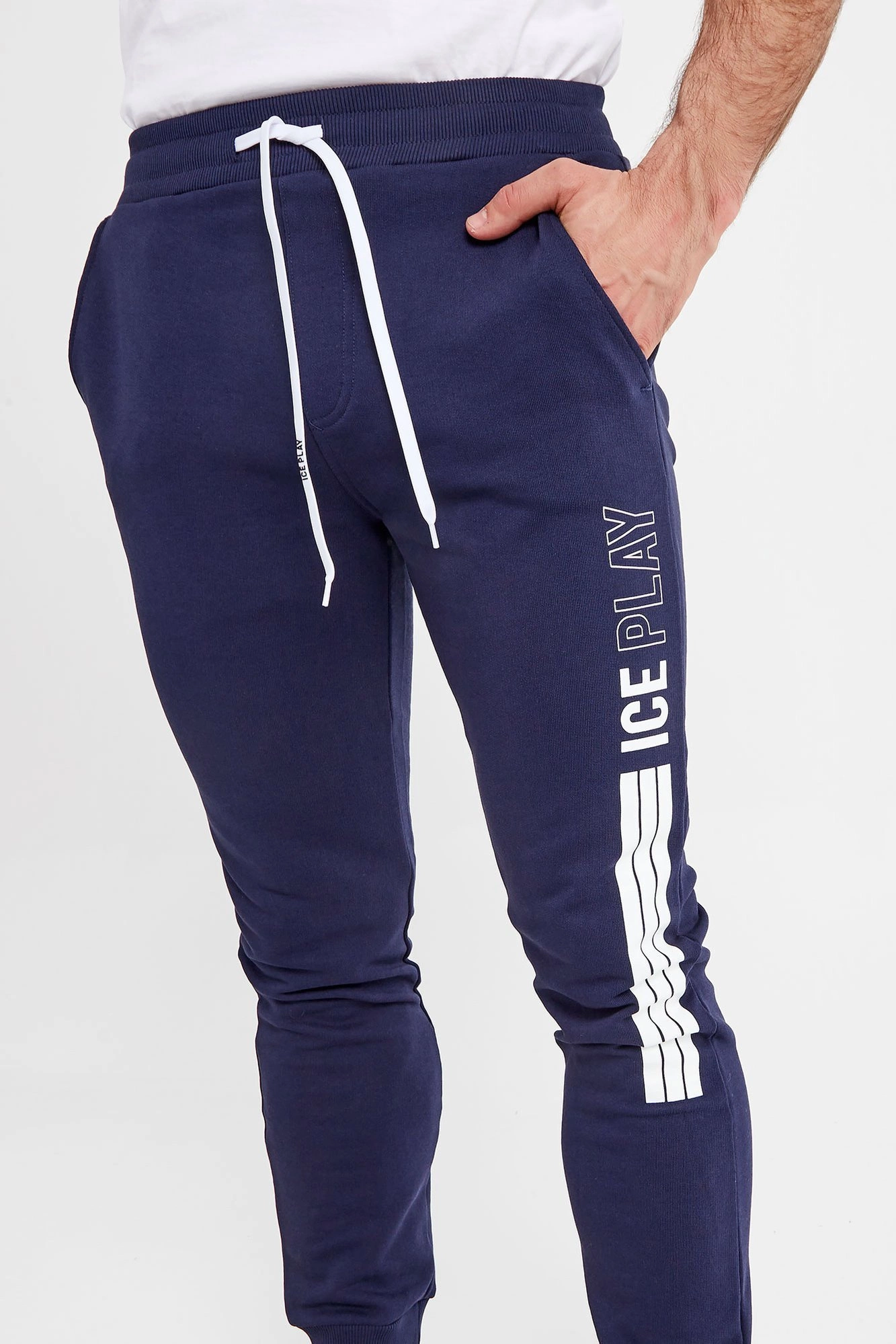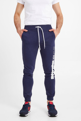 Spodnie dresowe marki Ice Play w granatowym kolorze. Pas elastyczny, regulowany za pomocą troczków z nadrukowaną nazwą marki. Model z czterema kieszeniami. Nogawki wykończone ściągaczem. Na lewej duży kontrastowy nadruk z nazwą marki. Spodnie bardzo komfortowe i przyjemne w dotyku.